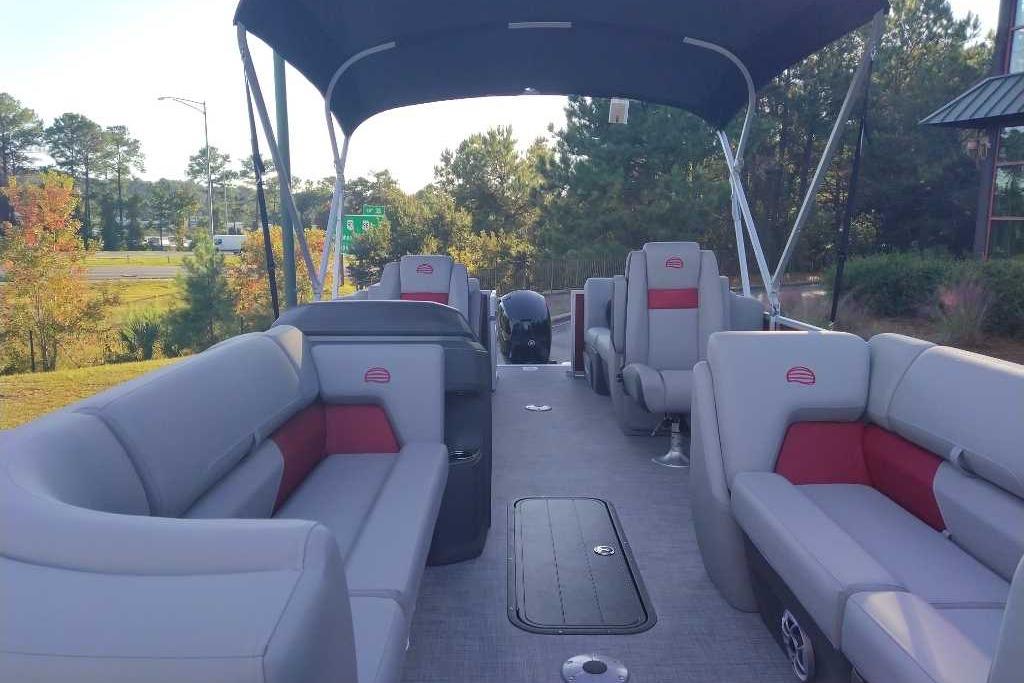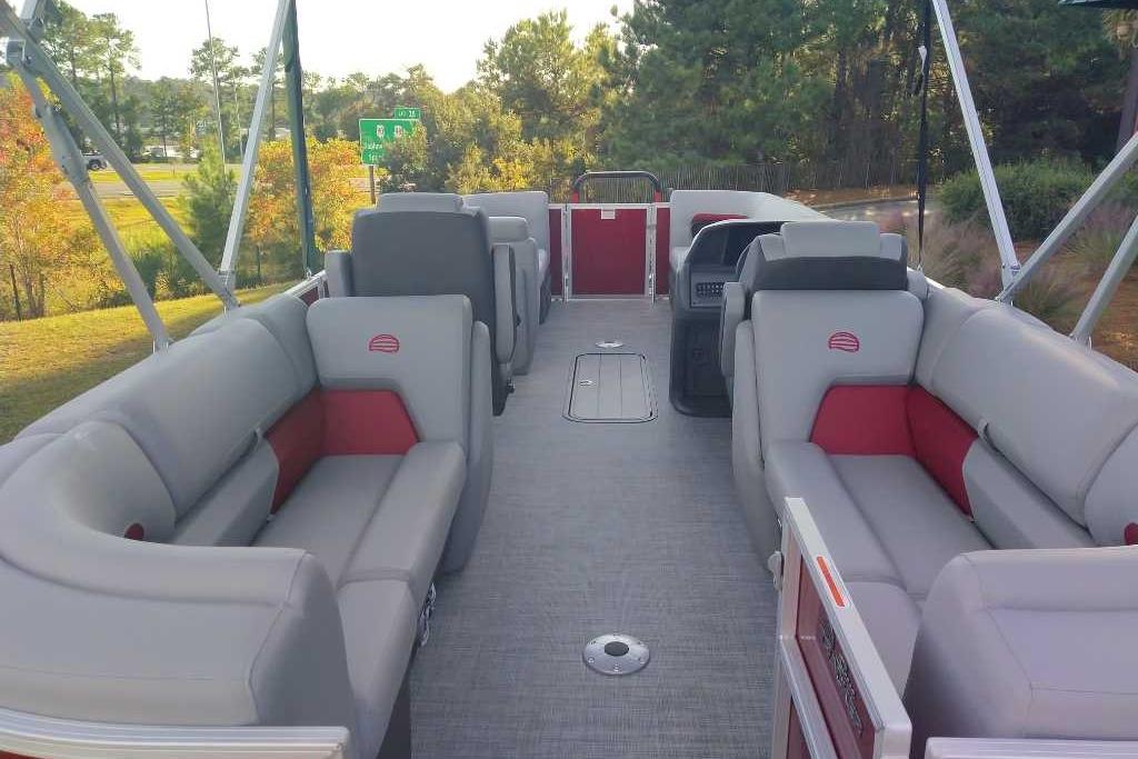 This year's 22 XP3 has an all-new interior has some exciting new features, including backrest cubbies that increase storage space and add extra cupholders that can keep larger bottles out of the way. The couches have bright accents that match the fence colors for an extra splash of style. The driver's console also got a big facelift with upgraded tech, making the PARTY BARGE the best-looking pontoon on the lake.