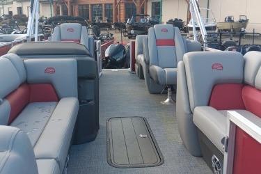 This year's 22 XP3 has an all-new interior has some exciting new features, including backrest cubbies that increase storage space and add extra cupholders that can keep larger bottles out of the way. The couches have bright accents that match the fence colors for an extra splash of style. The driver's console also got a big facelift with upgraded tech, making the PARTY BARGE the best-looking pontoon on the lake.