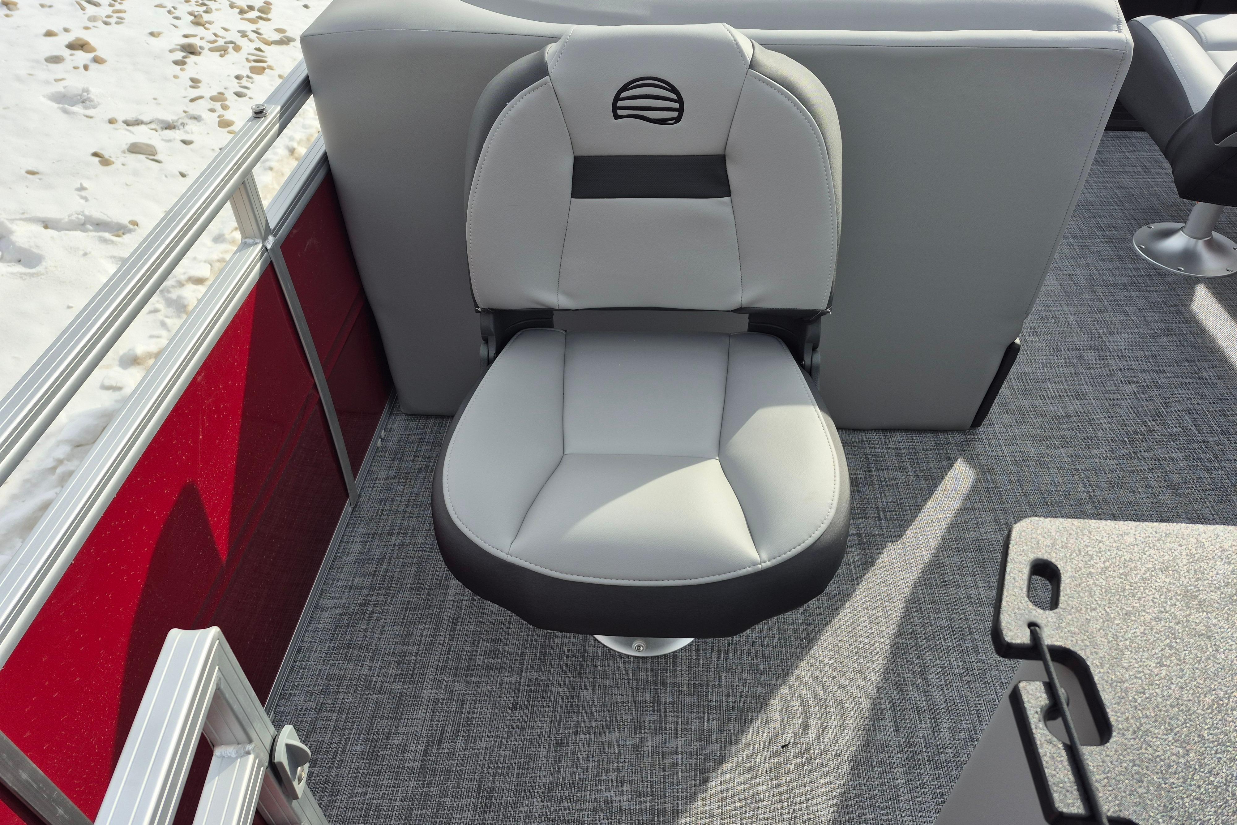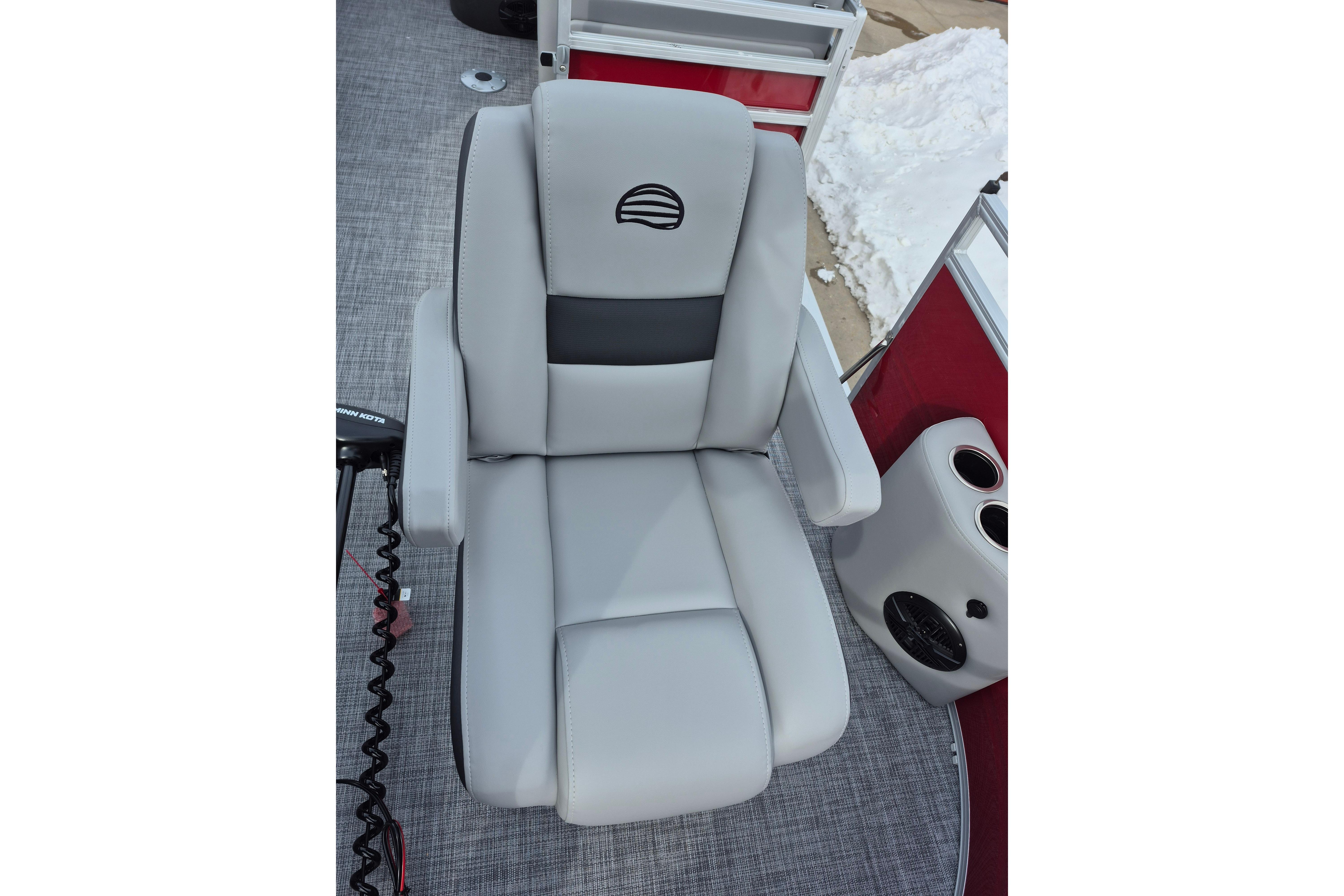 • Reclining, high-back swiveling helm bucket seat w/self-leveling armrests