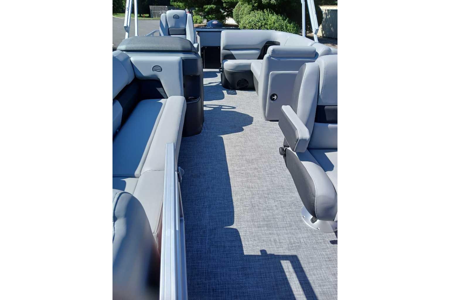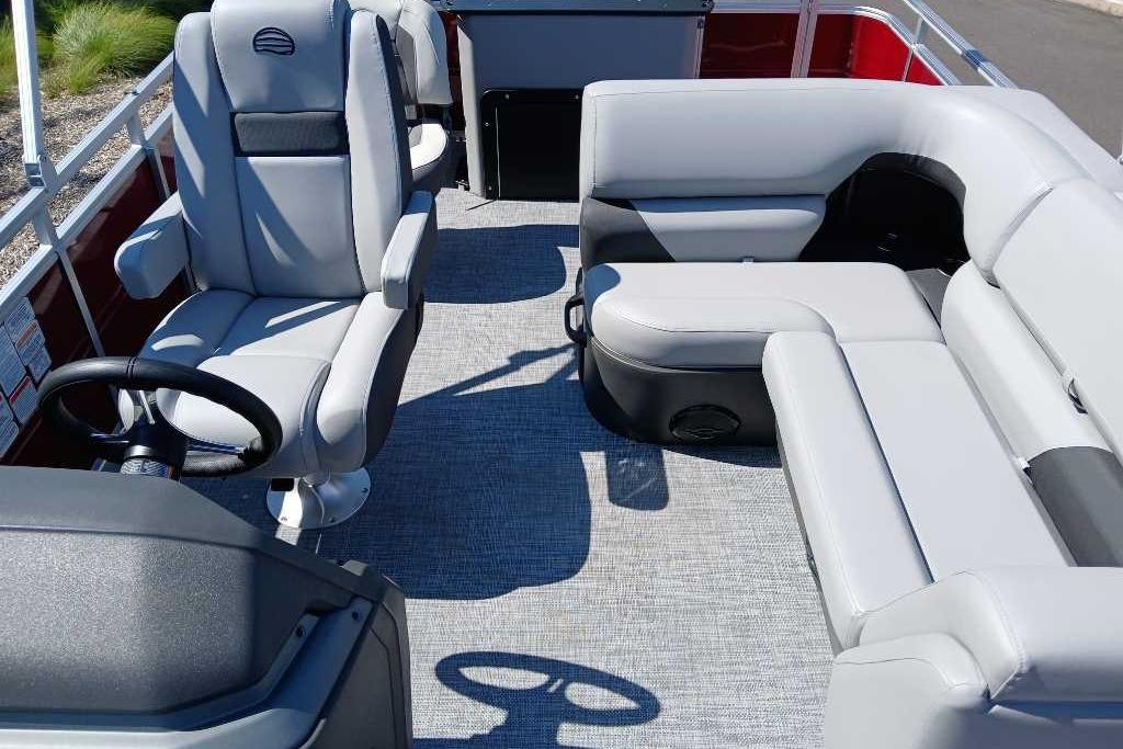 The party for up to 10 people starts with the dual long lounges that boast STOW MORE™ compartments for packing and securing supplies. The 2026 model adds a new, wider ladder that makes reboarding easier. The new year also brings cut-out sections in the backrests that give you more cupholders and space for gear. For the anglers, there are swiveling pedestal fishing chairs on both ends of the pontoon and an 8-gal. aerated livewell complete with a rod holder and a composite lid with an integrated fish ruler.