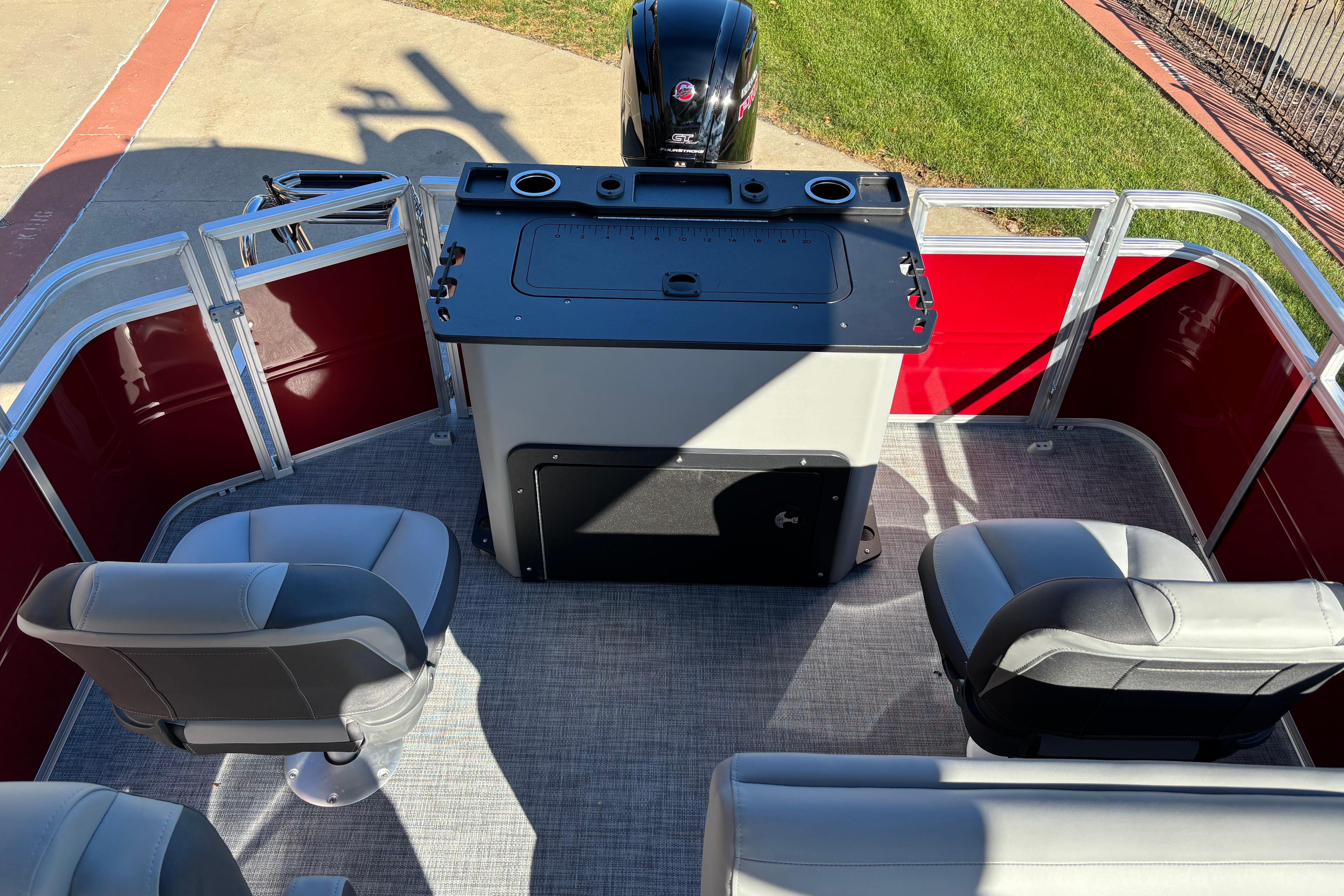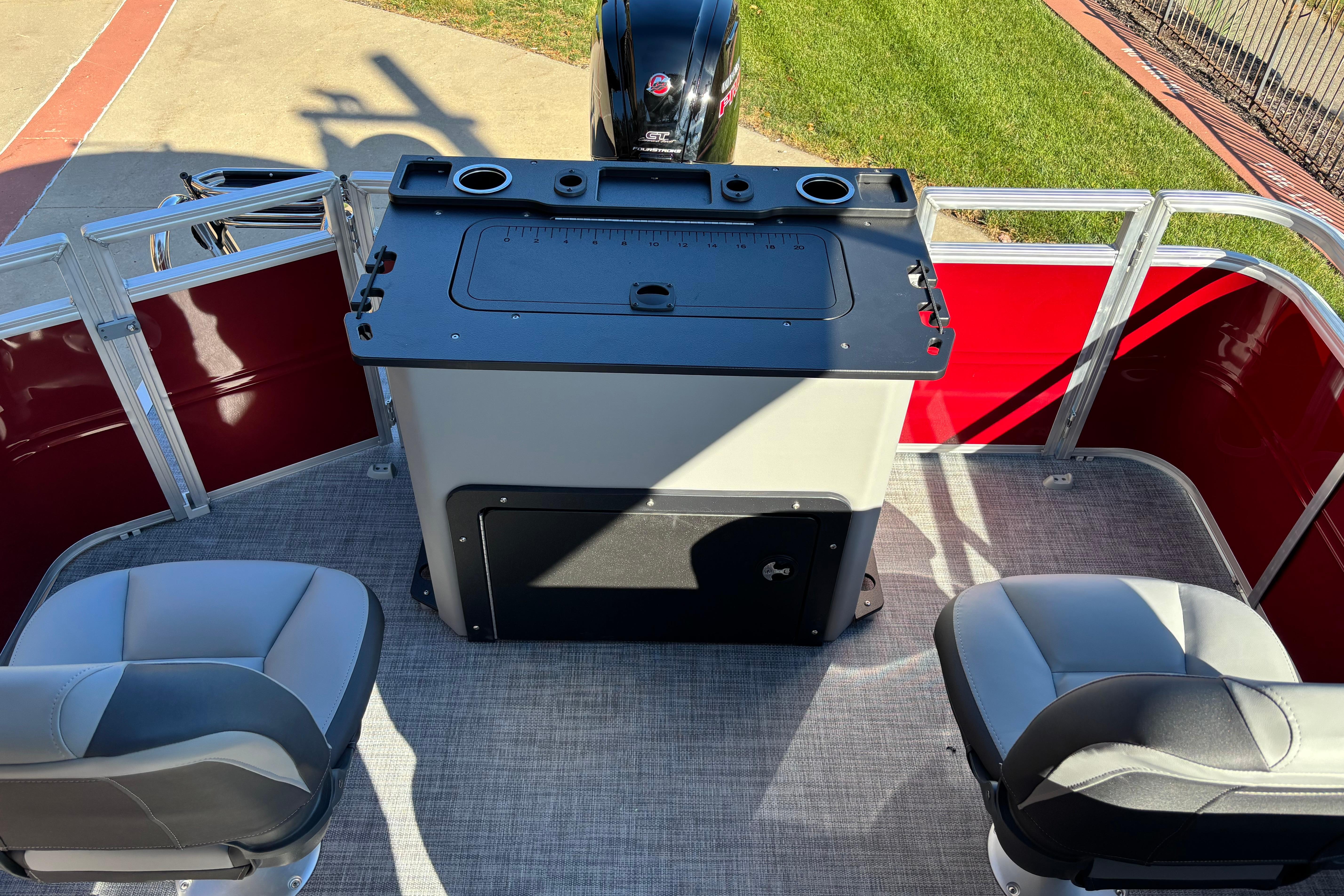 The party for up to 10 people starts with the dual long lounges that boast STOW MORE™ compartments for packing and securing supplies. The 2026 model adds a new, wider ladder that makes reboarding easier. The new year also brings cut-out sections in the backrests that give you more cupholders and space for gear. For the anglers, there are swiveling pedestal fishing chairs on both ends of the pontoon and an 8-gal. aerated livewell complete with a rod holder and a composite lid with an integrated fish ruler.