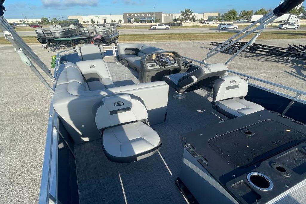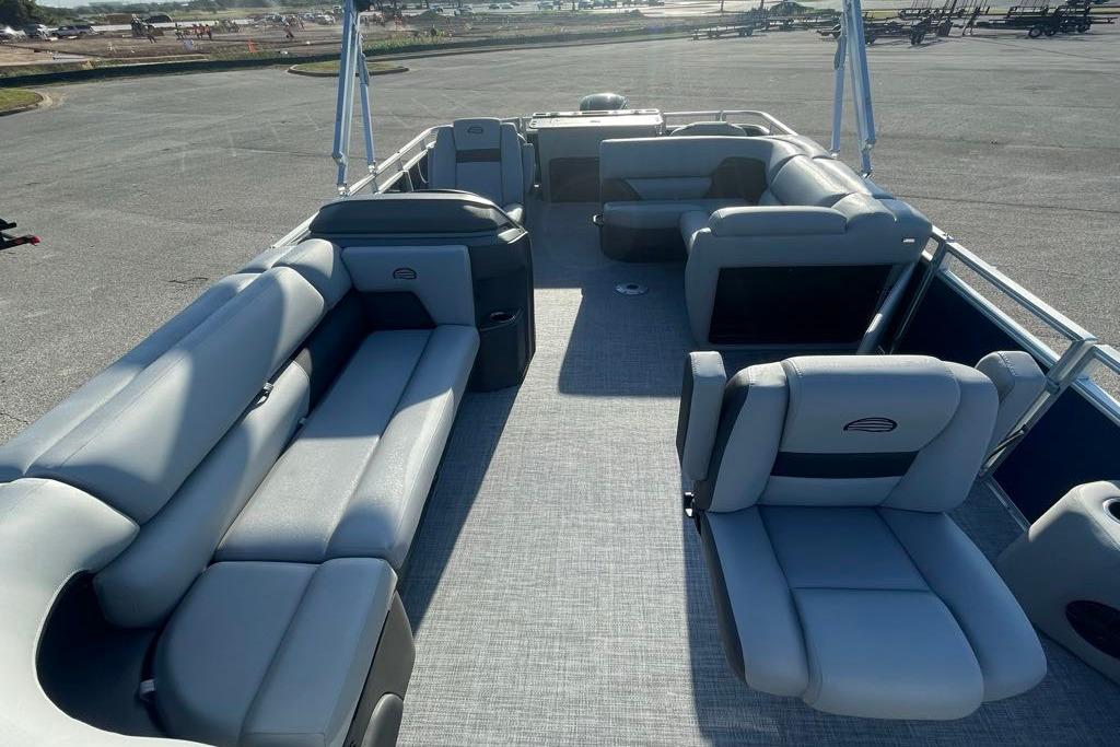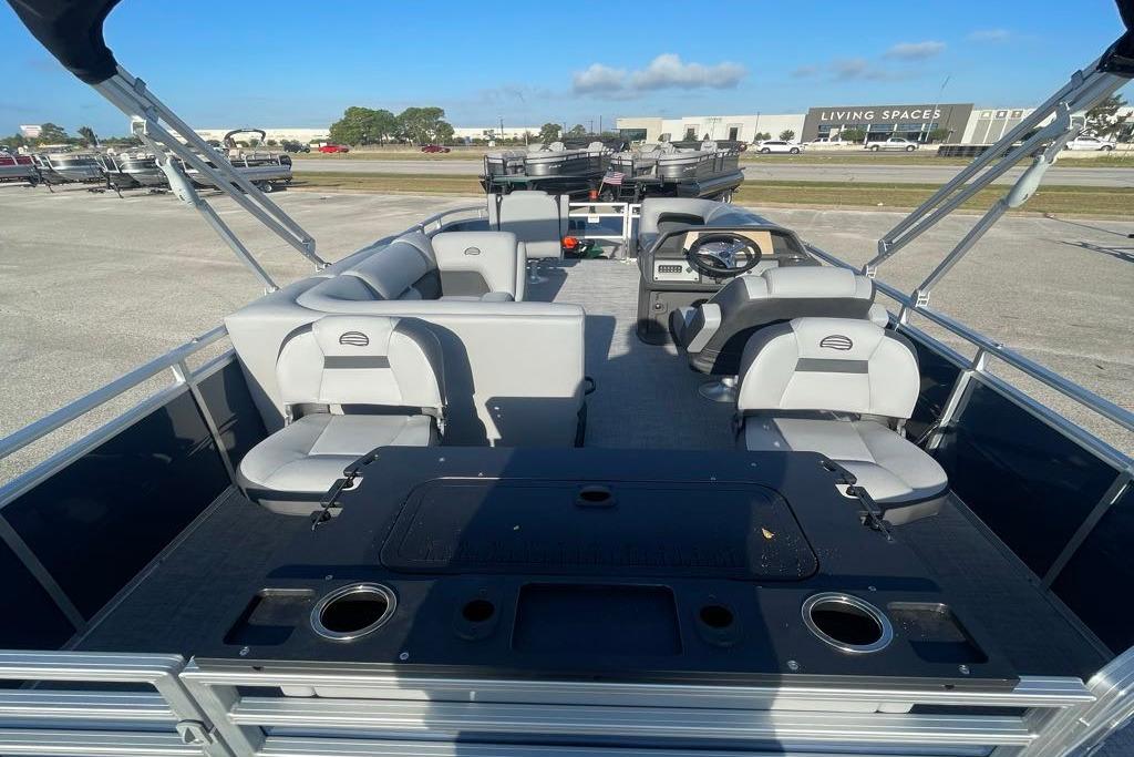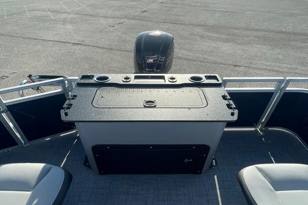 The party for up to 10 people starts with the dual lounges that boast STOW MORE™ compartments for packing and securing supplies. The 2026 model adds a new, wider ladder that makes reboarding easier. The new year also brings cut-out sections in the backrests that give you more cupholders and space for gear. For the anglers, there are swiveling pedestal fishing chairs on both ends of the pontoon and an 8-gal. aerated livewell complete with a rod holder and a composite lid with an integrated fish ruler.