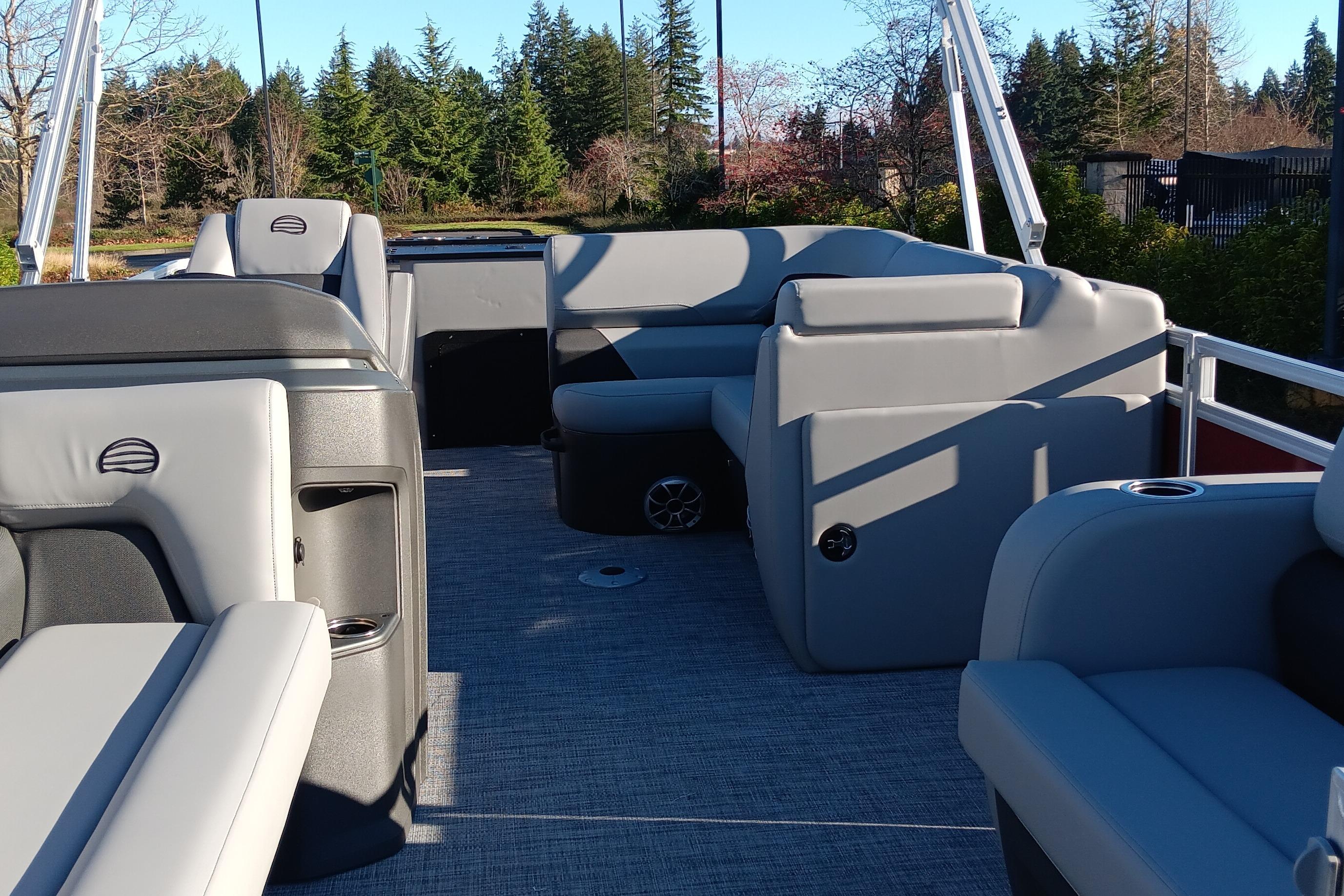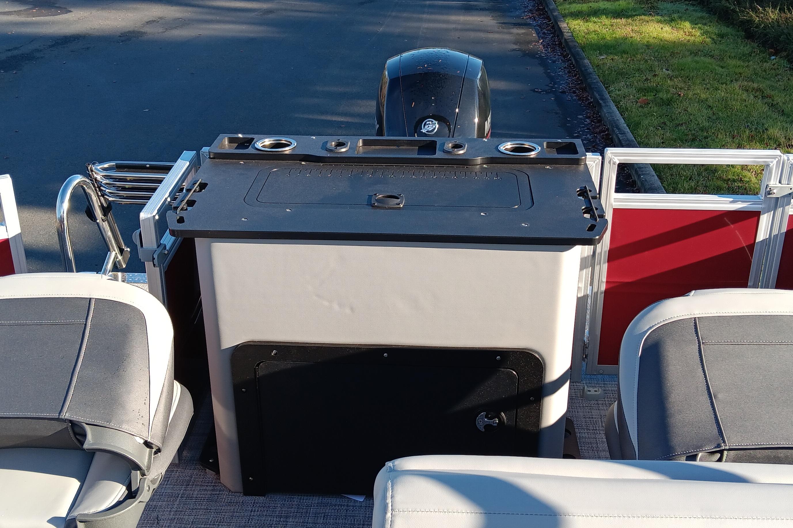 This is the fishing pontoon the whole family can enjoy. This SPORTFISH introduces a third lounge and pushes back the second casting chair to the aft casting deck. The 22 DLX also introduces a lockable rod box that can fit up to six rods. The 2026 model year brings some fine-tuned changes, including a wider boarding ladder, open storage spaces with cupholders built into the seatbacks, and more.