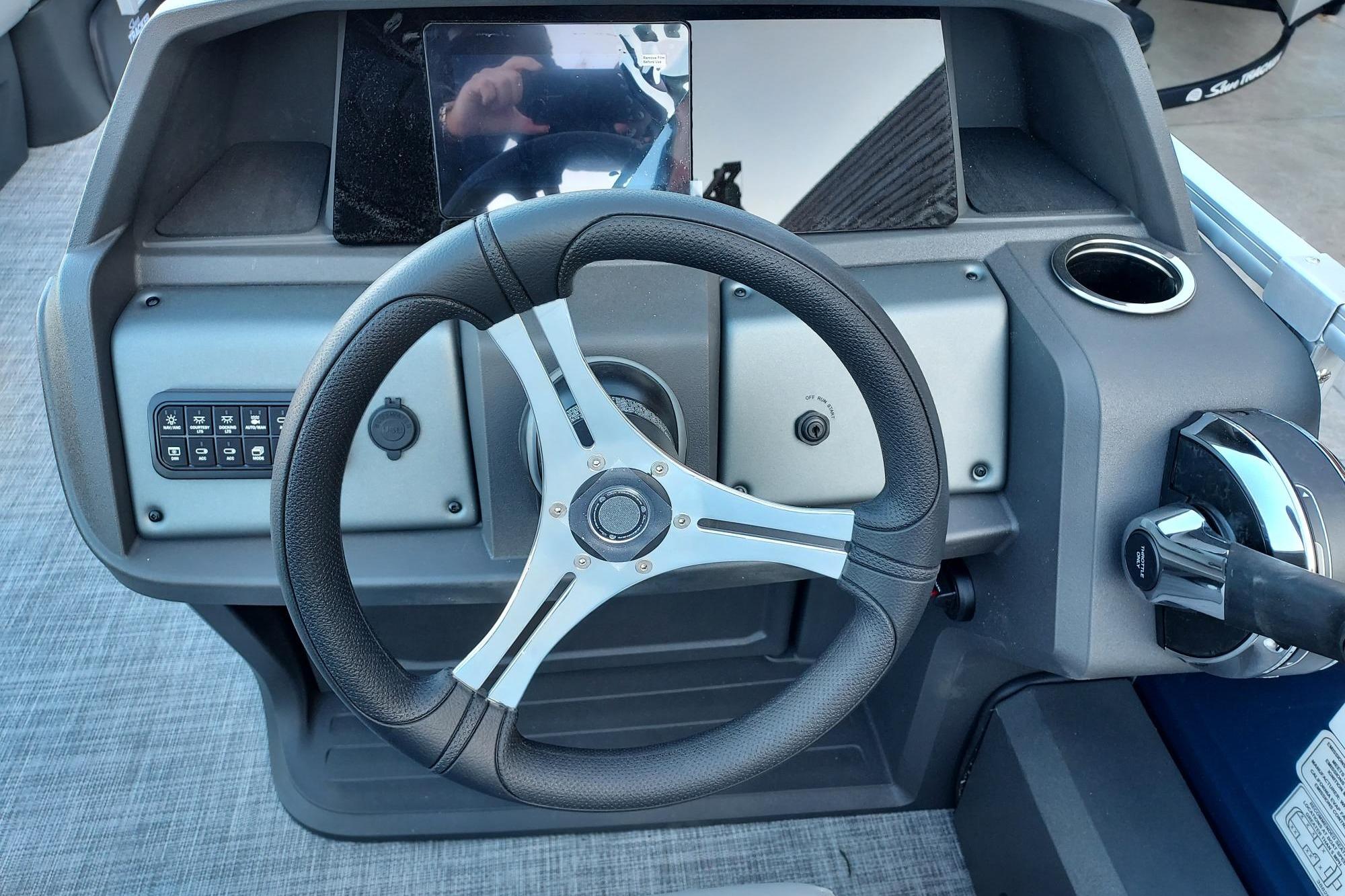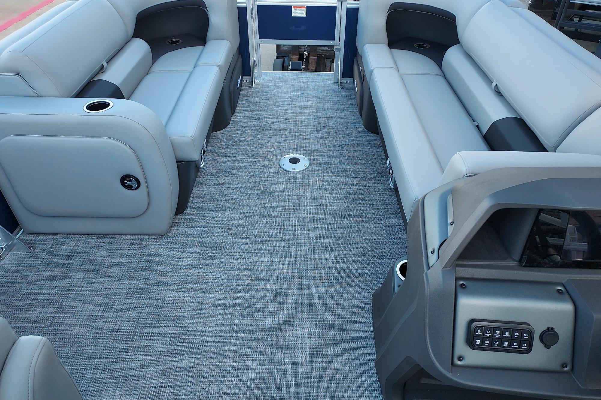 This is the fishing pontoon the whole family can enjoy. This SPORTFISH introduces a third lounge and pushes back the second casting chair to the aft casting deck. The 22 DLX also introduces a lockable rod box that can fit up to six rods. The 2026 model year brings some fine-tuned changes, including a wider boarding ladder, open storage spaces with cupholders built into the seatbacks, and more.