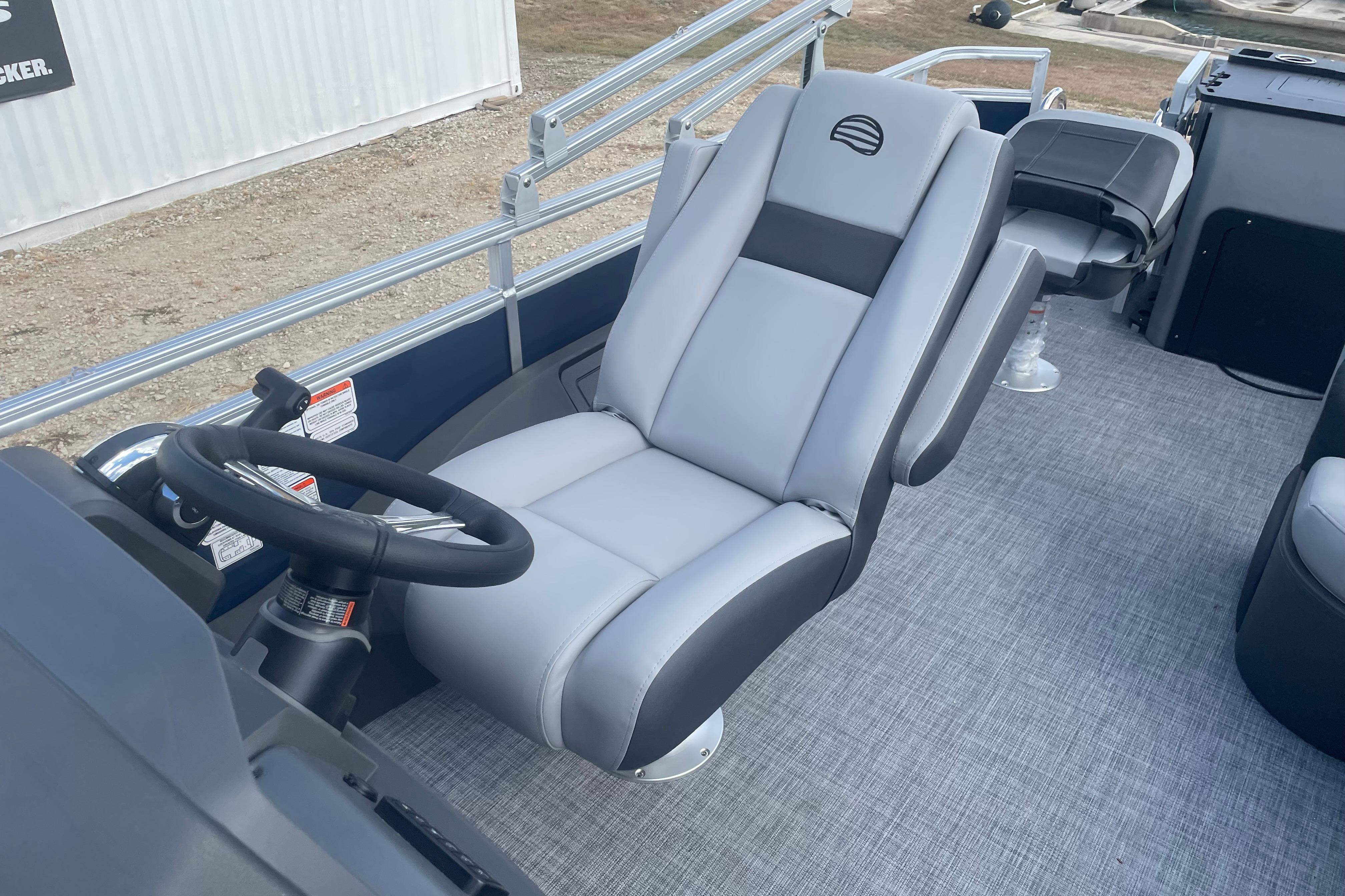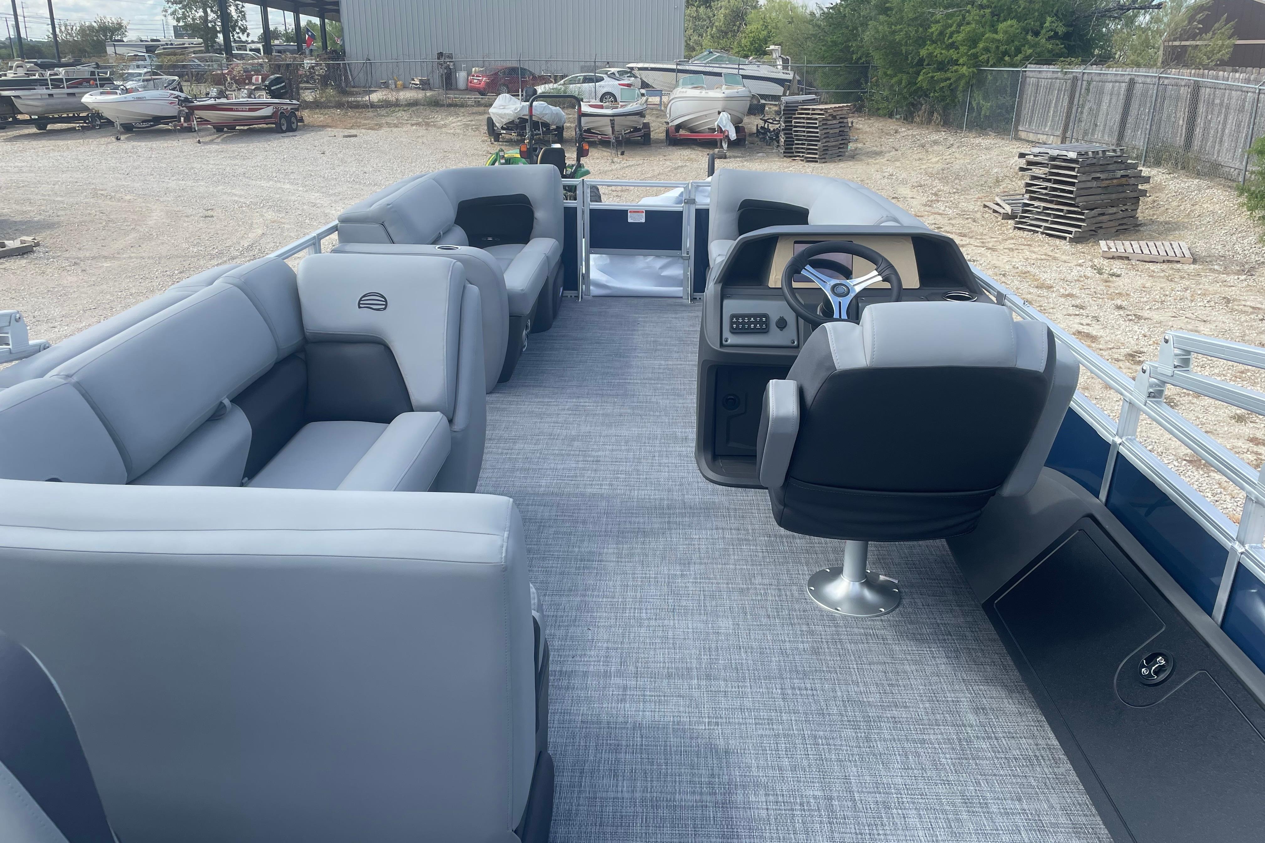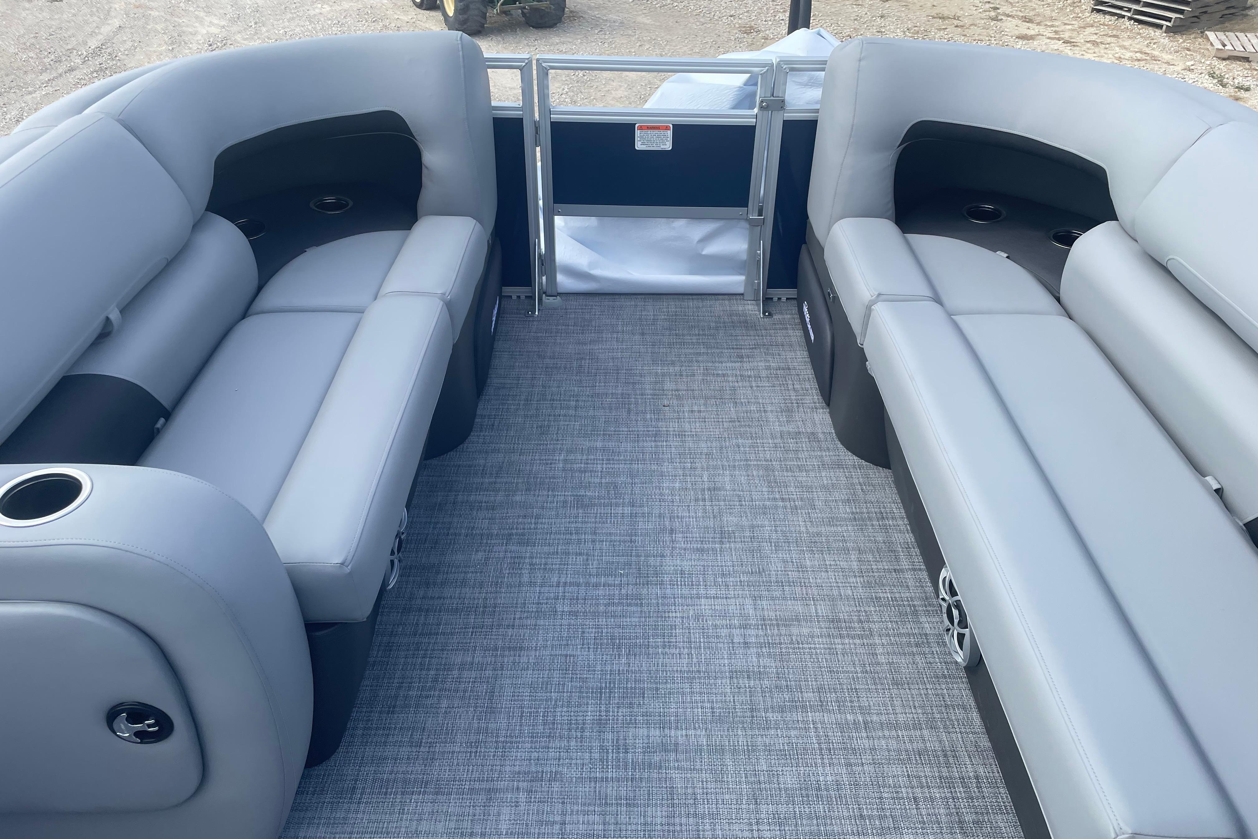 This is the fishing pontoon the whole family can enjoy. This SPORTFISH introduces a third lounge and pushes back the second casting chair to the aft casting deck. The 22 DLX also introduces a lockable rod box that can fit up to six rods. The 2026 model year brings some fine-tuned changes, including a wider boarding ladder, open storage spaces with cupholders built into the seatbacks, and more.