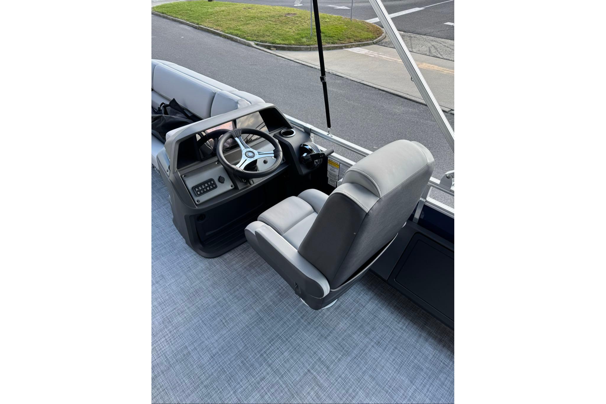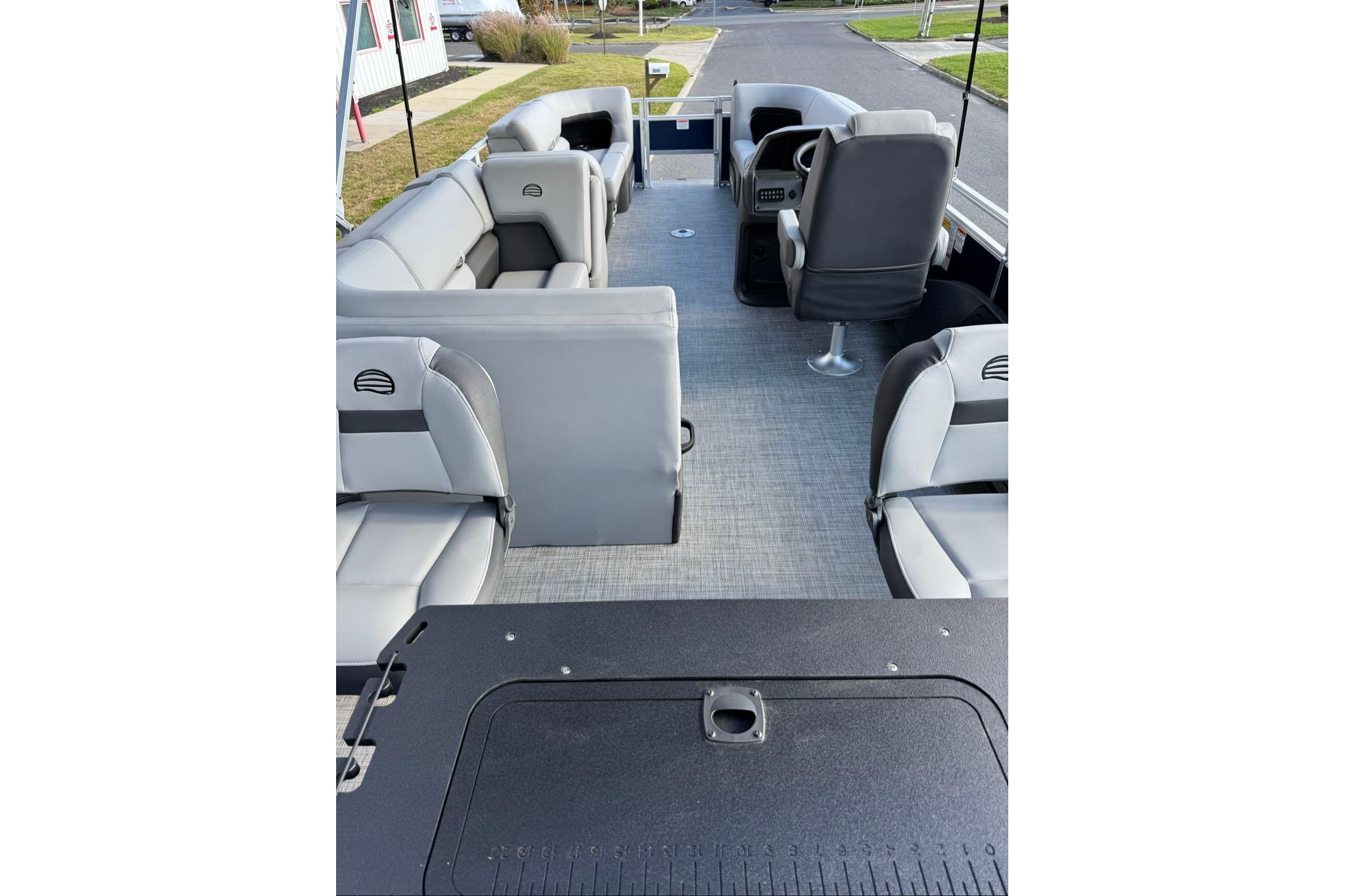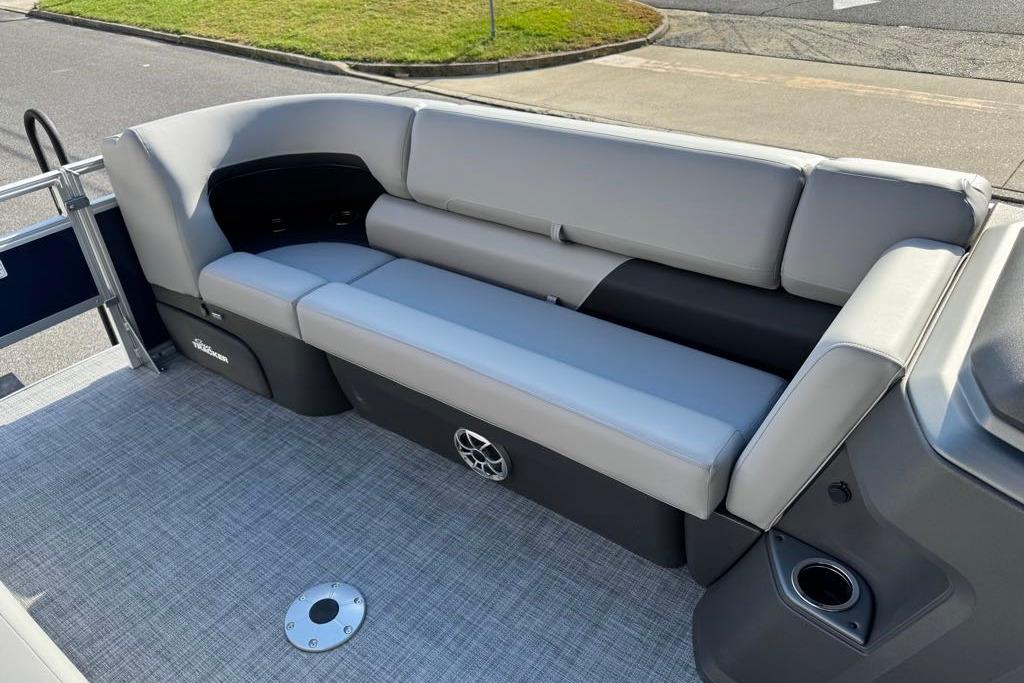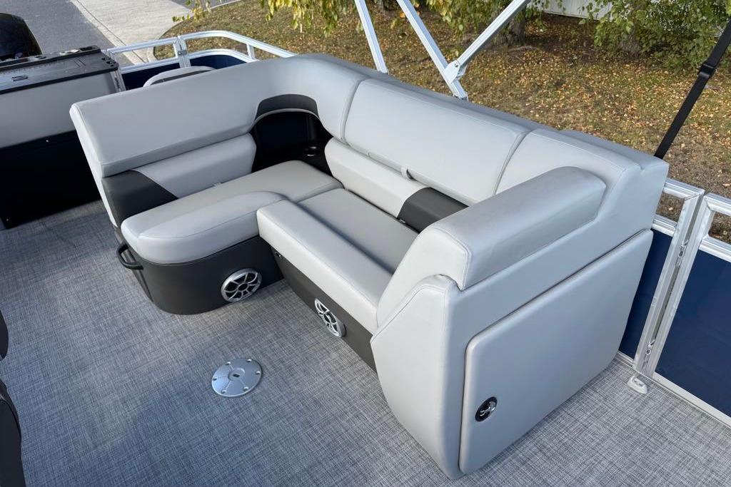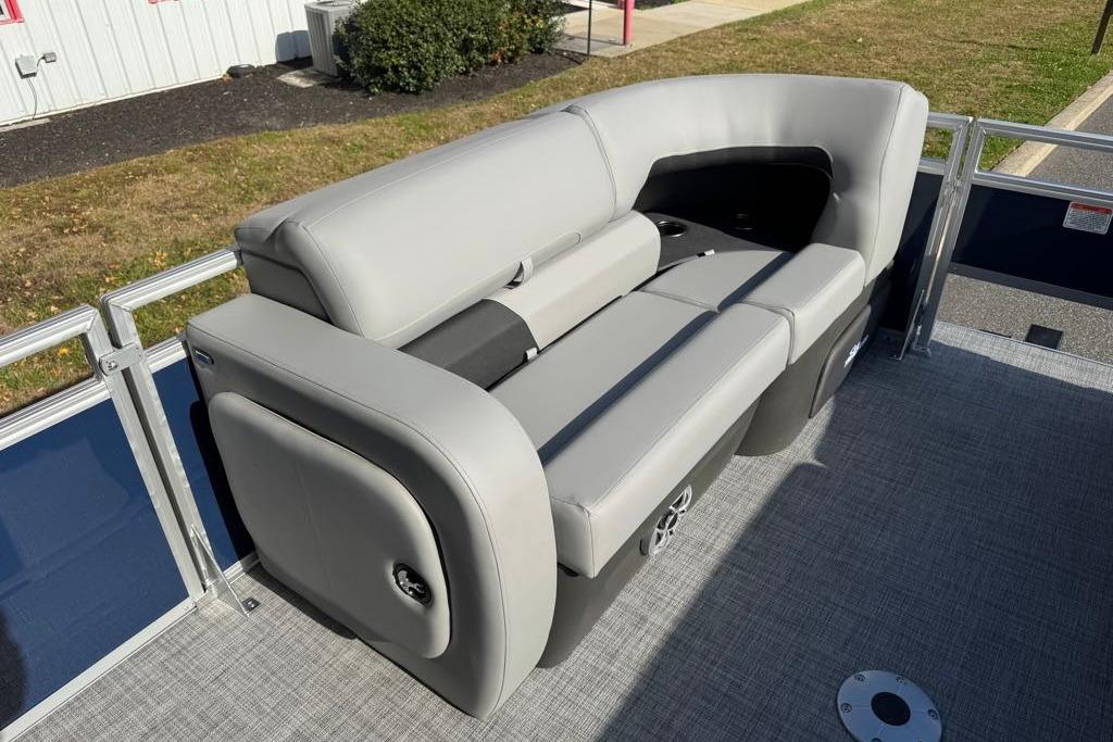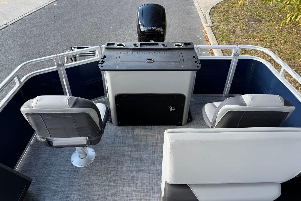 This is the fishing pontoon the whole family can enjoy. This SPORTFISH introduces a third lounge and pushes back the second casting chair to the aft casting deck. The 22 DLX also introduces a lockable rod box that can fit up to six rods. The 2026 model year brings some fine-tuned changes, including a wider boarding ladder, open storage spaces with cupholders built into the seatbacks, and more.