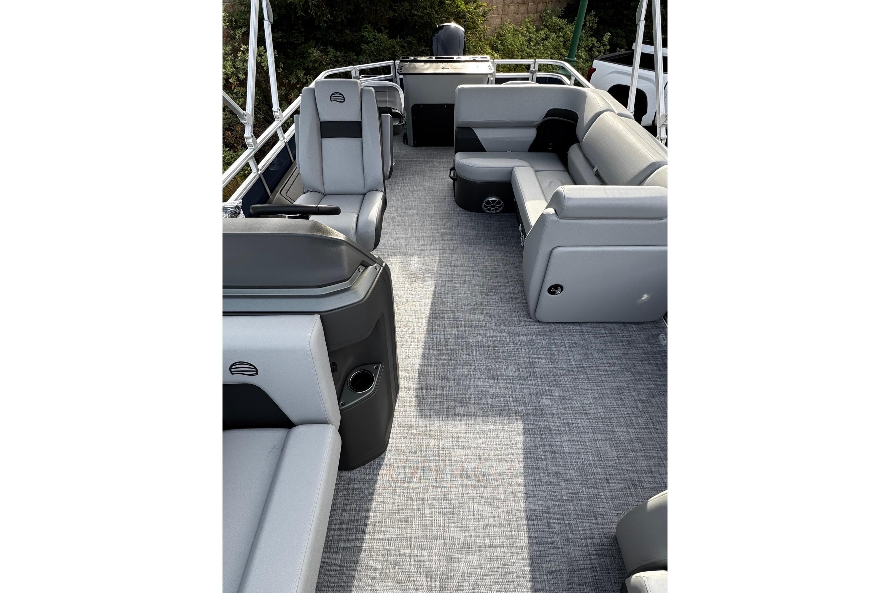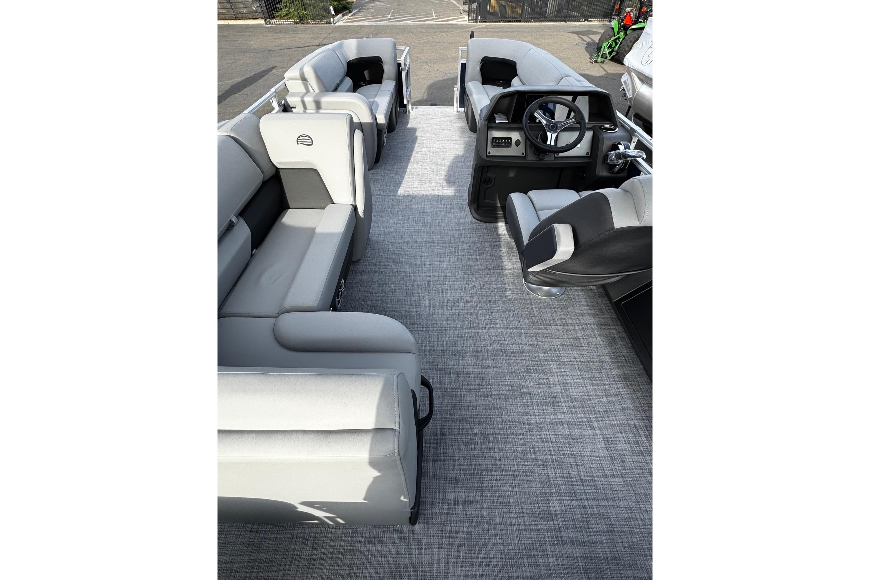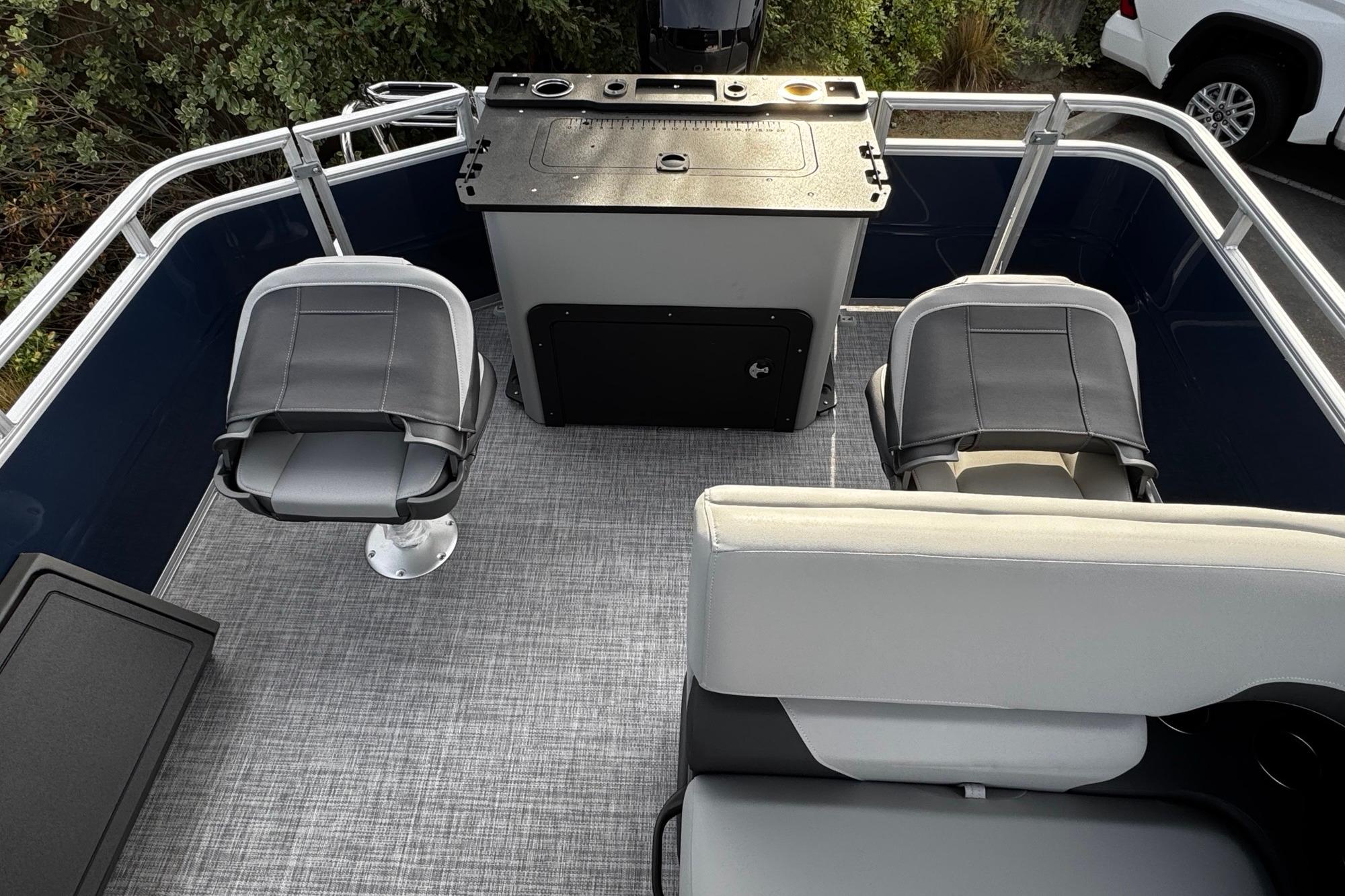 This is the fishing pontoon the whole family can enjoy. This SPORTFISH introduces a third lounge and pushes back the second casting chair to the aft casting deck. The 22 DLX also introduces a lockable rod box that can fit up to six rods. The 2026 model year brings some fine-tuned changes, including a wider boarding ladder, open storage spaces with cupholders built into the seatbacks, and more.