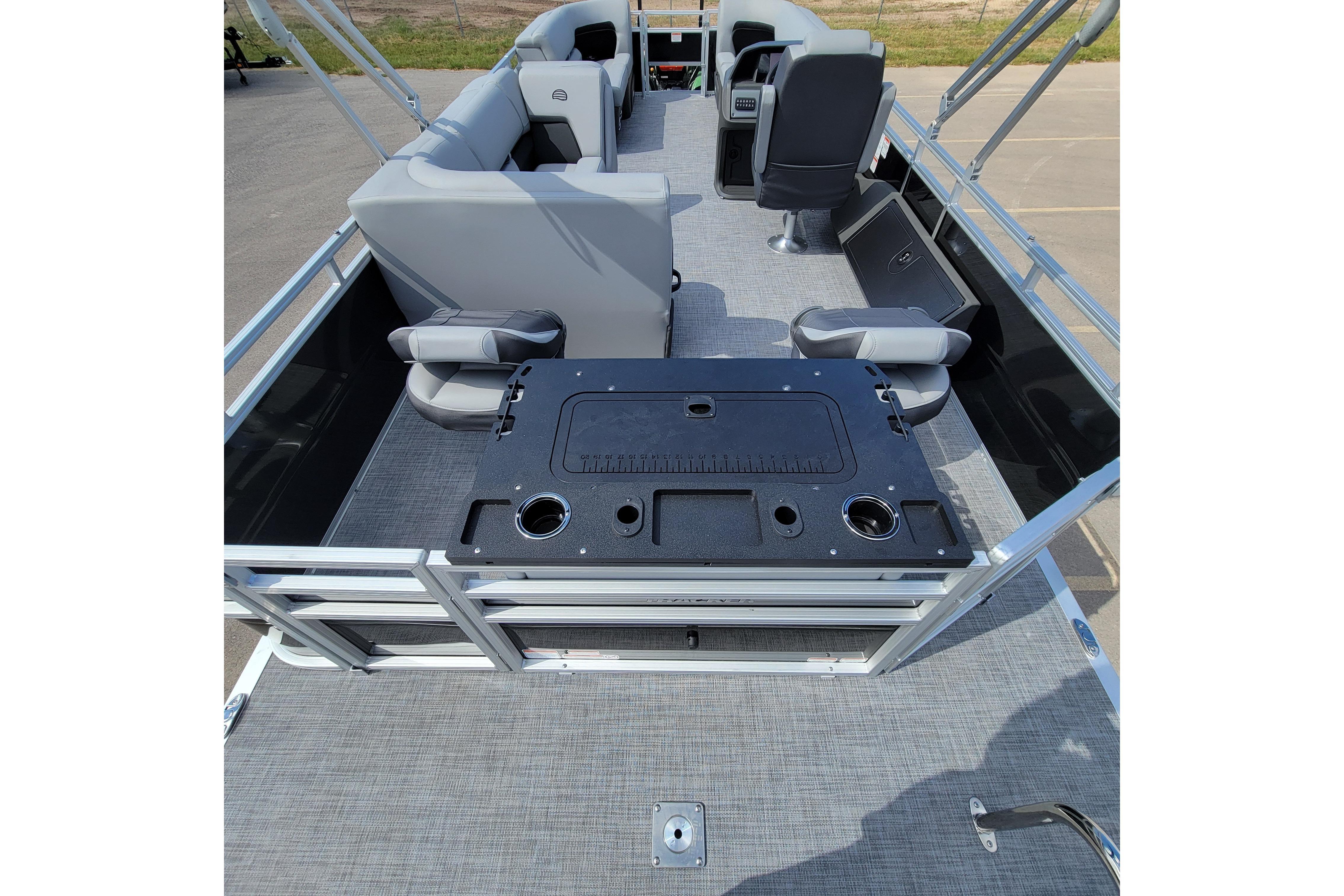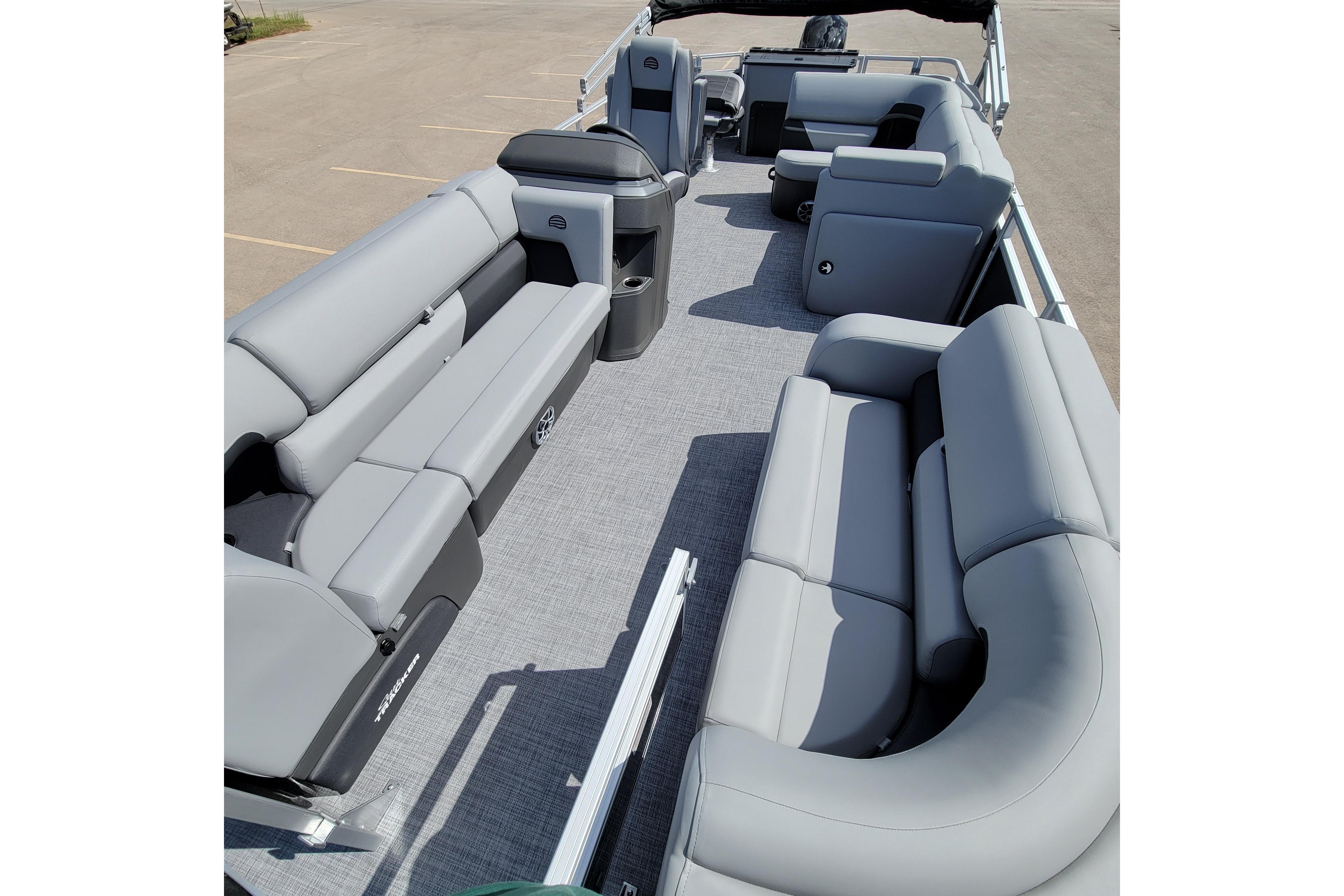 This is the fishing pontoon the whole family can enjoy. This SPORTFISH introduces a third lounge and pushes back the second casting chair to the aft casting deck. The 22 DLX also introduces a lockable rod box that can fit up to six rods. The 2026 model year brings some fine-tuned changes, including a wider boarding ladder, open storage spaces with cupholders built into the seatbacks, and more.