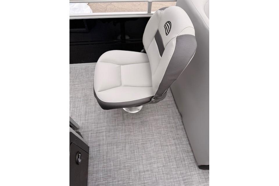 • Reclining, high-back swiveling helm bucket seat w/self-leveling armrests
