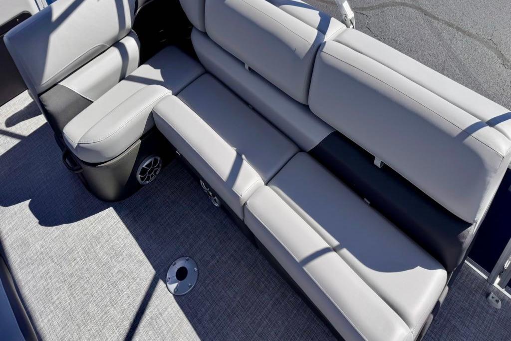 Three pontoon logs deliver massive boosts in power and stability for full days of thrills and relaxation. The front fishing deck gives you two folding and removable fishing chairs, a rail-mounted rod and tool holder, and a starboard storage compartment that boasts a cupholder, rod holder, and a composite lid with a fish ruler. On the port side, you’ll find a 16-gal. aerated livewell with a drink and rod holder, as well as an integrated fish ruler. A deck full of couches, a bench, and an aft bed with hidden storage compartments under a retractable 10' bimini top deliver ultimate relaxation.