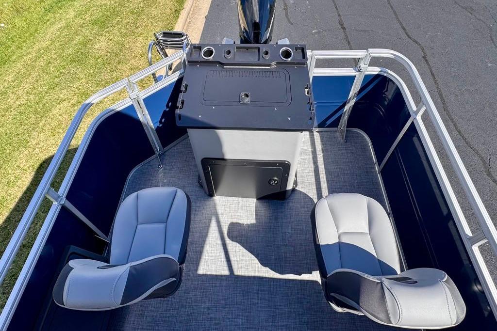 • Front fishing station w/2 pedestal seat base locations; rail-mounted rod & tool holders; & bow starboard storage compartment w/drink holder, rod holder & composite lid w/fish ruler