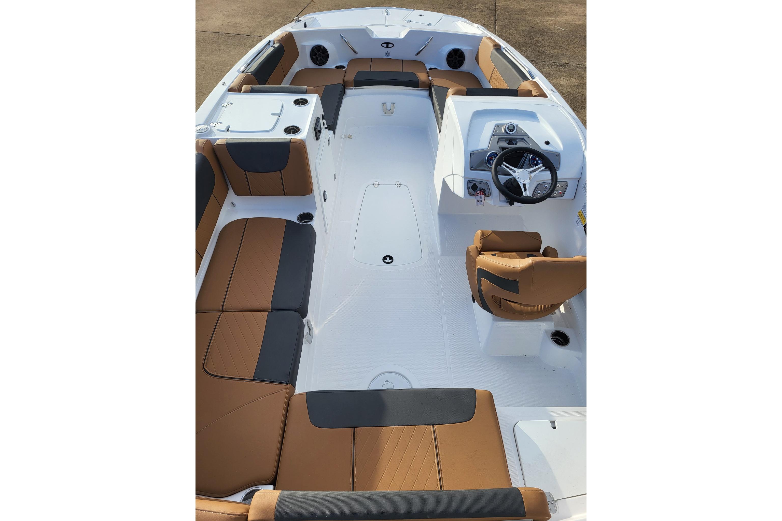 For the fishers, there's the 15-gal. aerated livewell with a pull-out sprayer and rod holders. An available fishing package adds a trolling motor, fish finder, and dual fishing seats. Thrill-seekers will love the in-floor wakeboard and ski storage compartment, standard removable ski-tow pylon, and 4-speaker Kicker® stereo with Bluetooth® compatibility. Pull up the bimini top and relax while the kids jump off the swim platform and get back on the boat using the aft or bow boarding ladders. The helm features traditional gauges and waterproof switches around a sport steering wheel.
