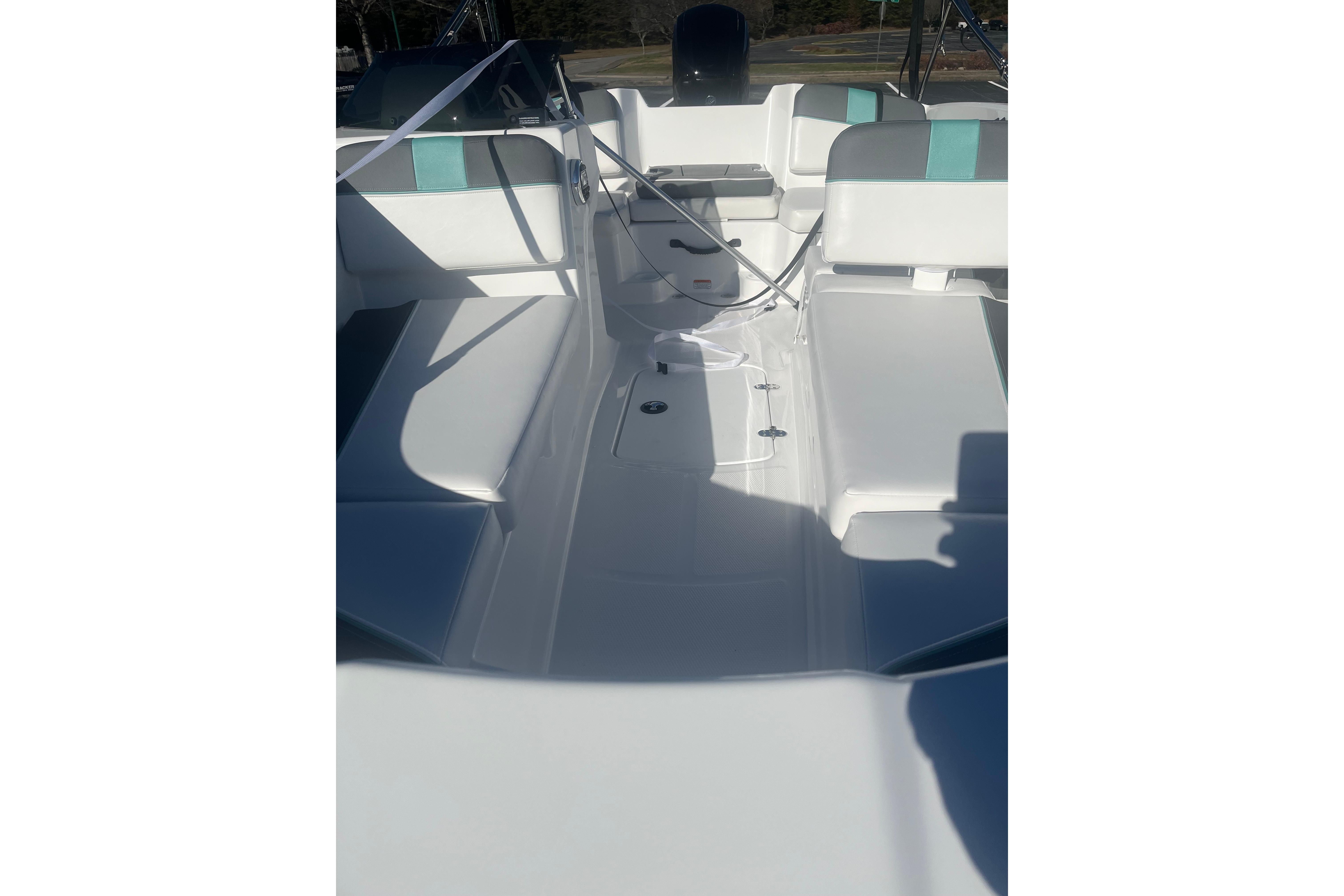 Relax on the water in this boat's midship bench seating and twin forward lounges with under-seat storage. The bow seats have reversible backrests that turn them into spotter seats. Lay out on the aft sun pad when you find your cove. The 4-step telescoping aft boarding ladder makes it easy to get back on the swim platform after diving into the water. Flip-up seat cushions and flip-down seat backs let passengers board the boat without stepping on upholstery. Claim 1 of the 9 drink holders, find your song on the 2-speaker Kicker® stereo, and search for excitement on the water!