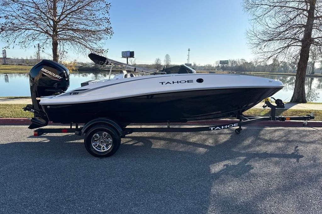 The 2026 TAHOE® T16 comes standard with a 60hp Mercury® ELPT FourStroke outboard motor and has a recommended maximum 75hp rating. This model is packaged with a trailer.
