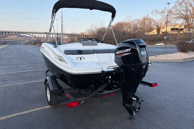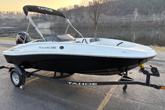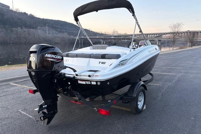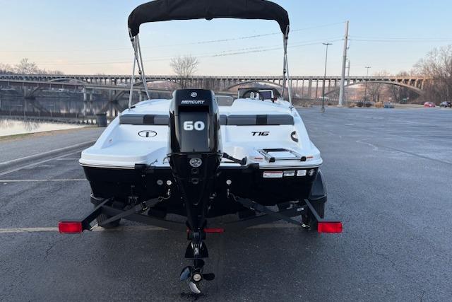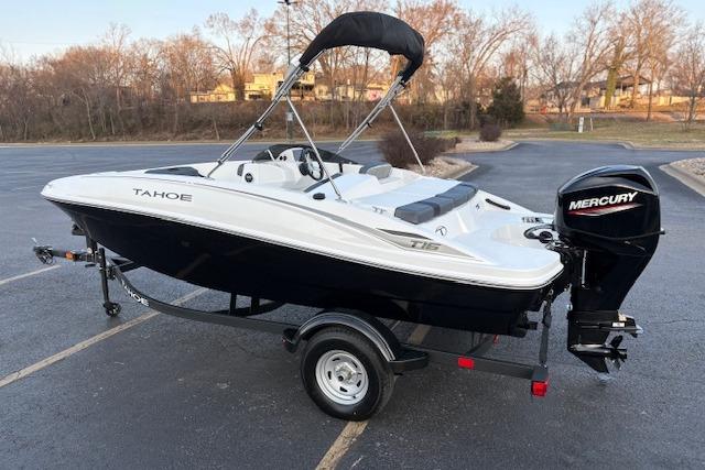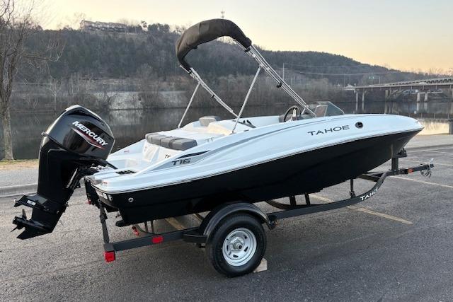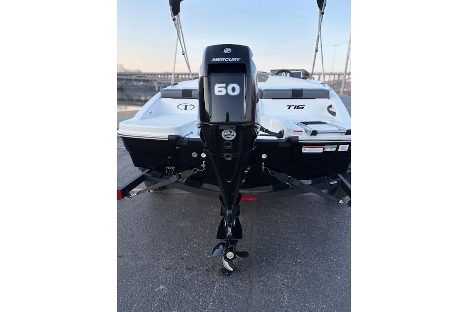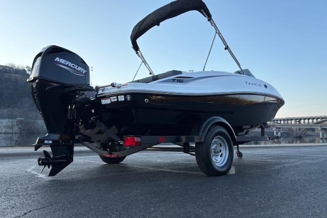 The 2026 TAHOE® T16 comes standard with a 60hp Mercury® ELPT FourStroke outboard motor and has a recommended maximum 75hp rating. This model is packaged with a trailer.