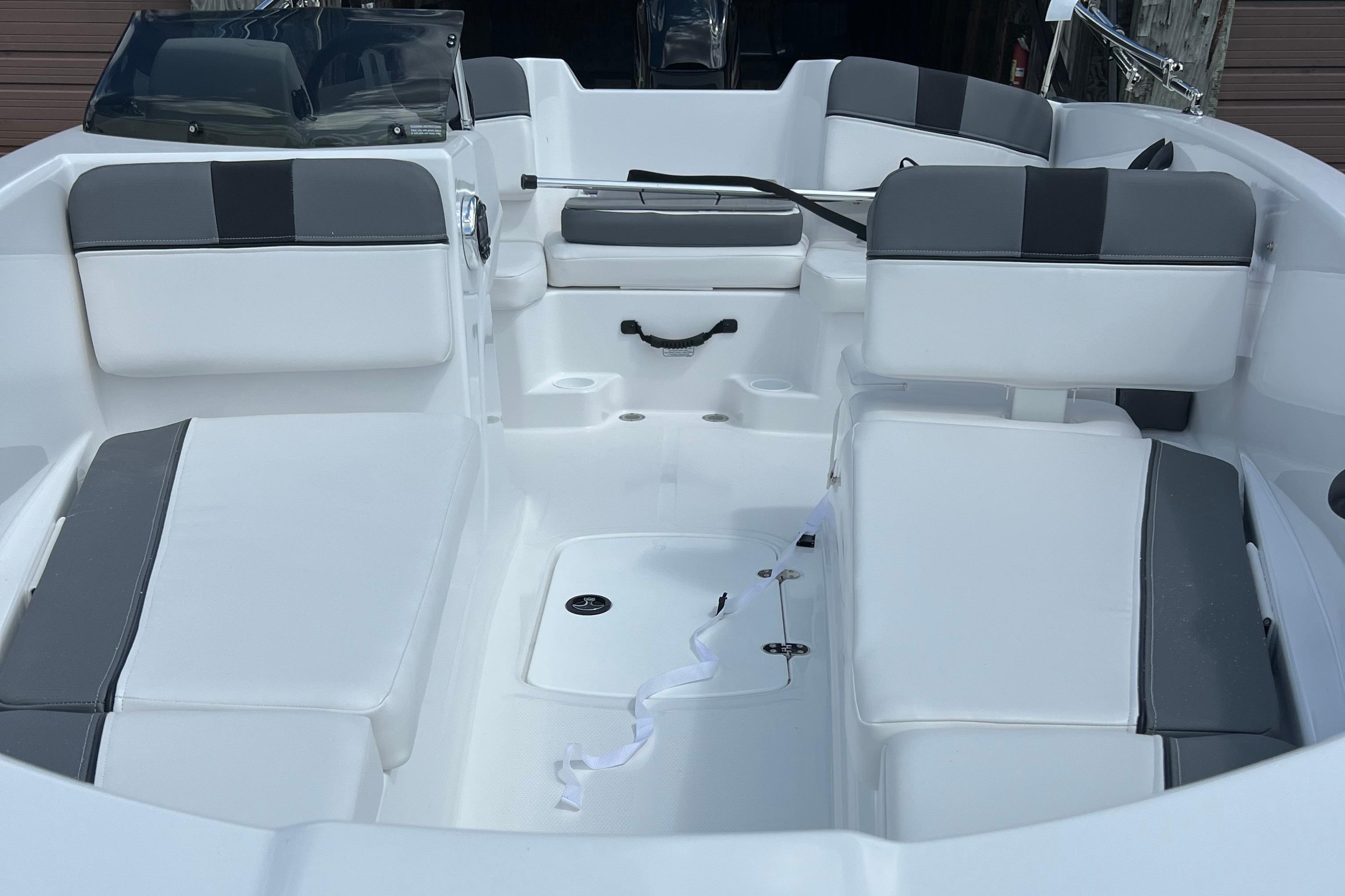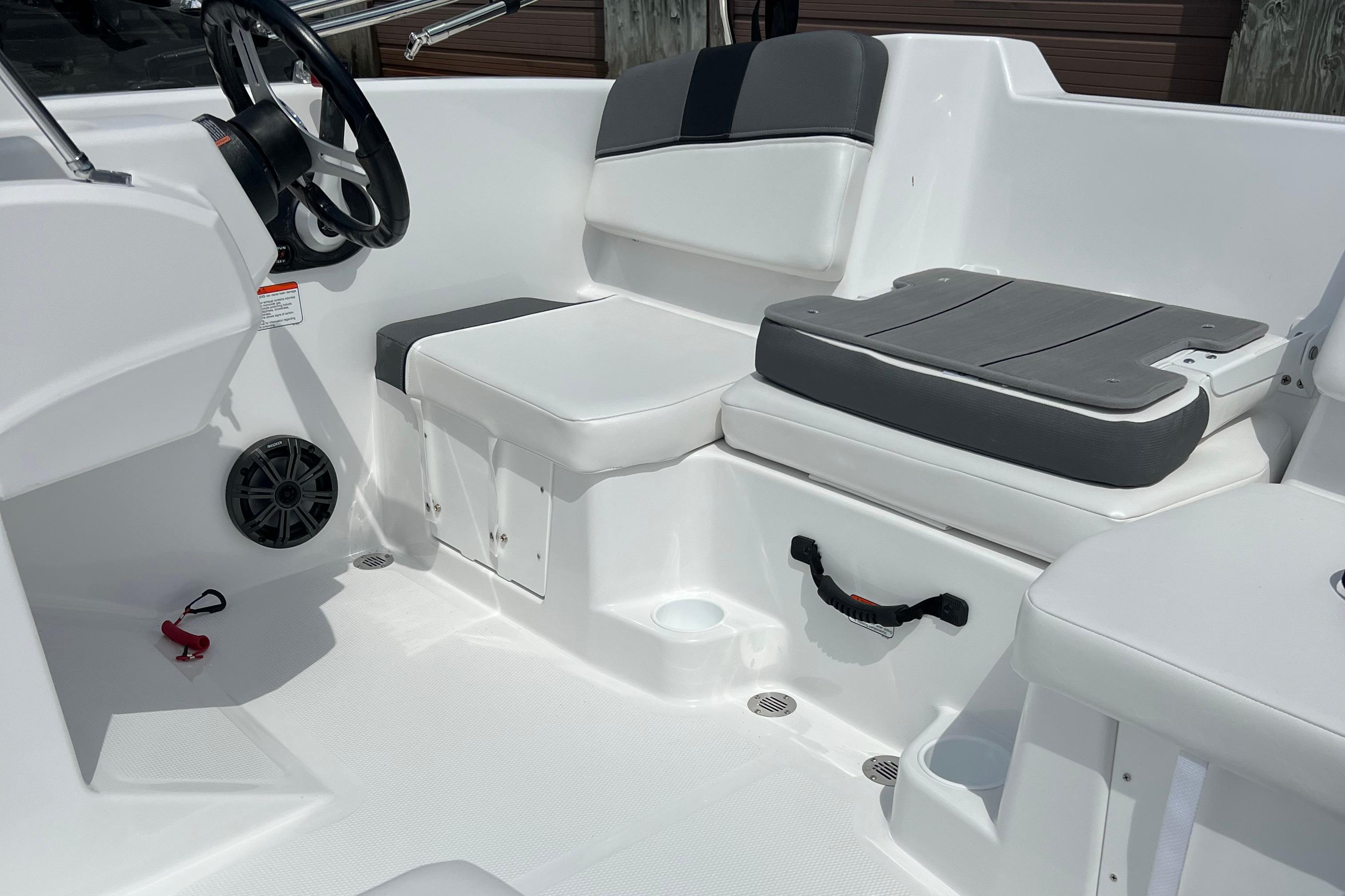 Relax on the water in this boat's midship bench seating and twin forward lounges with under-seat storage. The bow seats have reversible backrests that turn them into spotter seats. Lay out on the aft sun pad when you find your cove. The 4-step telescoping aft boarding ladder makes it easy to get back on the swim platform after diving into the water. Flip-up seat cushions and flip-down seat backs let passengers board the boat without stepping on upholstery. Claim 1 of the 9 drink holders, find your song on the 2-speaker Kicker® stereo, and search for excitement on the water!
