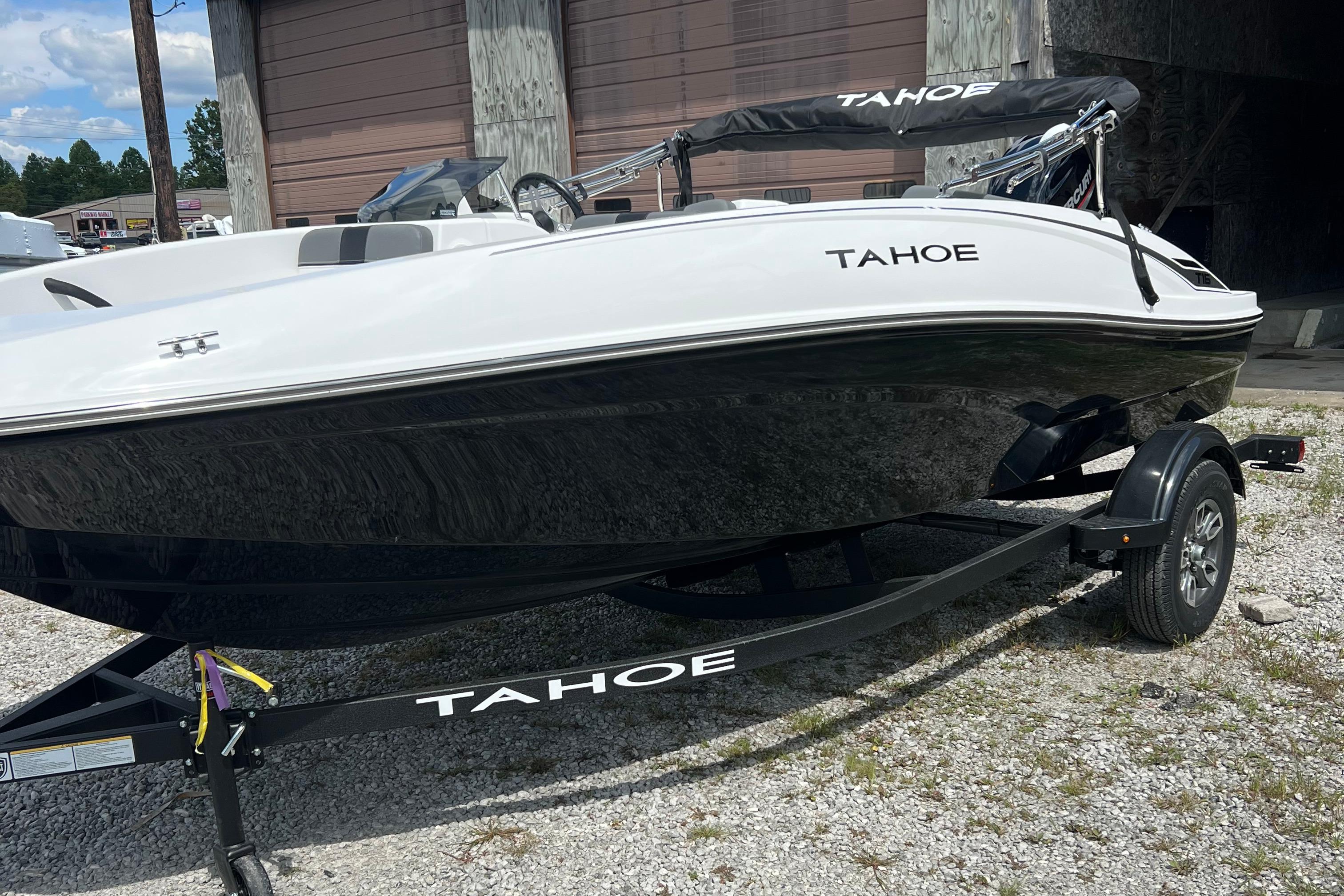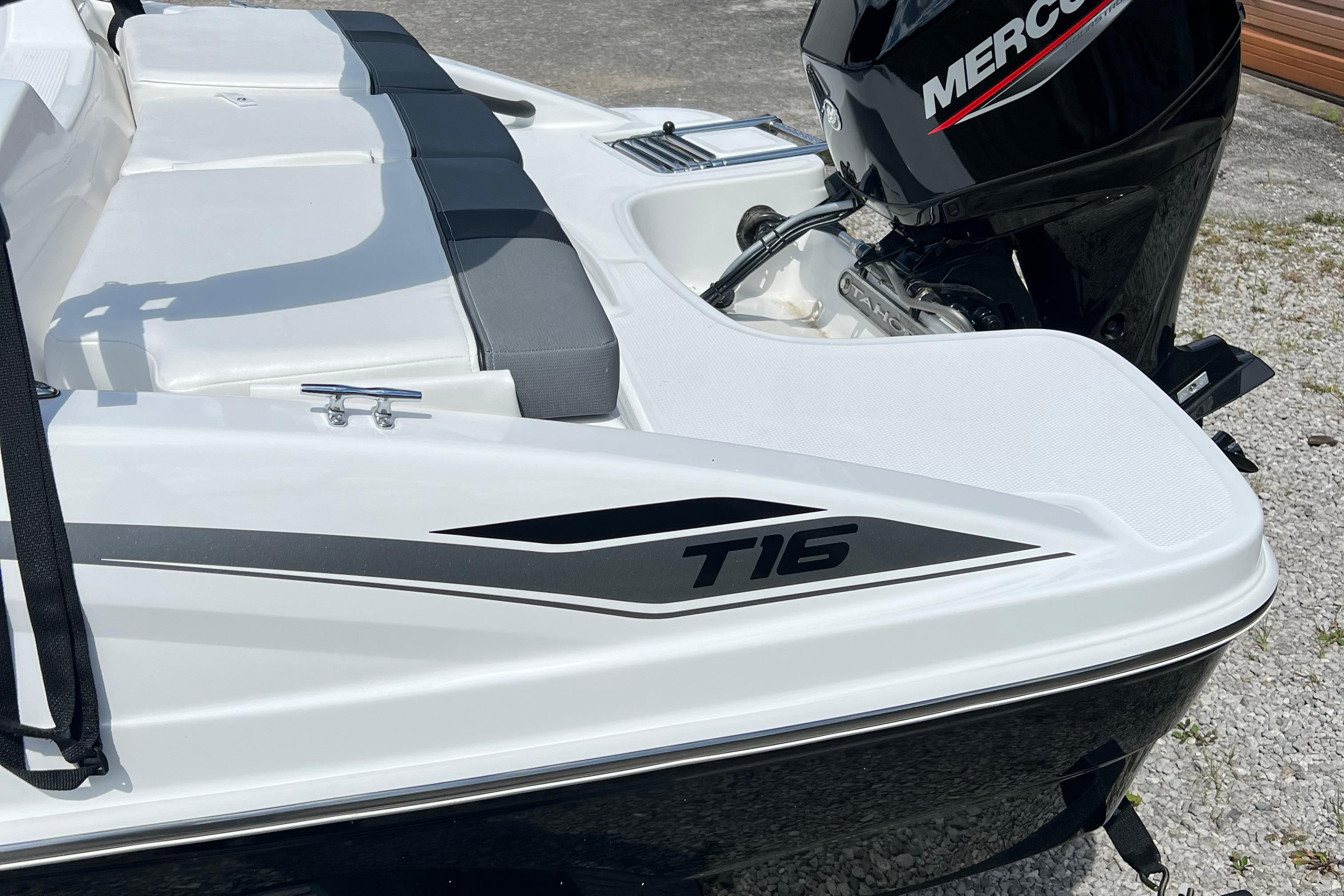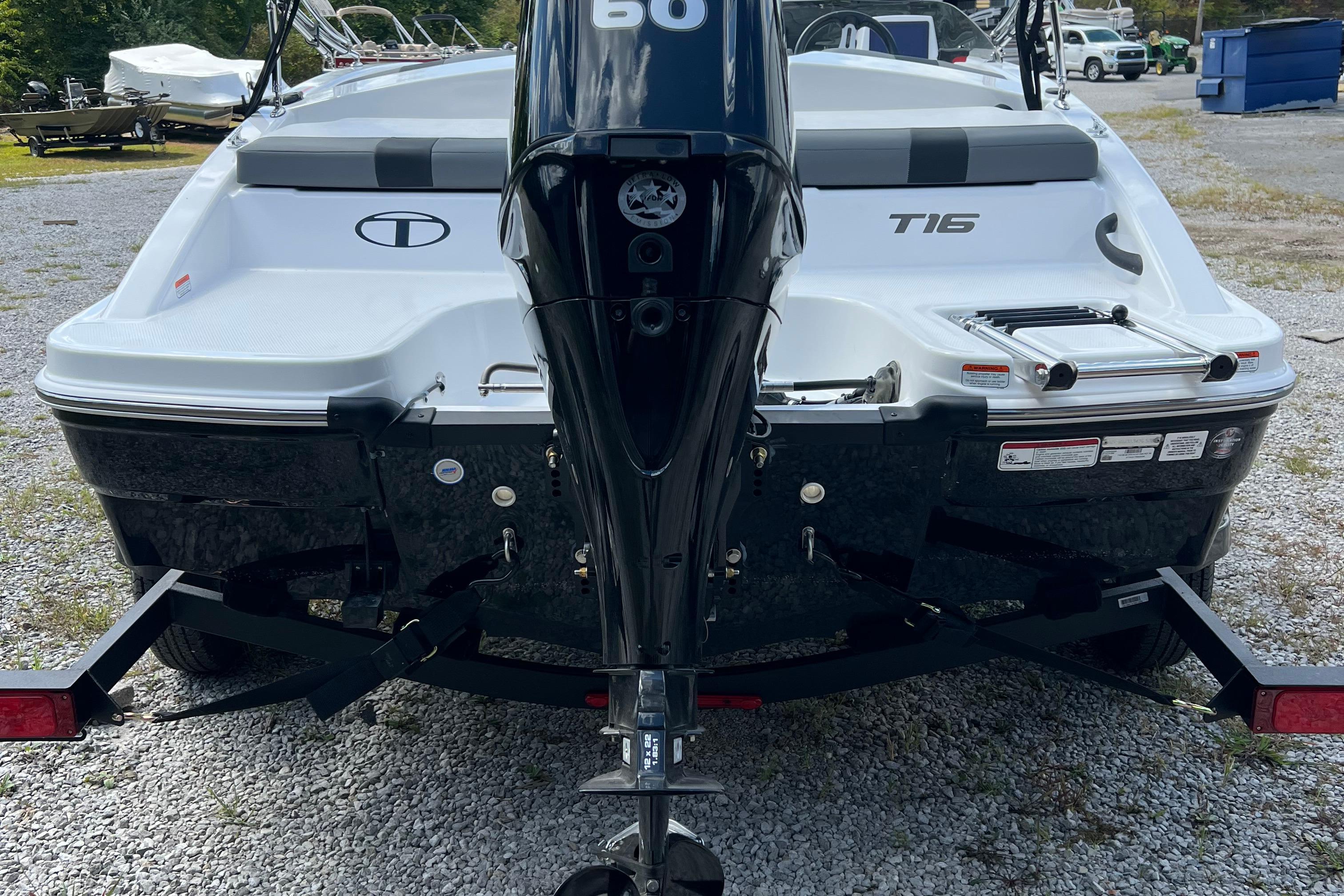 The 2026 TAHOE® T16 comes standard with a 60hp Mercury® ELPT FourStroke outboard motor and has a recommended maximum 75hp rating. This model is packaged with a trailer.