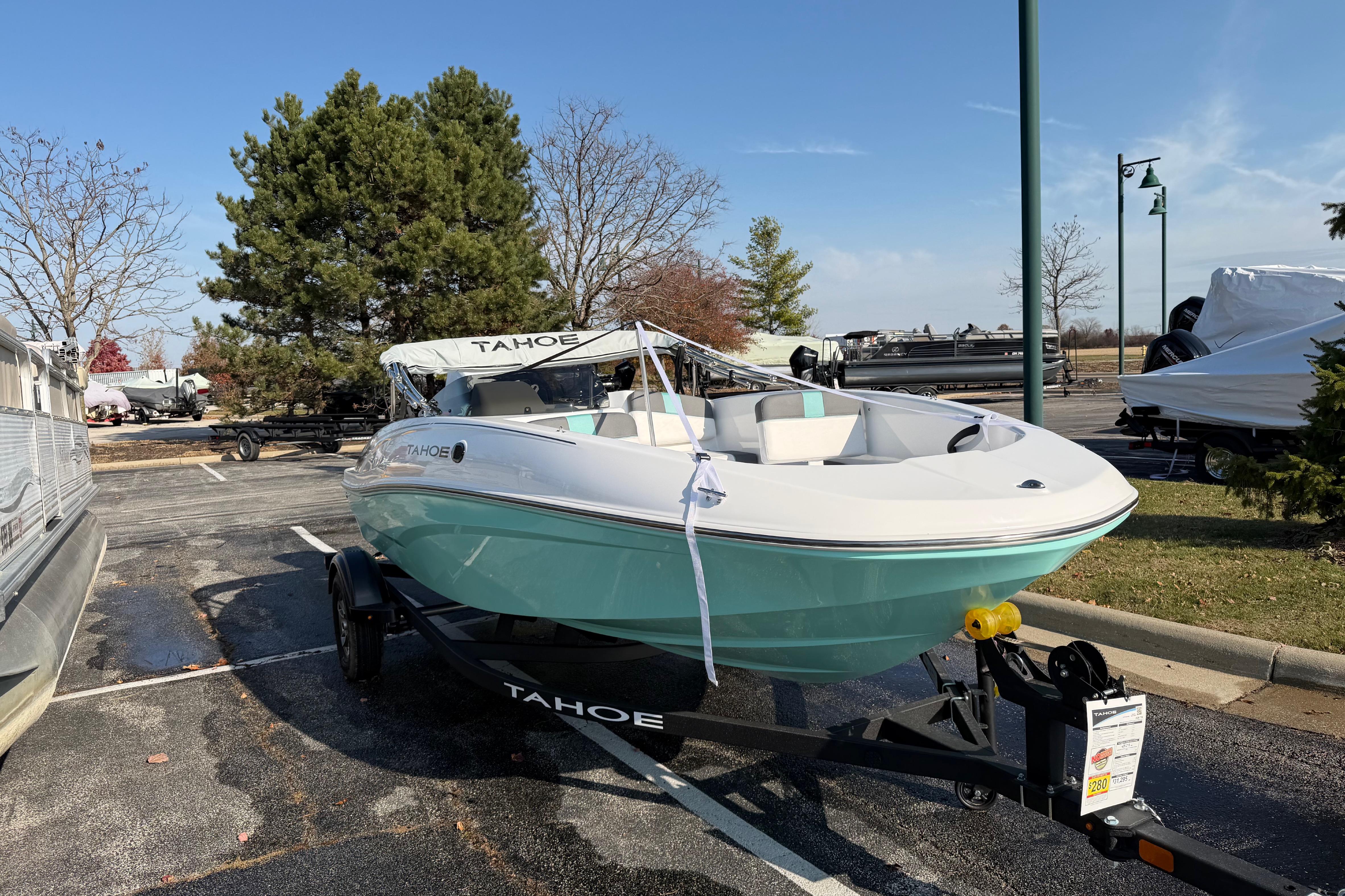 The 2026 TAHOE® T16 comes standard with a 60hp Mercury® ELPT FourStroke outboard motor and has a recommended maximum 75hp rating. This model is packaged with a trailer.