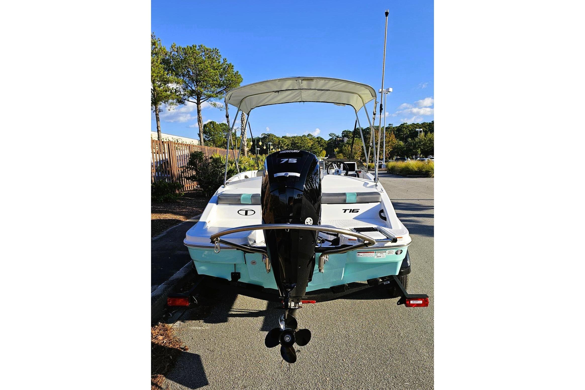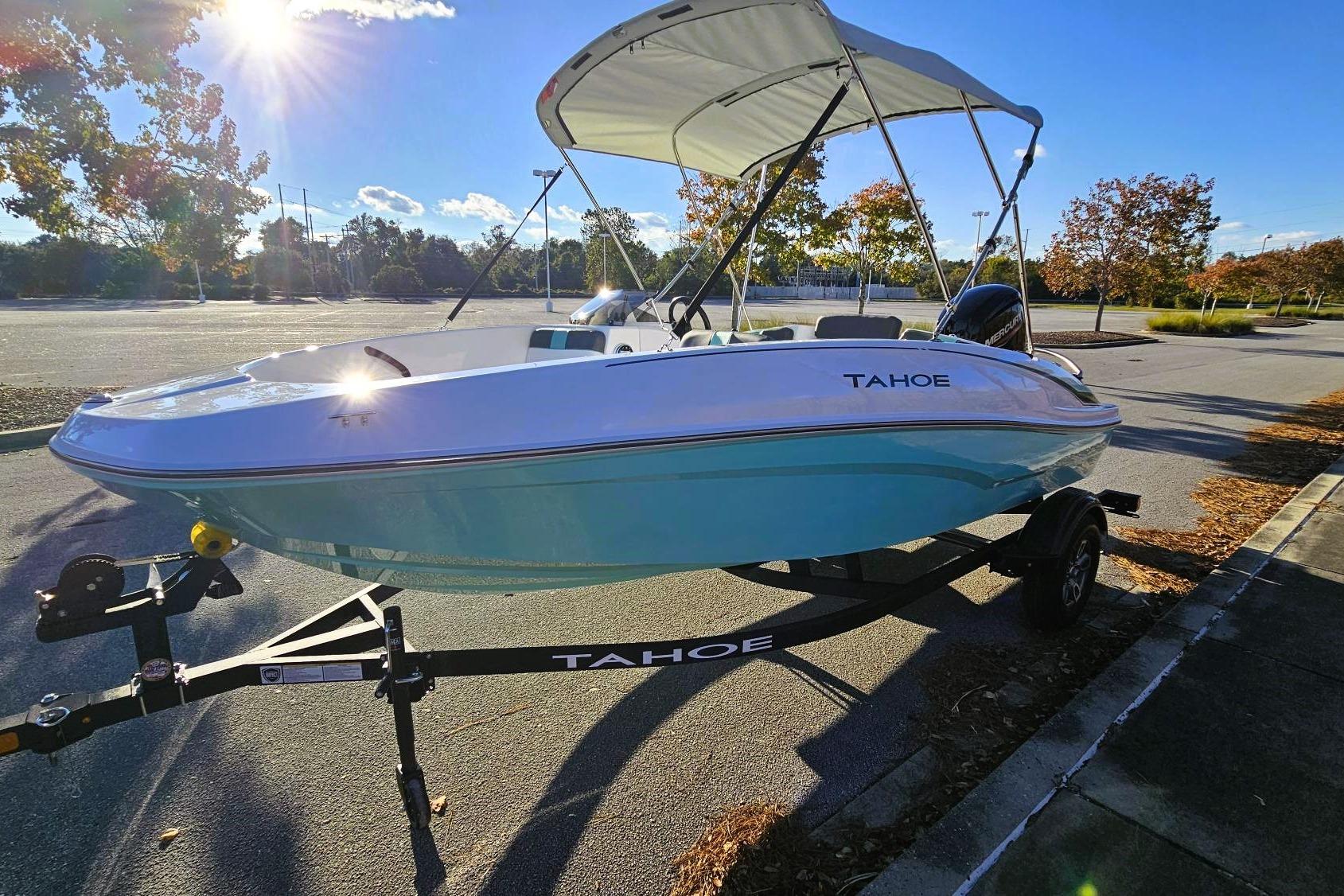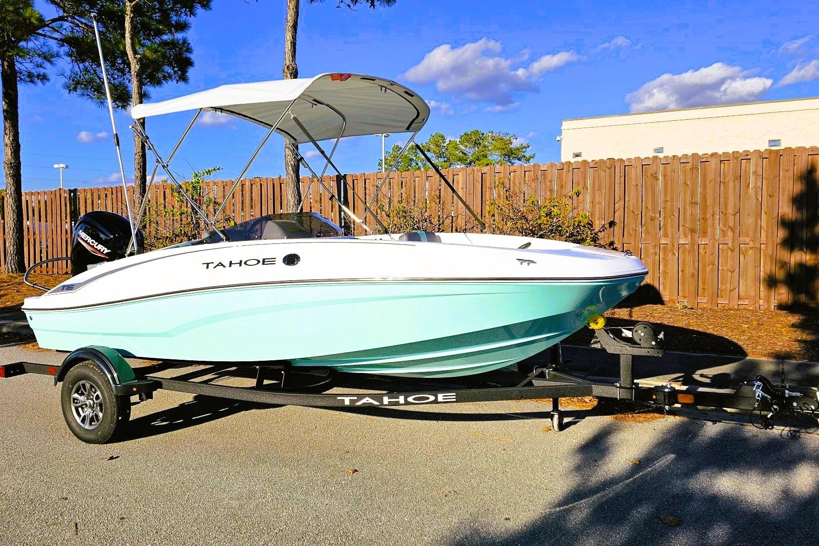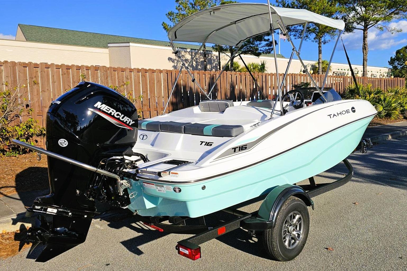 The 2026 TAHOE® T16 comes standard with a 60hp Mercury® ELPT FourStroke outboard motor and has a recommended maximum 75hp rating. This model is packaged with a trailer.