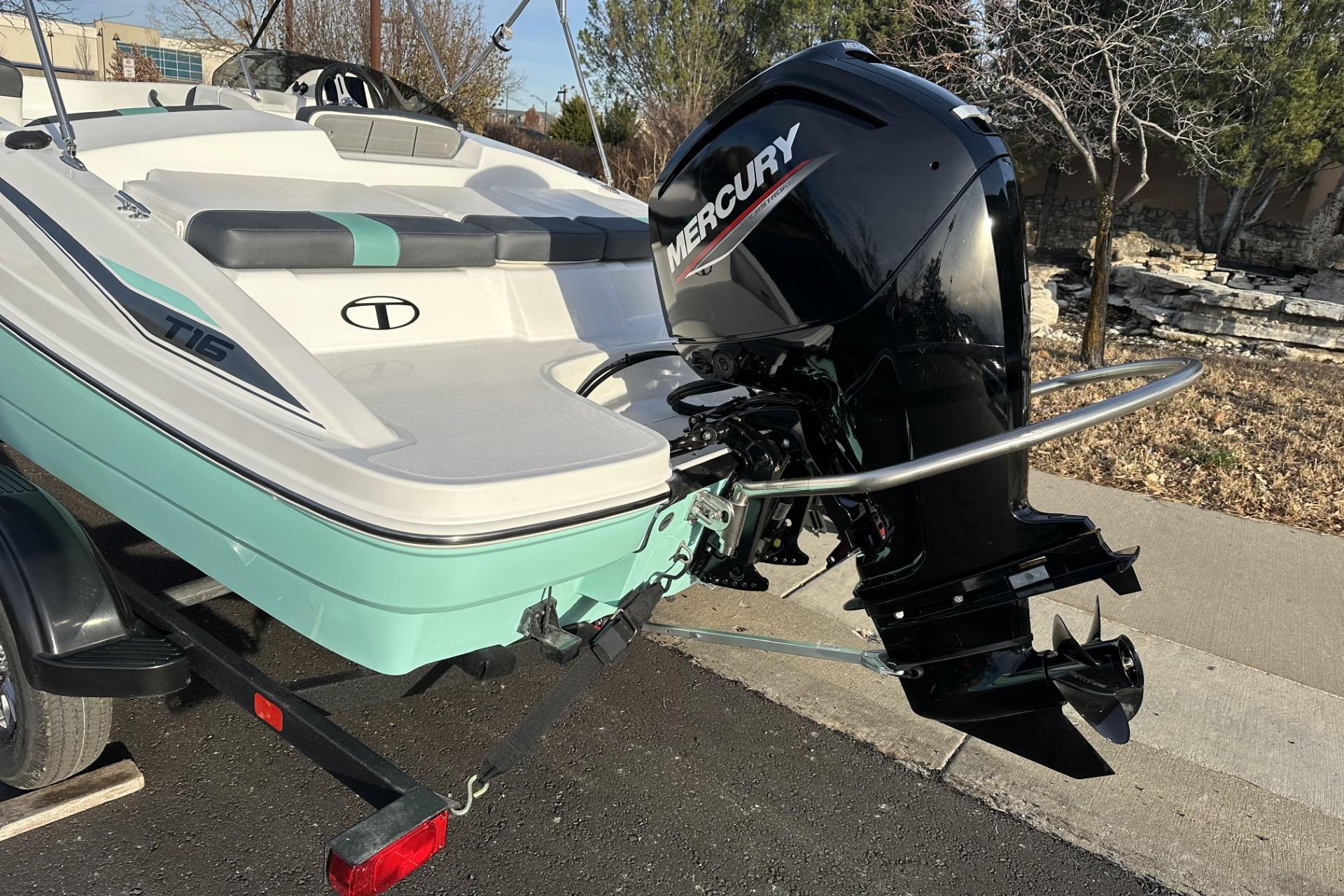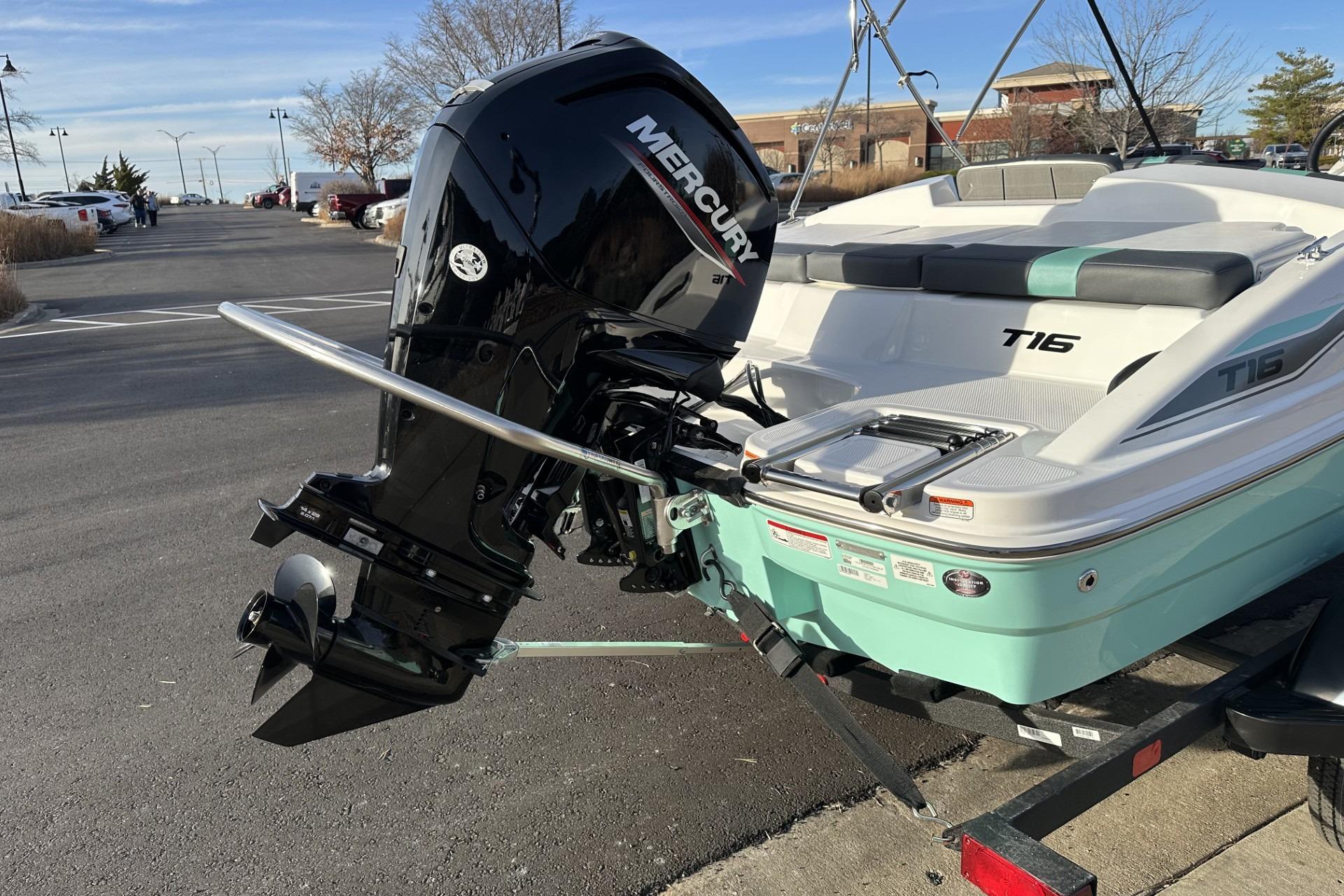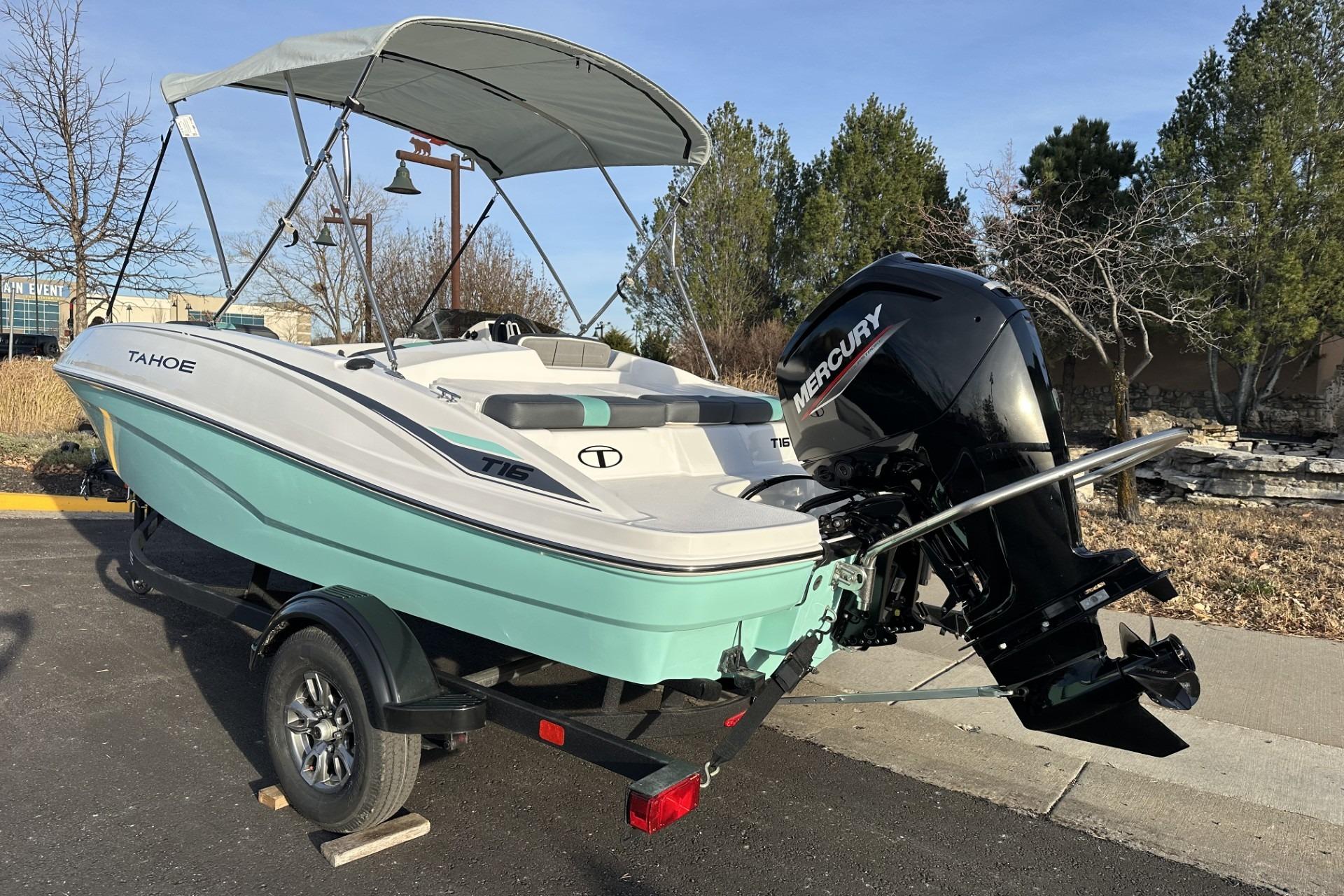 The 2026 TAHOE® T16 comes standard with a 60hp Mercury® ELPT FourStroke outboard motor and has a recommended maximum 75hp rating. This model is packaged with a trailer.
