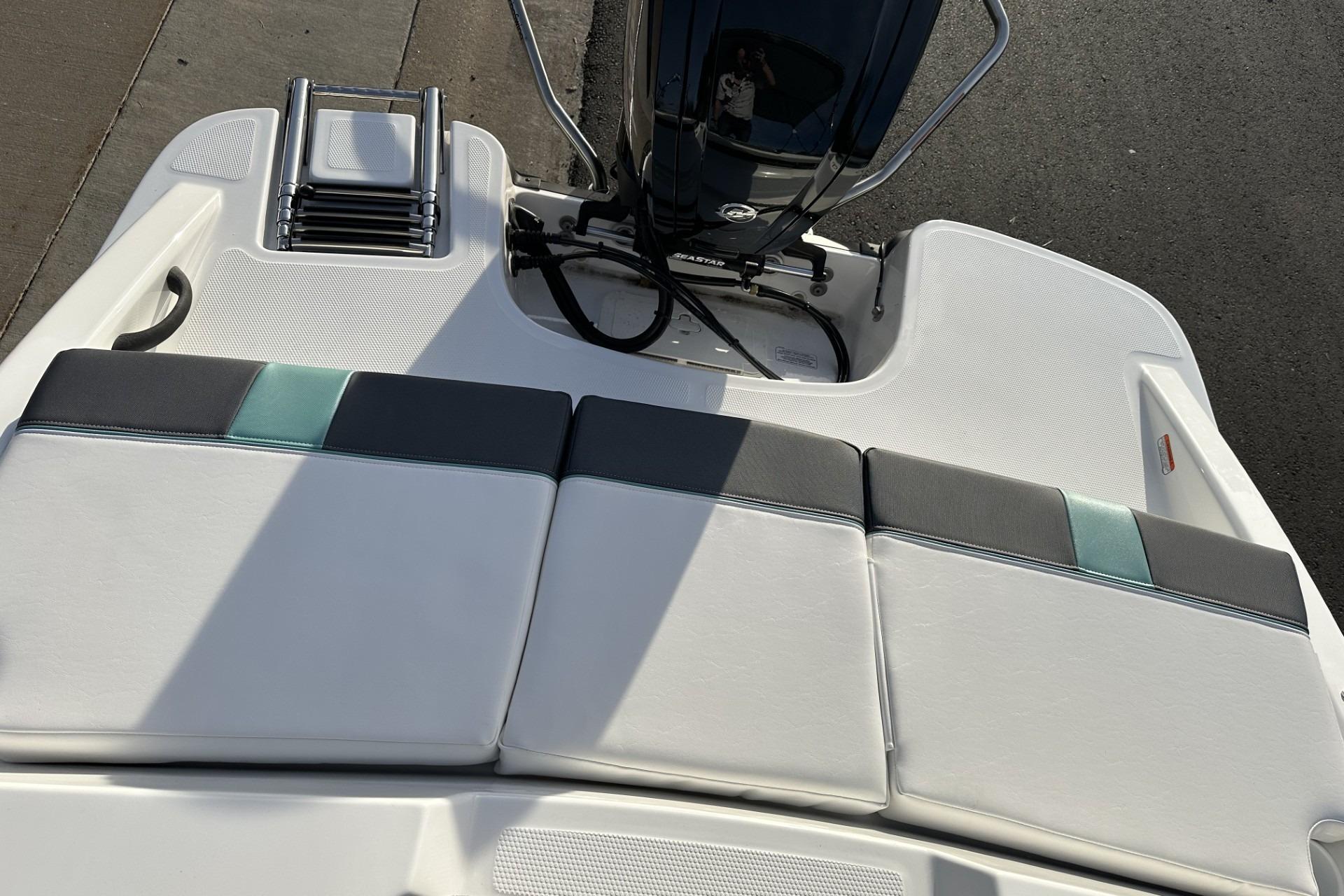 Relax on the water in this boat's midship bench seating and twin forward lounges with under-seat storage. The bow seats have reversible backrests that turn them into spotter seats. Lay out on the aft sun pad when you find your cove. The 4-step telescoping aft boarding ladder makes it easy to get back on the swim platform after diving into the water. Flip-up seat cushions and flip-down seat backs let passengers board the boat without stepping on upholstery. Claim 1 of the 9 drink holders, find your song on the 2-speaker Kicker® stereo, and search for excitement on the water!