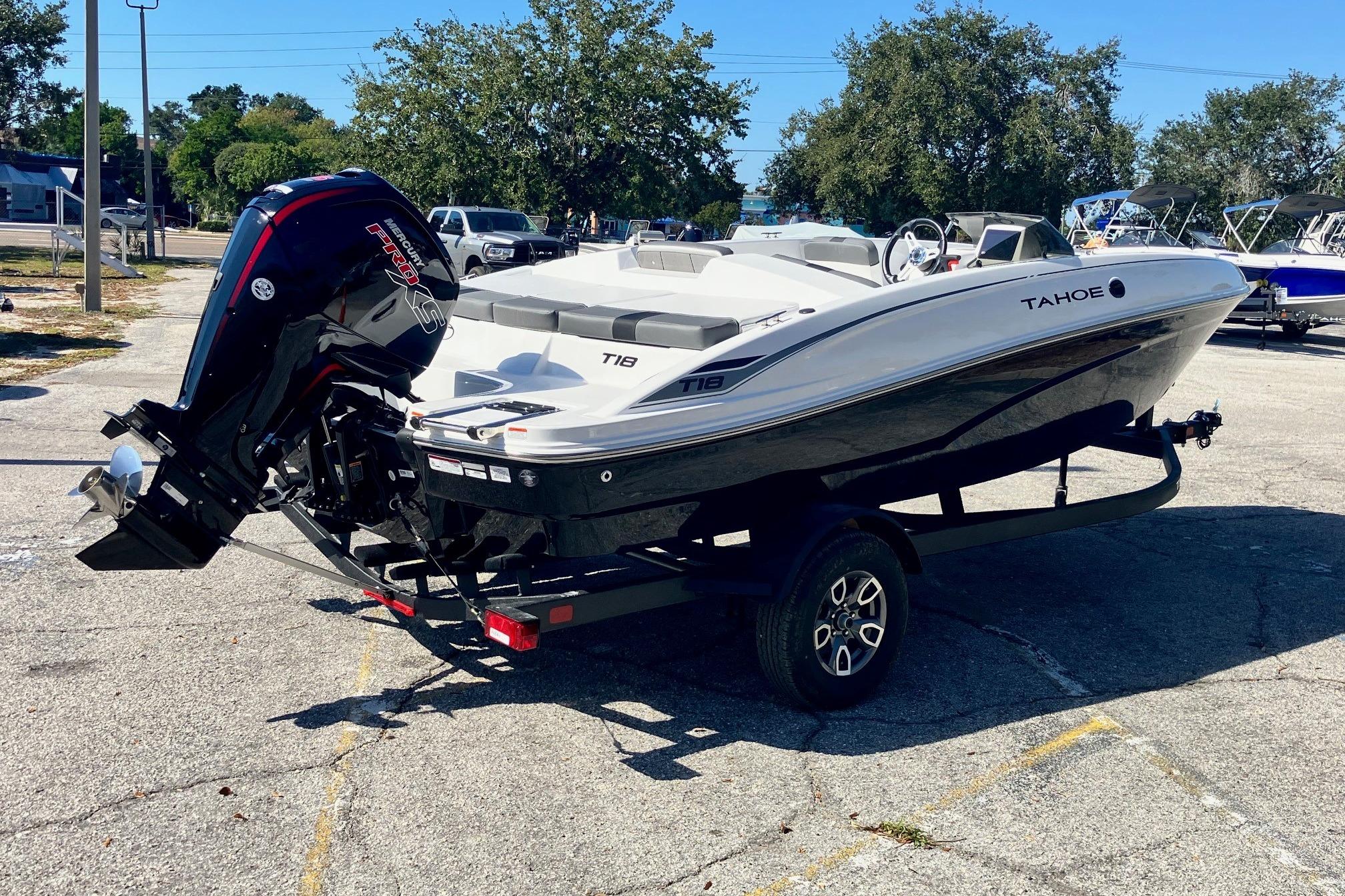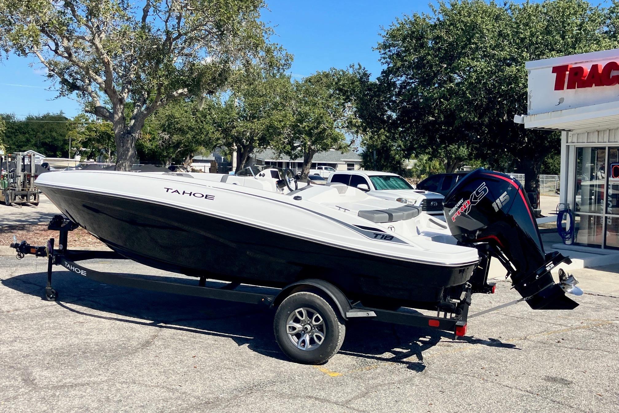 The 2026 TAHOE® T18 comes standard with a 90hp Mercury® ELPT FourStroke outboard motor and has a recommended maximum 115hp rating. This model is packaged with a trailer.