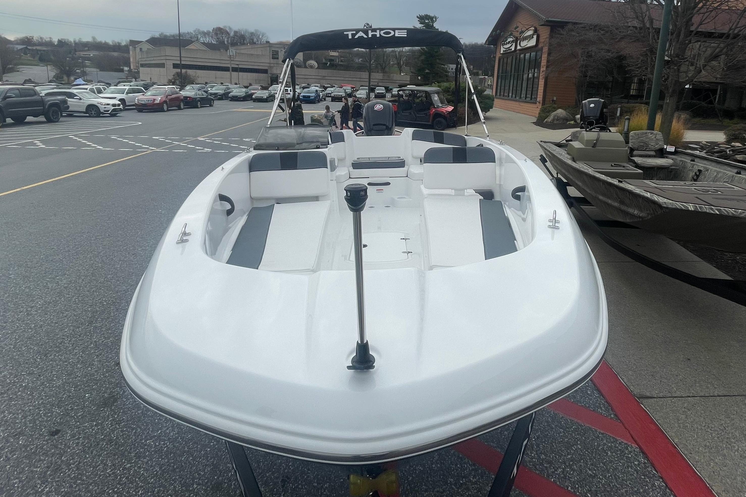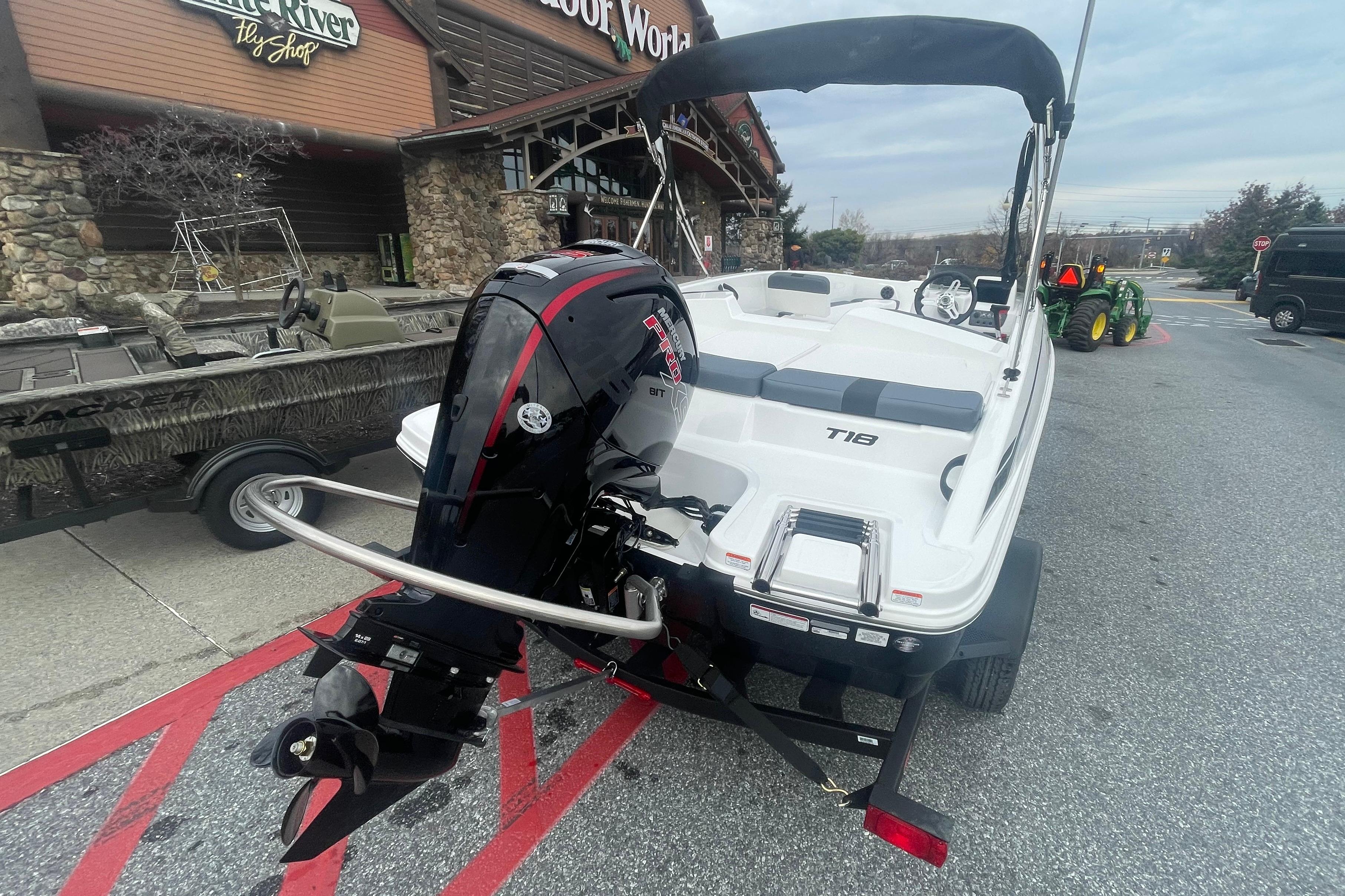 The 2026 TAHOE® T18 comes standard with a 90hp Mercury® ELPT FourStroke outboard motor and has a recommended maximum 115hp rating. This model is packaged with a trailer.
