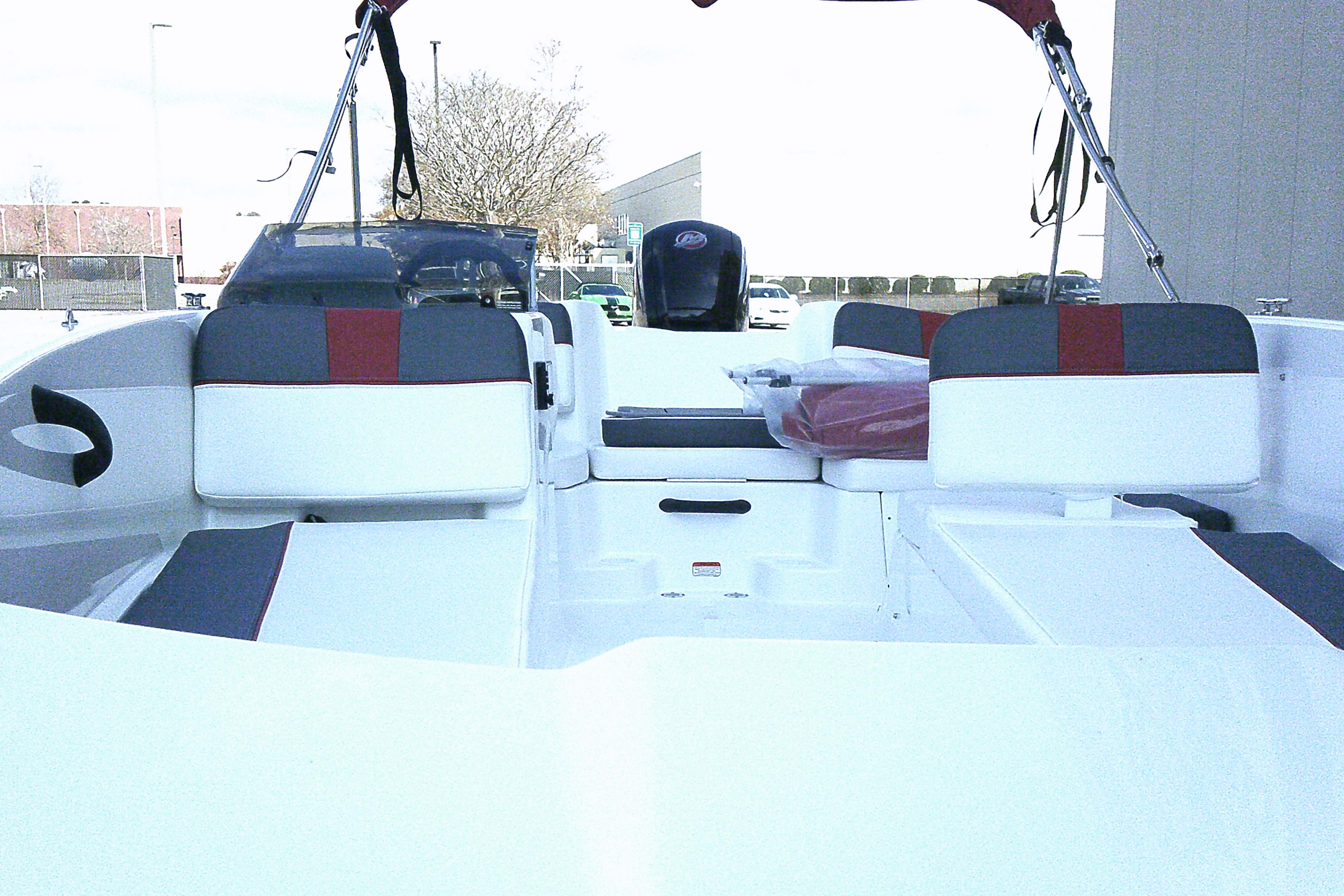 The aft swim platform with a 4-step telescoping boarding ladder makes it easy to jump in and out of the water. Find your favorite seat in the 3-across midship bench, dual forward lounges, or aft sun pad. The port bow backrest can be reversed for forward or aft seating and its cushion can even be flipped up so passengers don't step on the upholstery as they board. Add the optional bimini top to create the perfect lake-day boat your friends and family will love!