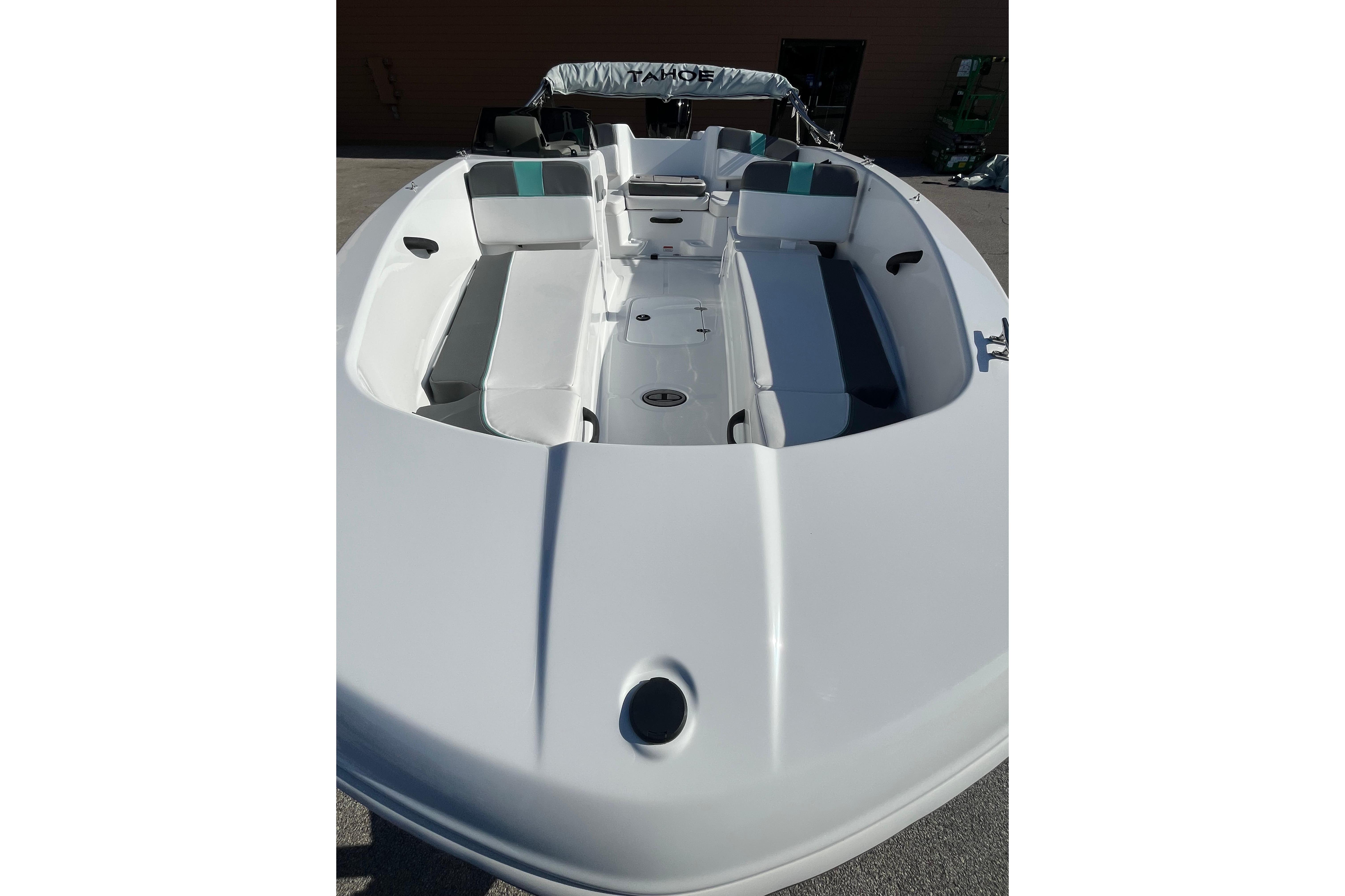 The aft swim platform with a 4-step telescoping boarding ladder makes it easy to jump in and out of the water. Find your favorite seat in the 3-across midship bench, dual forward lounges, or aft sun pad. The port bow backrest can be reversed for forward or aft seating and its cushion can even be flipped up so passengers don't step on the upholstery as they board. Add the optional bimini top to create the perfect lake-day boat your friends and family will love!