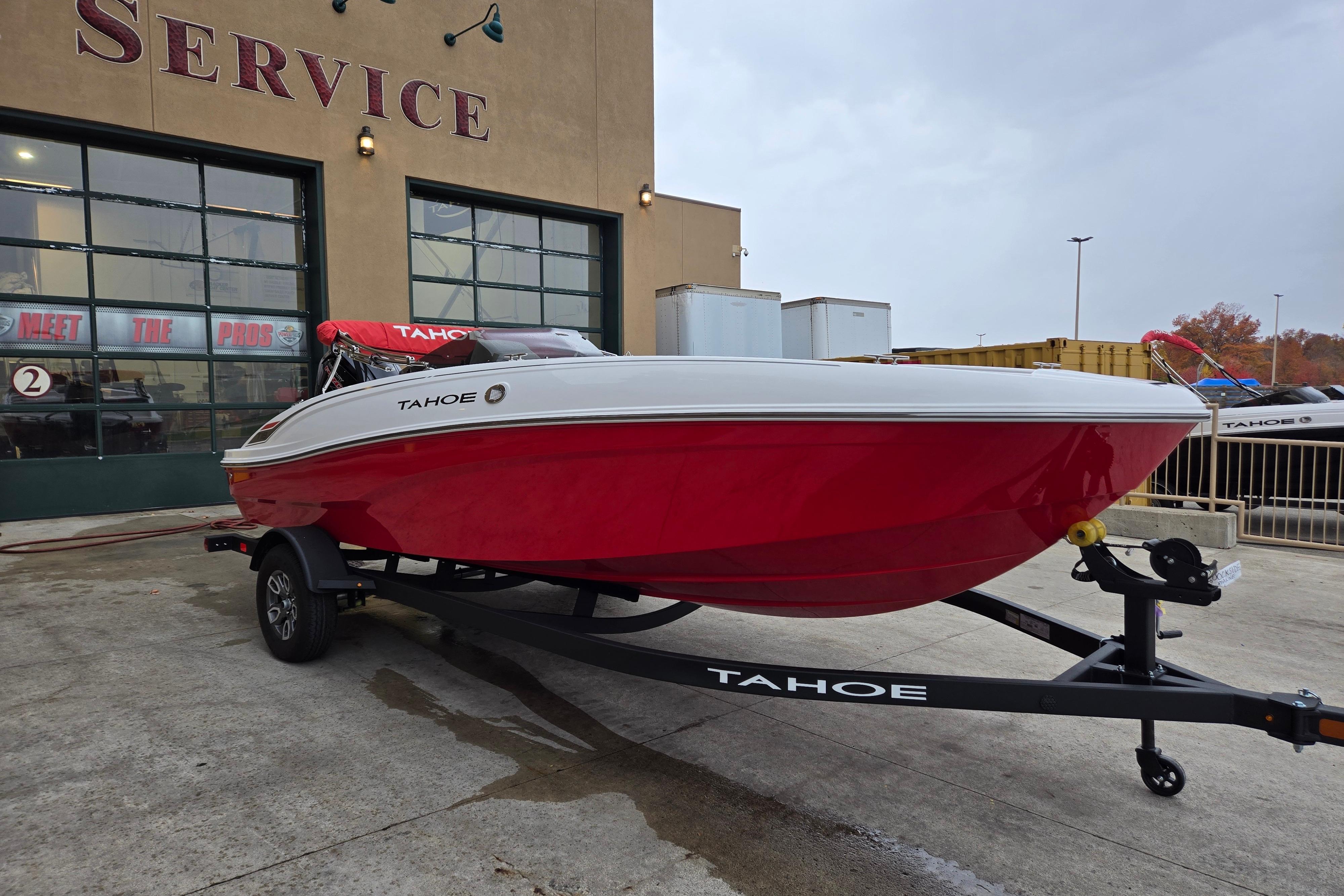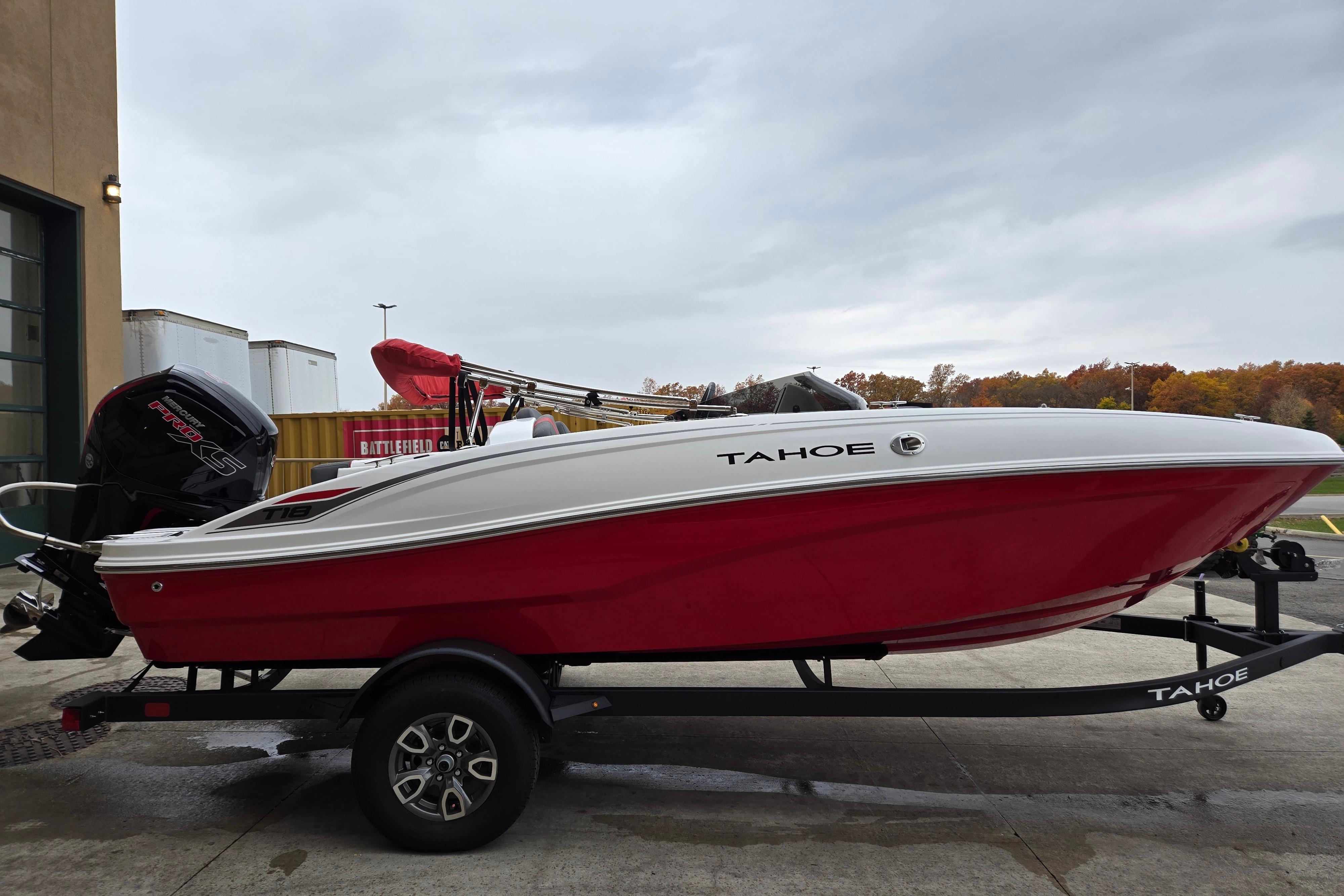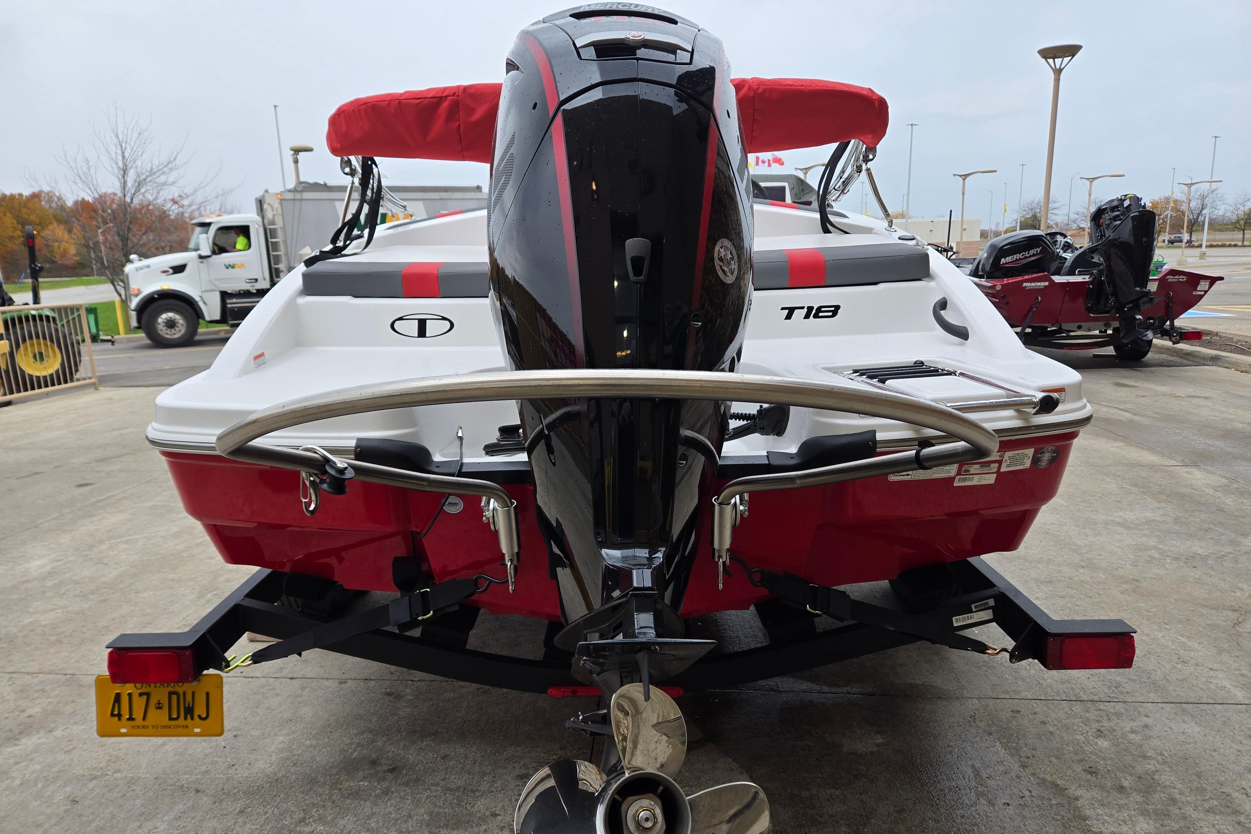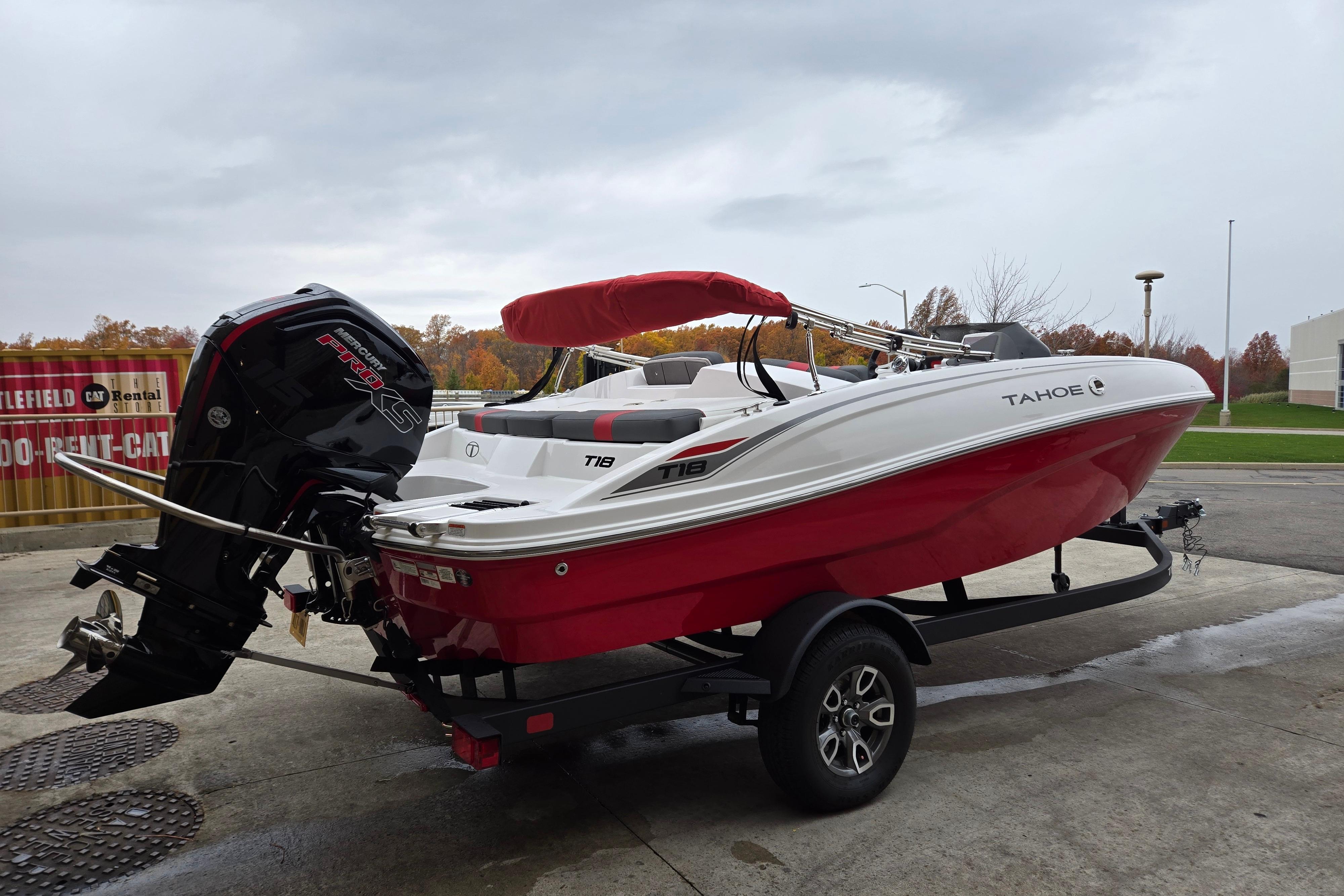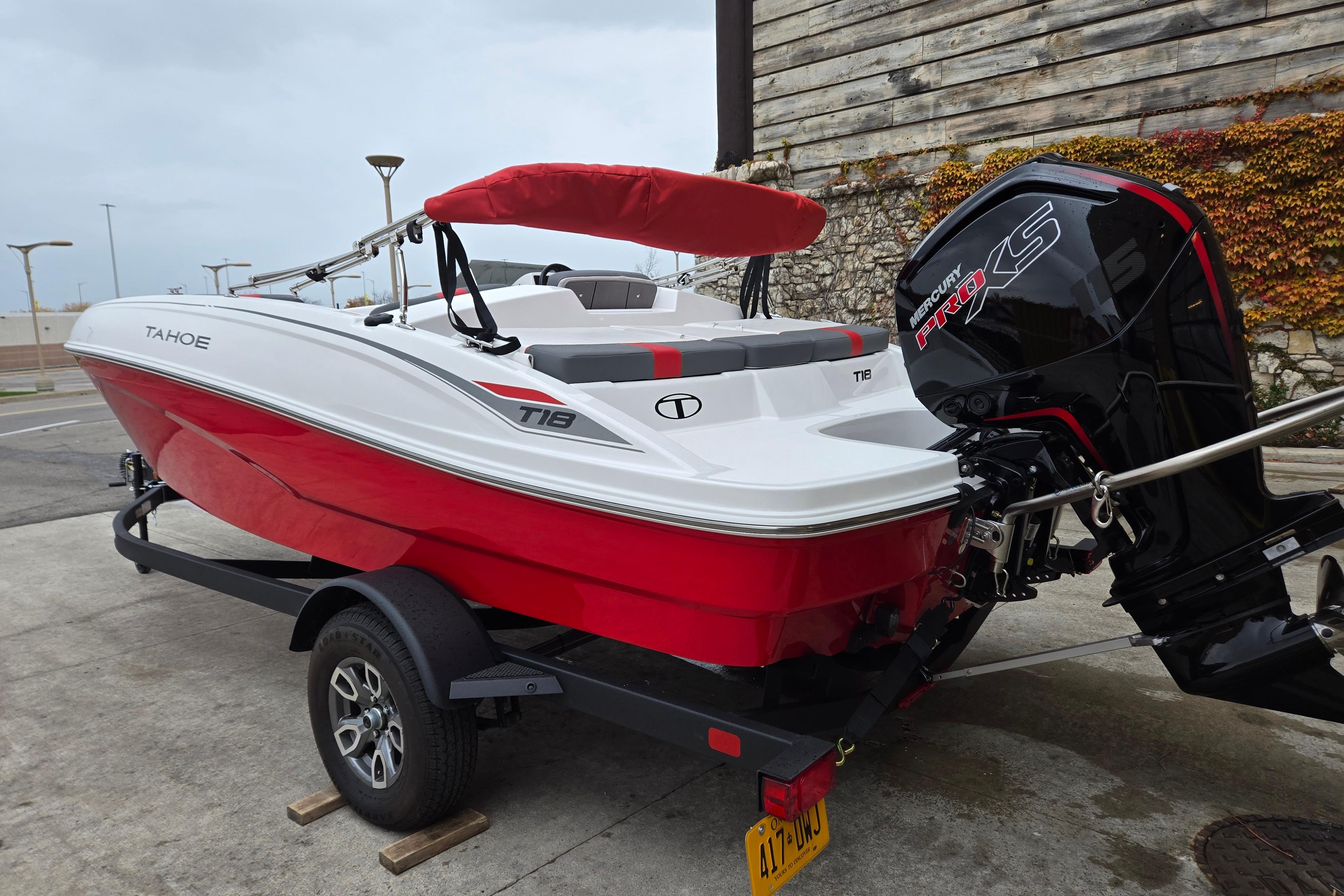 The 2026 TAHOE® T18 comes standard with a 90hp Mercury® ELPT FourStroke outboard motor and has a recommended maximum 115hp rating. This model is packaged with a trailer.