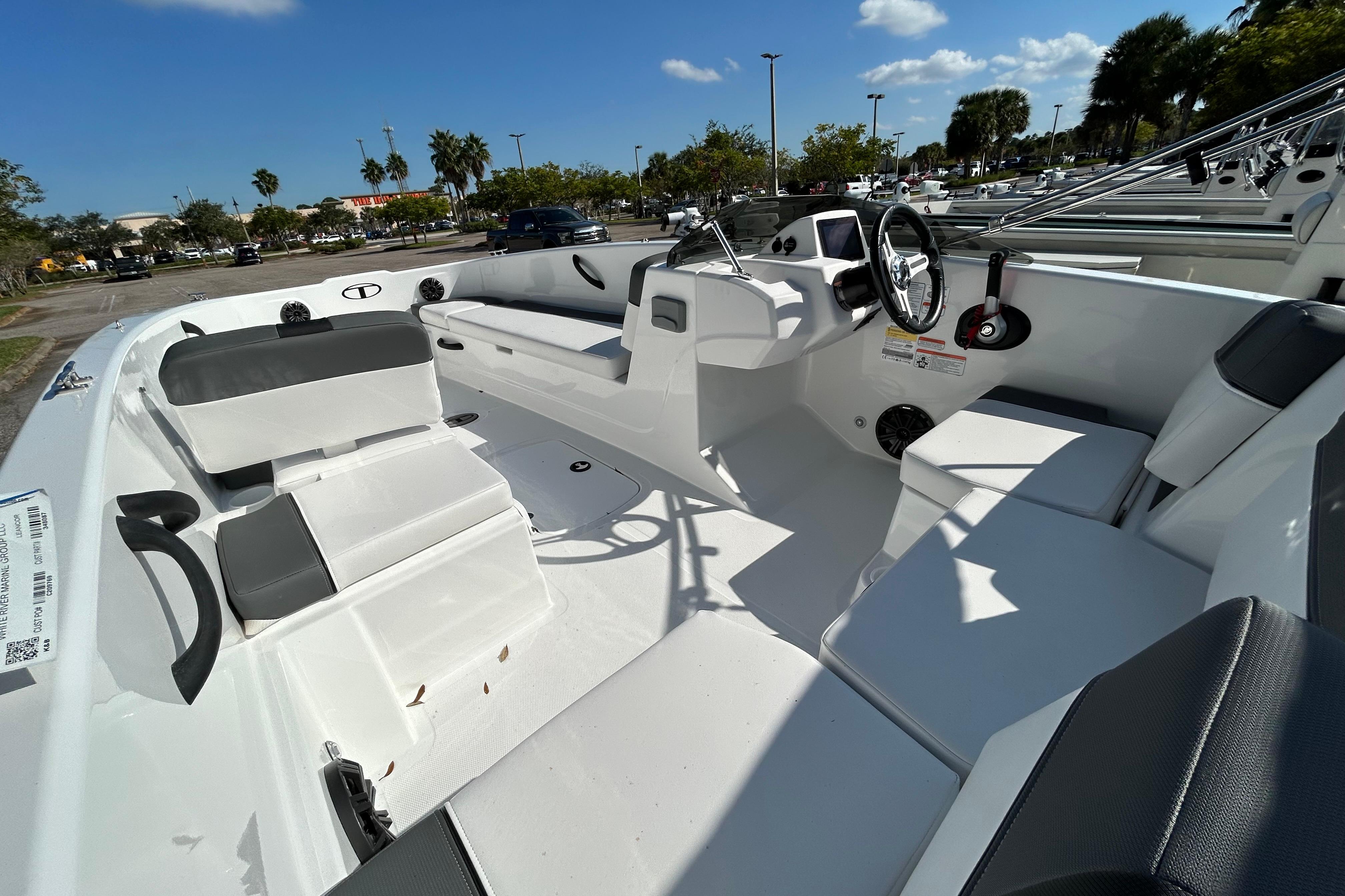The aft swim platform with a 4-step telescoping boarding ladder makes it easy to jump in and out of the water. Find your favorite seat in the 3-across midship bench, dual forward lounges, or aft sun pad. The port bow backrest can be reversed for forward or aft seating and its cushion can even be flipped up so passengers don't step on the upholstery as they board. Add the optional bimini top to create the perfect lake-day boat your friends and family will love!
