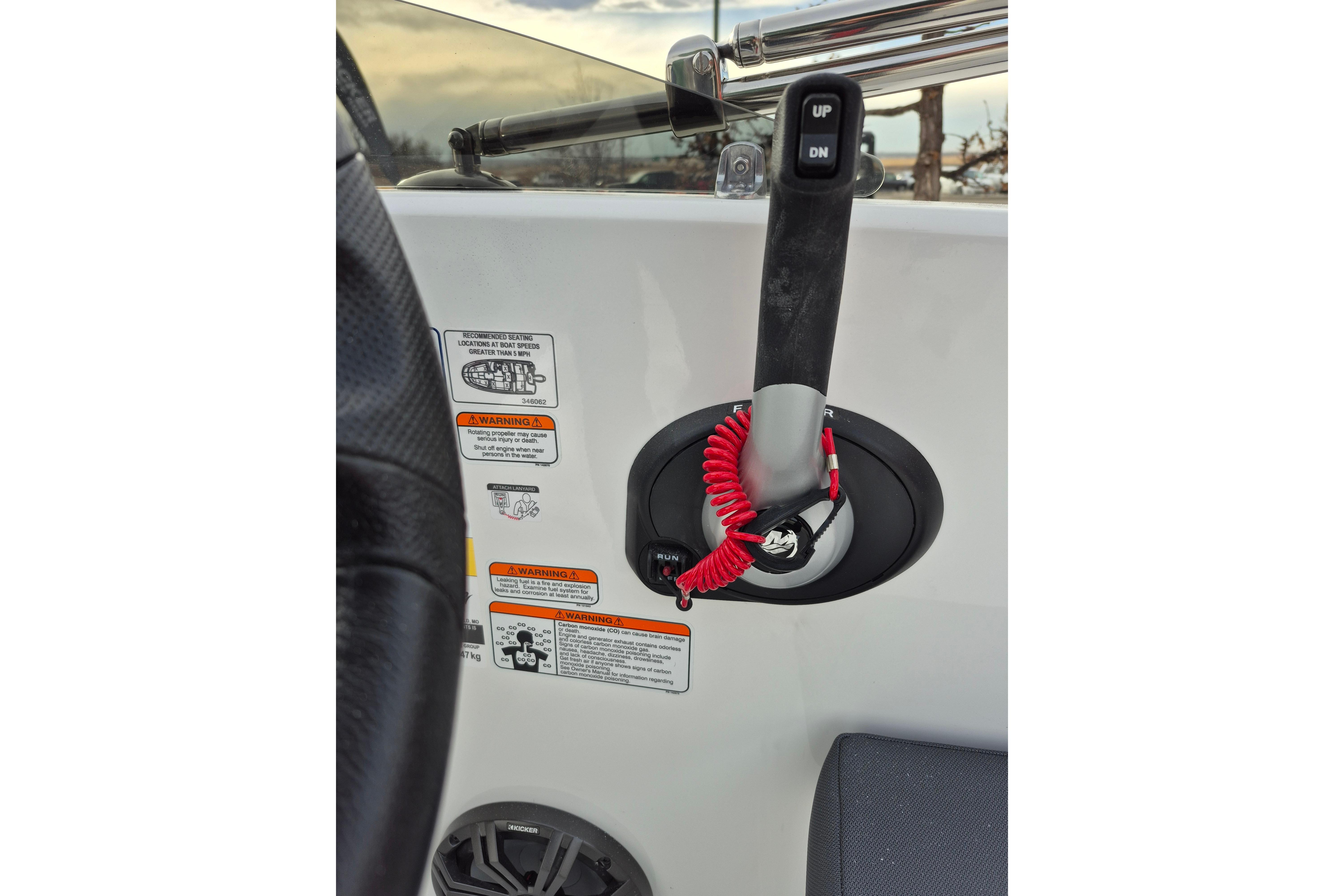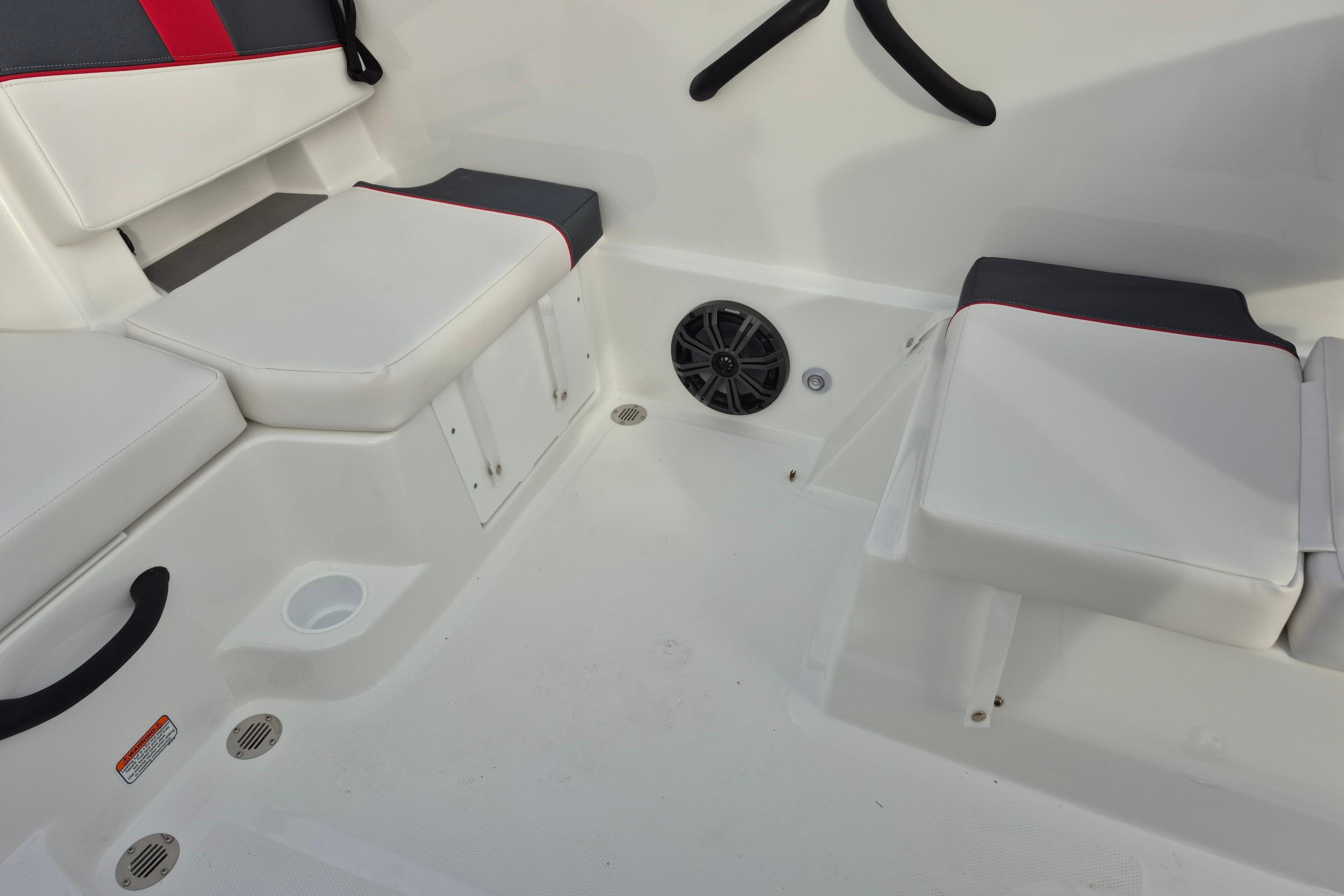 The aft swim platform with a 4-step telescoping boarding ladder makes it easy to jump in and out of the water. Find your favorite seat in the 3-across midship bench, dual forward lounges, or aft sun pad. The port bow backrest can be reversed for forward or aft seating and its cushion can even be flipped up so passengers don't step on the upholstery as they board. Add the optional bimini top to create the perfect lake-day boat your friends and family will love!
