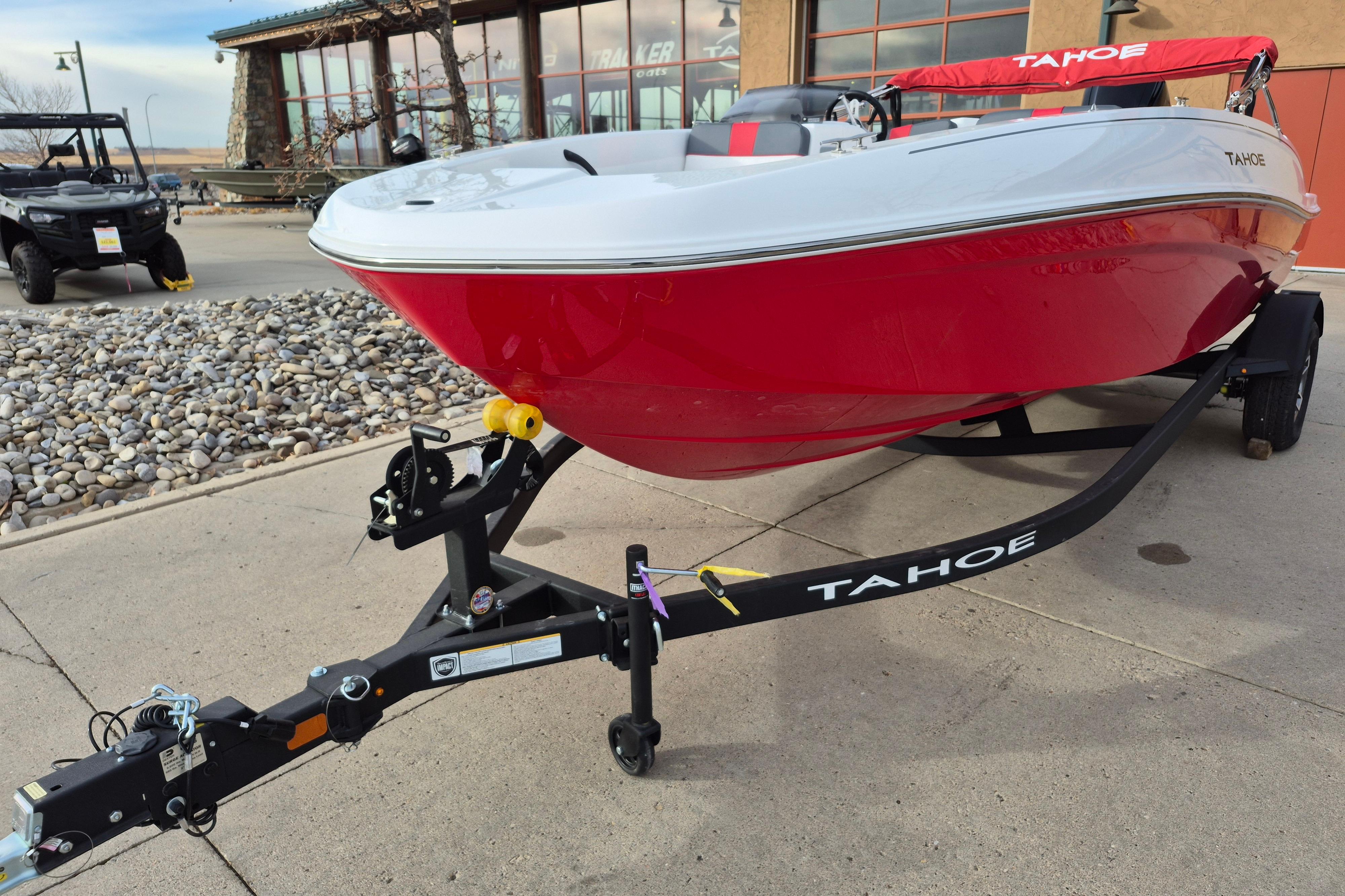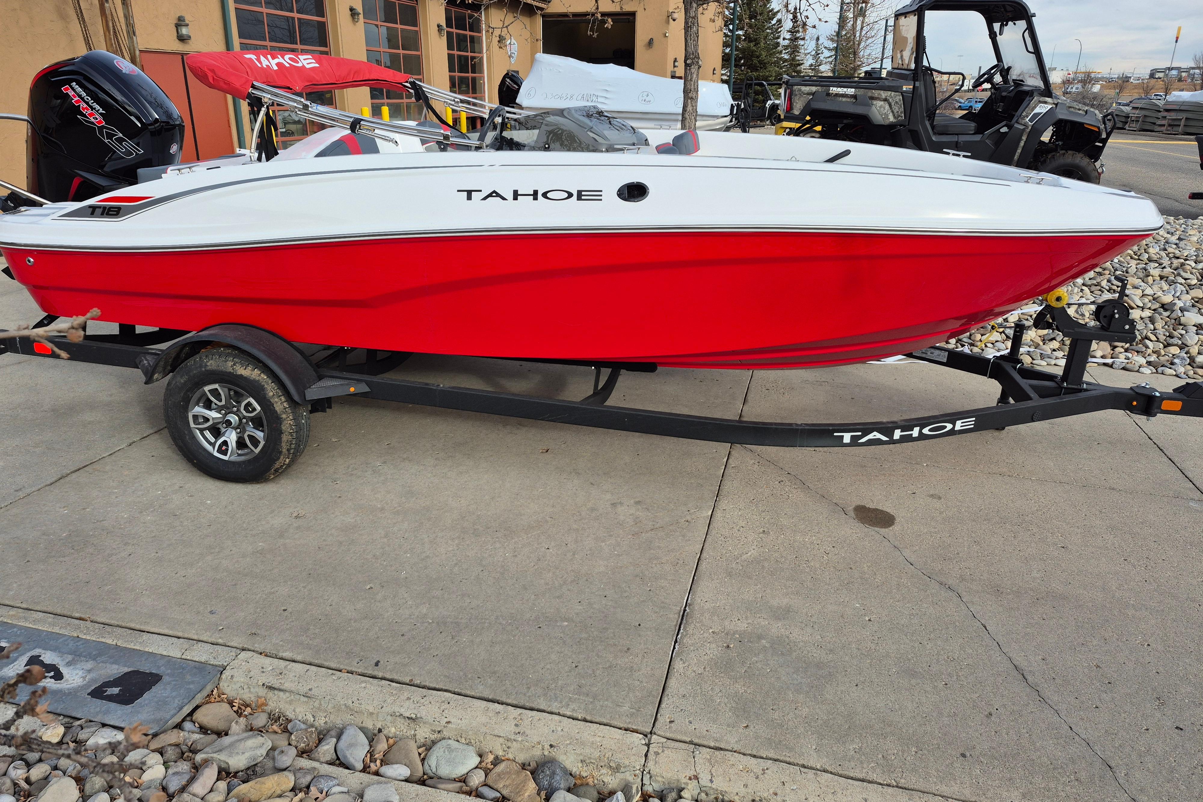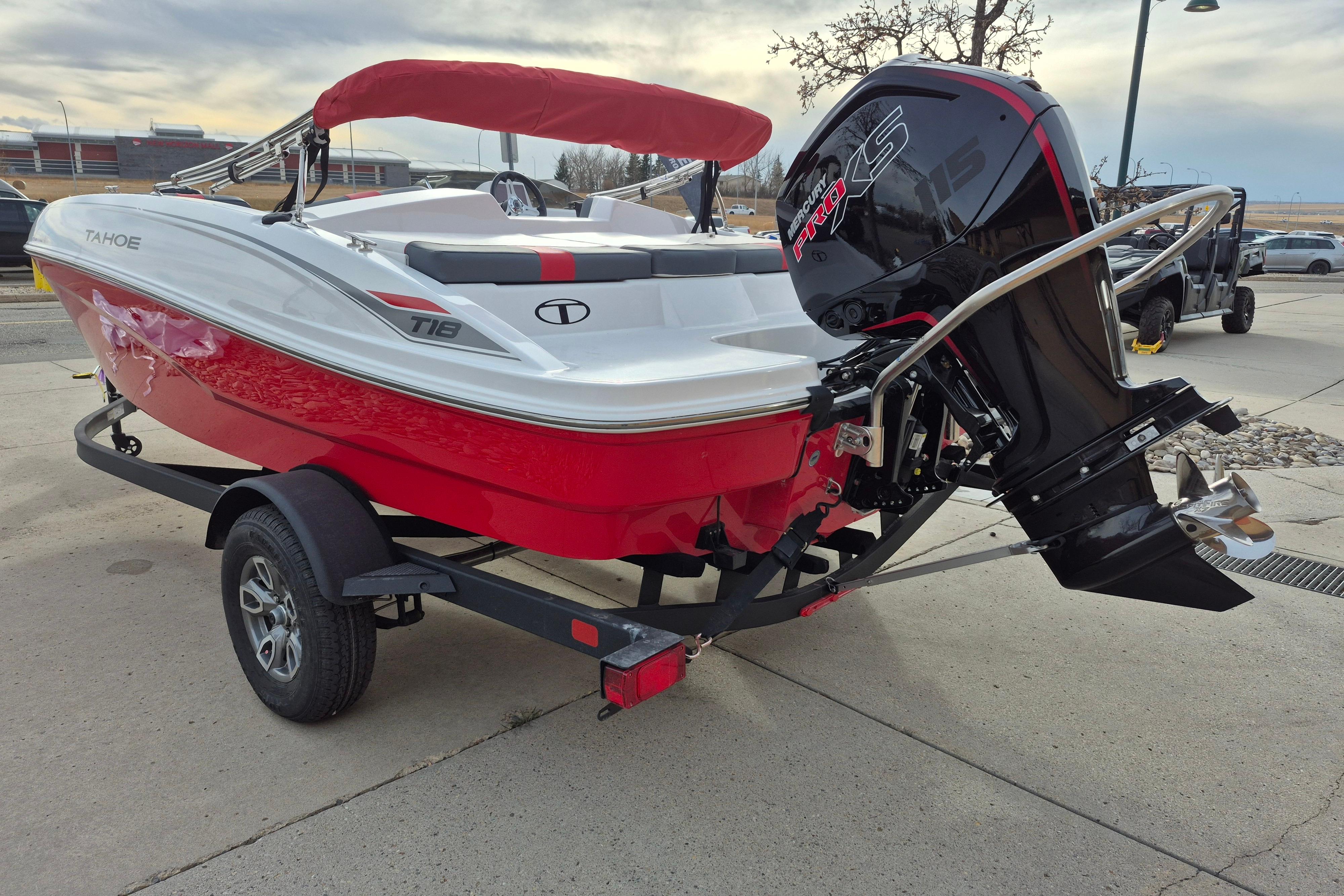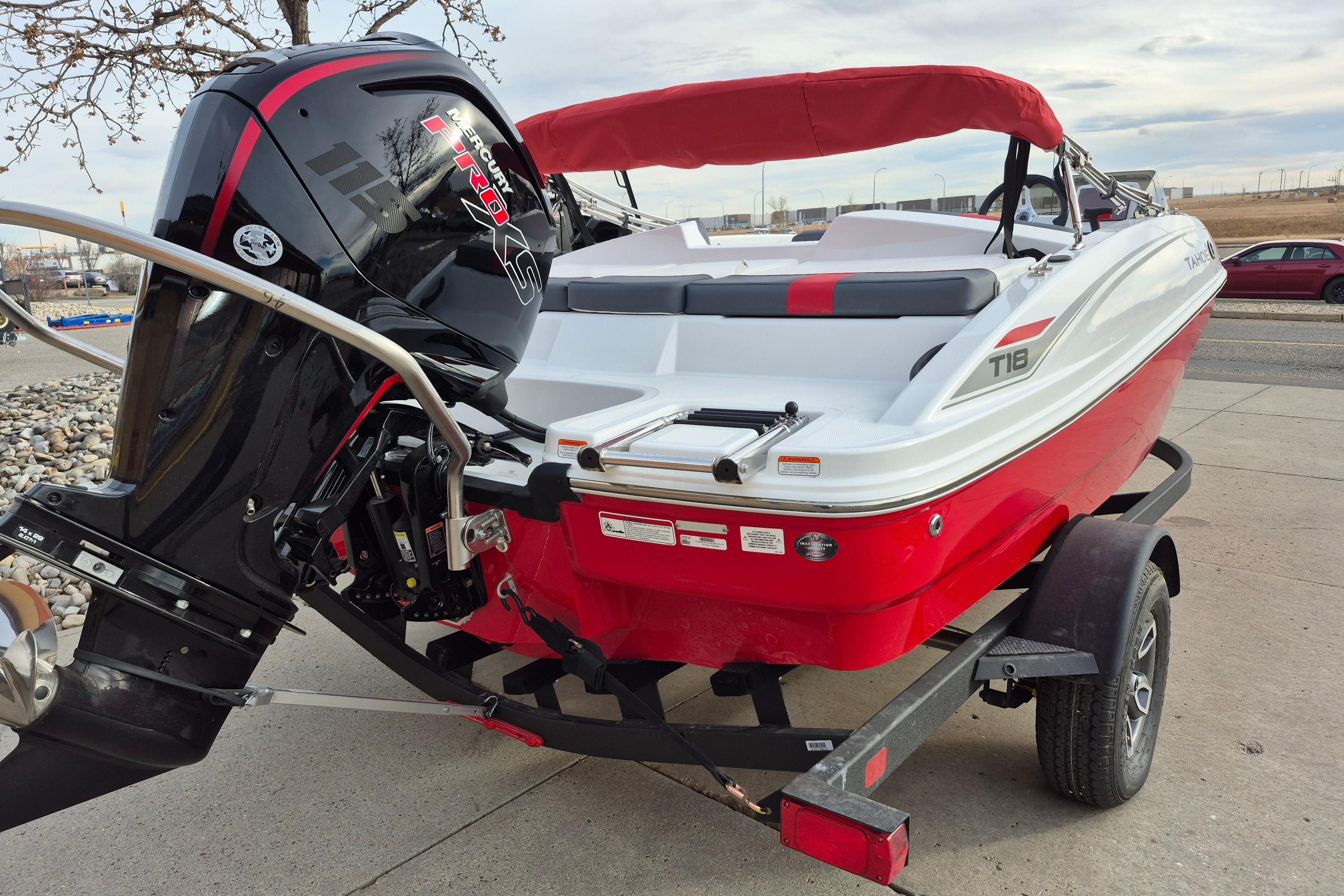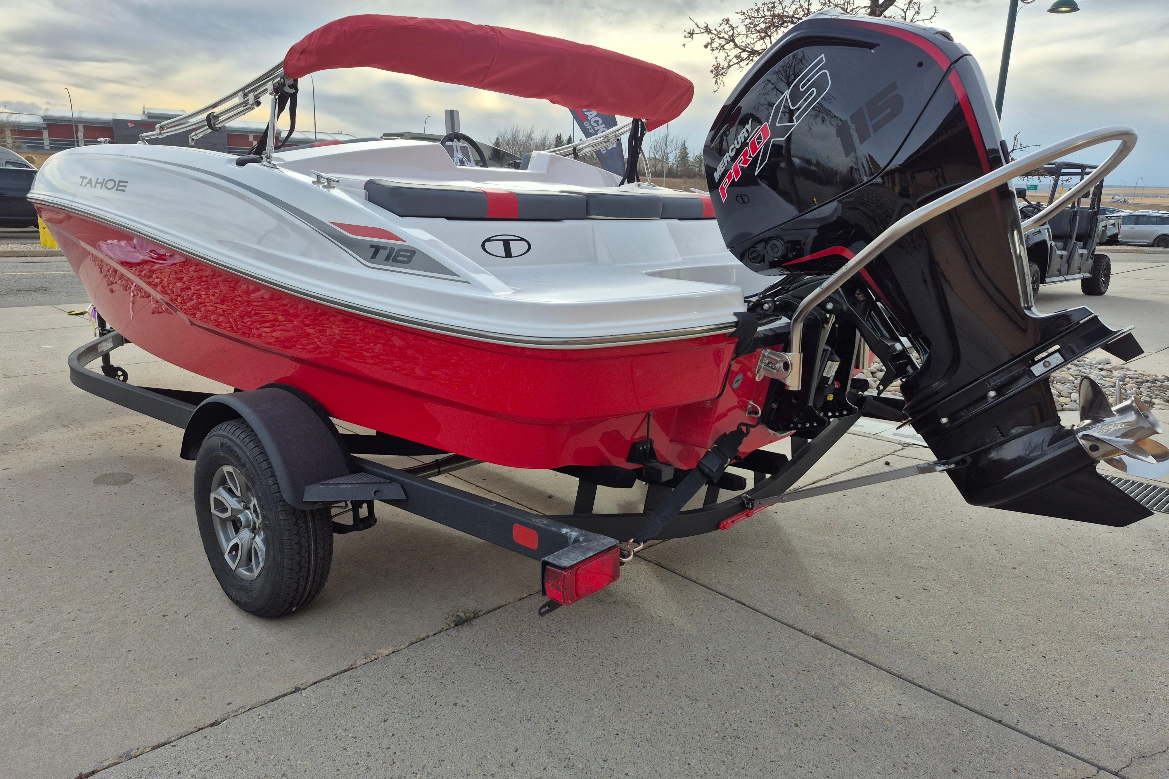 The 2026 TAHOE® T18 comes standard with a 90hp Mercury® ELPT FourStroke outboard motor and has a recommended maximum 115hp rating. This model is packaged with a trailer.
