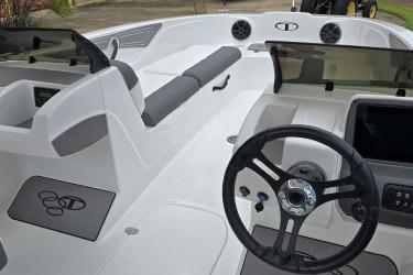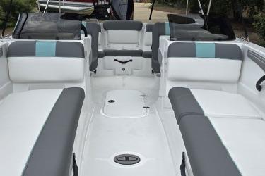 Take your places in the luxurious dual forward lounges, dual midship bucket seats, and the aft 3-across bench. You’ll find space for your gear and supplies under the seats and sun-pad cushions, consoles, and the in-floor storage compartment. When you’ve found a cove you want to explore, the anchor locker, dual aft swim platforms, and telescoping ladder make diving into the waters and getting back into the boat easy.