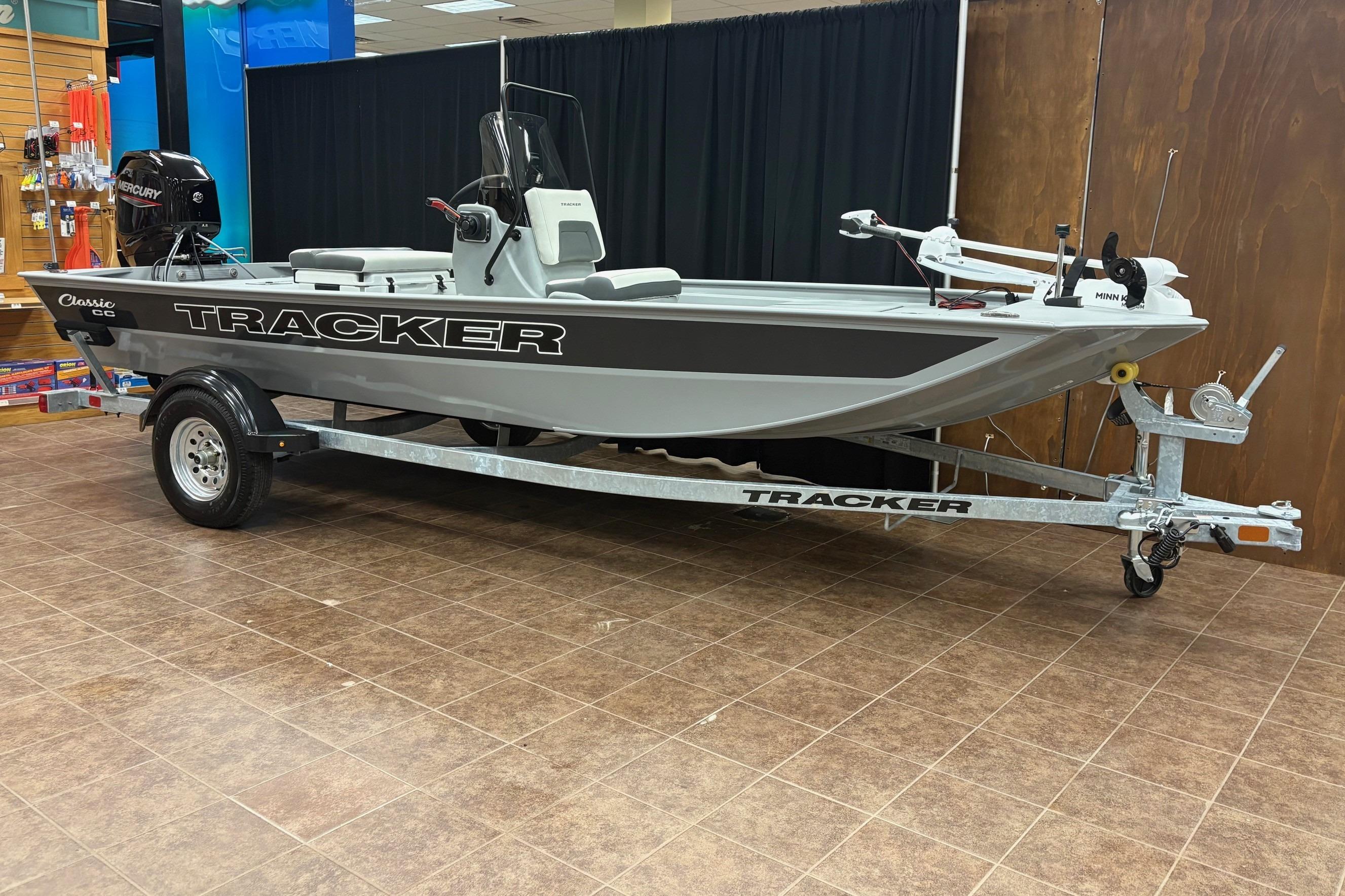 The TRACKER® Classic CC is the newest edition to the historical Classic lineup. Featuring 15-gal aerated livewell ensuring your catch stays fresh. Its molded one-piece construction with rounded corners allows for easy cleanup and added protection for your catch. The Minn Kota® Riptide® Maxxum® 12V trolling motor delivers 55 lbs. of thrust with a 52" shaft, providing reliable control on the water. The one-piece rotomolded console includes a tinted windscreen, drink holder, and 12V outlet, while the forward console seat offers padded comfort and storage. Five rod holders and a Garmin® STRIKER™ 4 fishfinder with GPS and CHIRP transducer enhance your fishing experience. Inside, there are two pedestal seat bases, elevated bow and aft casting decks with storage, a 94-qt. bow storage tub, and a padded 50-qt. cooler. Built with durable DIAMOND COAT™ powdercoat and all-welded aluminum construction, this boat offers unmatched strength and longevity. A custom-fit single-axle trailer completes this rugged, high-performance package.