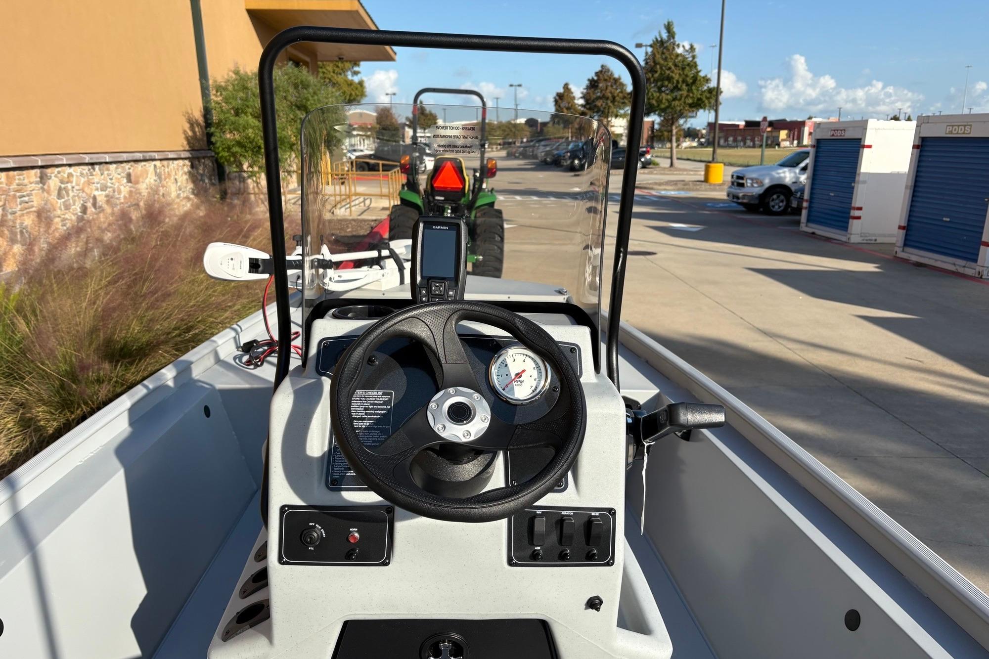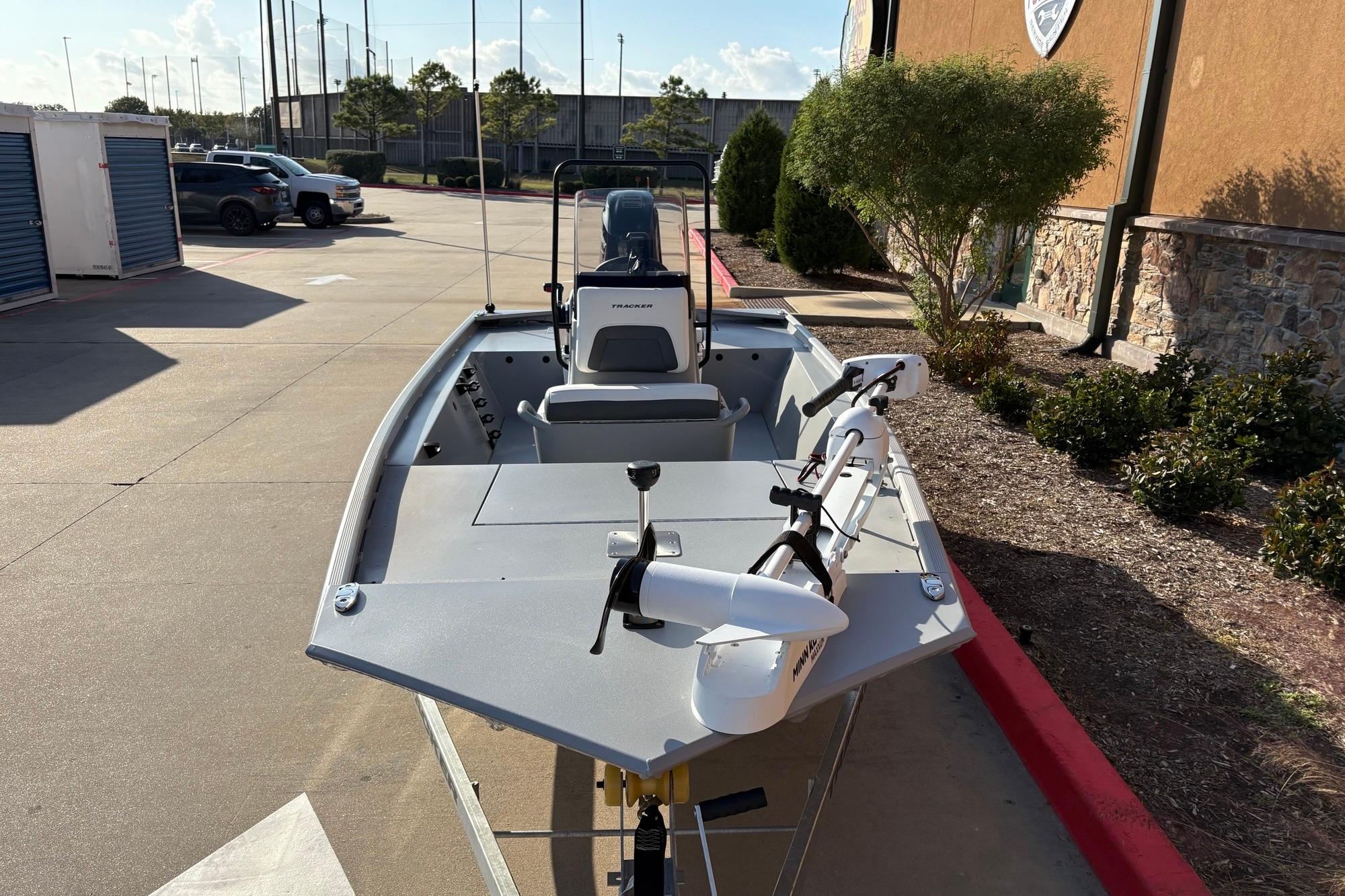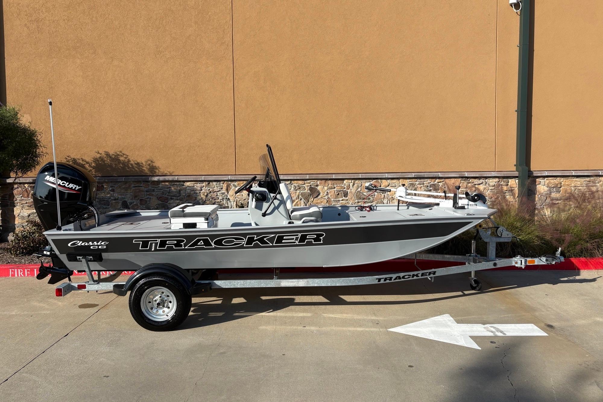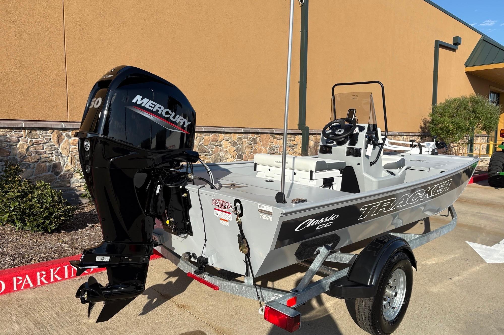 The TRACKER® Classic CC is the newest edition to the historical Classic lineup. Featuring 15-gal aerated livewell ensuring your catch stays fresh. Its molded one-piece construction with rounded corners allows for easy cleanup and added protection for your catch. The Minn Kota® Riptide® Maxxum® 12V trolling motor delivers 55 lbs. of thrust with a 52" shaft, providing reliable control on the water. The one-piece rotomolded console includes a tinted windscreen, drink holder, and 12V outlet, while the forward console seat offers padded comfort and storage. Five rod holders and a Garmin® STRIKER™ 4 fishfinder with GPS and CHIRP transducer enhance your fishing experience. Inside, there are two pedestal seat bases, elevated bow and aft casting decks with storage, a 94-qt. bow storage tub, and a padded 50-qt. cooler. Built with durable DIAMOND COAT™ powdercoat and all-welded aluminum construction, this boat offers unmatched strength and longevity. A custom-fit single-axle trailer completes this rugged, high-performance package.