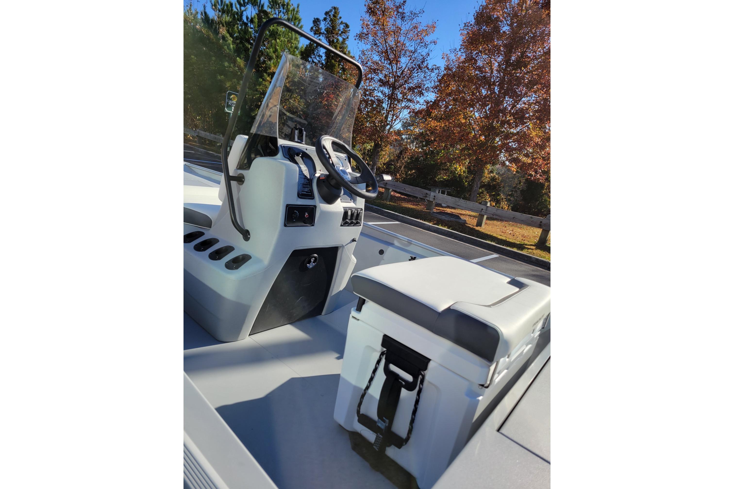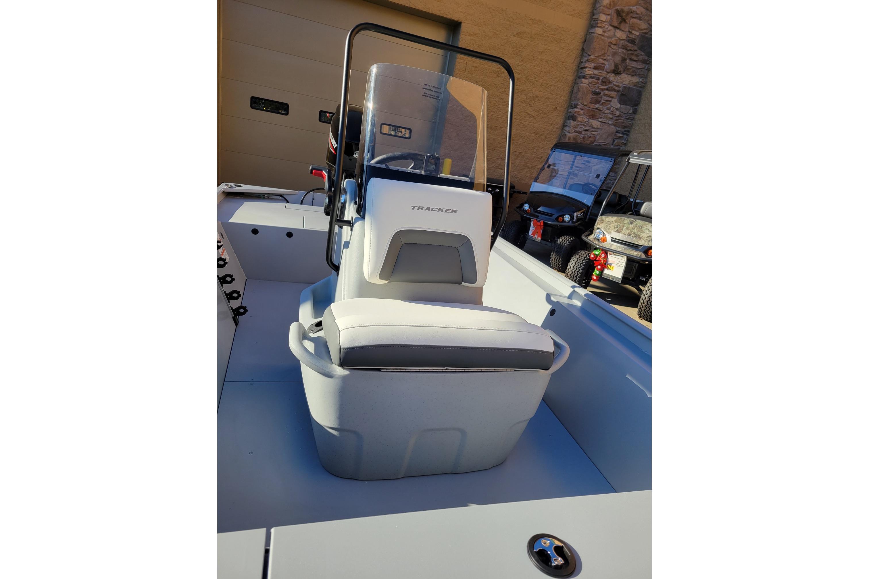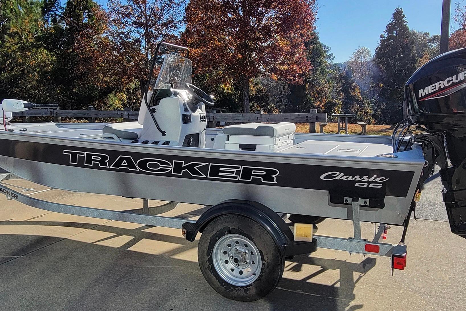 The TRACKER® Classic CC is the newest edition to the historical Classic lineup. Featuring 15-gal aerated livewell ensuring your catch stays fresh. Its molded one-piece construction with rounded corners allows for easy cleanup and added protection for your catch. The Minn Kota® Riptide® Maxxum® 12V trolling motor delivers 55 lbs. of thrust with a 52" shaft, providing reliable control on the water. The one-piece rotomolded console includes a tinted windscreen, drink holder, and 12V outlet, while the forward console seat offers padded comfort and storage. Five rod holders and a Garmin® STRIKER™ 4 fishfinder with GPS and CHIRP transducer enhance your fishing experience. Inside, there are two pedestal seat bases, elevated bow and aft casting decks with storage, a 94-qt. bow storage tub, and a padded 50-qt. cooler. Built with durable DIAMOND COAT™ powdercoat and all-welded aluminum construction, this boat offers unmatched strength and longevity. A custom-fit single-axle trailer completes this rugged, high-performance package.
