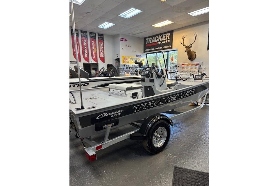 The TRACKER® Classic CC is the newest edition to the historical Classic lineup. Featuring 15-gal aerated livewell ensuring your catch stays fresh. Its molded one-piece construction with rounded corners allows for easy cleanup and added protection for your catch. The Minn Kota® Riptide® Maxxum® 12V trolling motor delivers 55 lbs. of thrust with a 52" shaft, providing reliable control on the water. The one-piece rotomolded console includes a tinted windscreen, drink holder, and 12V outlet, while the forward console seat offers padded comfort and storage. Five rod holders and a Garmin® STRIKER™ 4 fishfinder with GPS and CHIRP transducer enhance your fishing experience. Inside, there are two pedestal seat bases, elevated bow and aft casting decks with storage, a 94-qt. bow storage tub, and a padded 50-qt. cooler. Built with durable DIAMOND COAT™ powdercoat and all-welded aluminum construction, this boat offers unmatched strength and longevity. A custom-fit single-axle trailer completes this rugged, high-performance package.