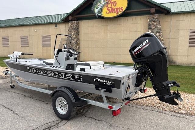 The TRACKER® Classic CC is the newest edition to the historical Classic lineup. Featuring 15-gal aerated livewell ensuring your catch stays fresh. Its molded one-piece construction with rounded corners allows for easy cleanup and added protection for your catch. The Minn Kota® Riptide® Maxxum® 12V trolling motor delivers 55 lbs. of thrust with a 52" shaft, providing reliable control on the water. The one-piece rotomolded console includes a tinted windscreen, drink holder, and 12V outlet, while the forward console seat offers padded comfort and storage. Five rod holders and a Garmin® STRIKER™ 4 fishfinder with GPS and CHIRP transducer enhance your fishing experience. Inside, there are two pedestal seat bases, elevated bow and aft casting decks with storage, a 94-qt. bow storage tub, and a padded 50-qt. cooler. Built with durable DIAMOND COAT™ powdercoat and all-welded aluminum construction, this boat offers unmatched strength and longevity. A custom-fit single-axle trailer completes this rugged, high-performance package.