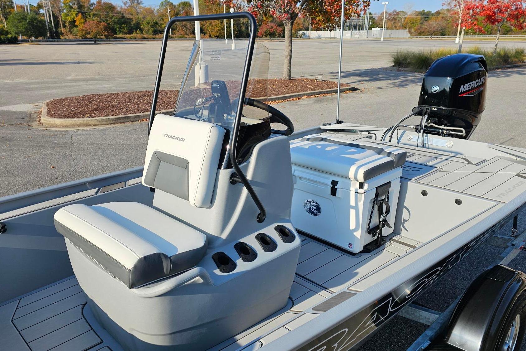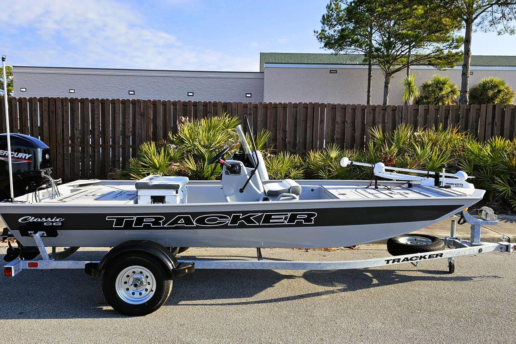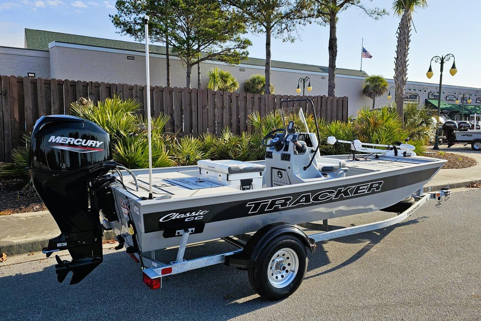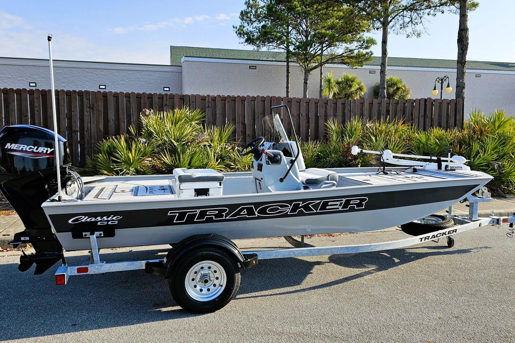 The TRACKER® Classic CC is the newest edition to the historical Classic lineup. Featuring 15-gal aerated livewell ensuring your catch stays fresh. Its molded one-piece construction with rounded corners allows for easy cleanup and added protection for your catch. The Minn Kota® Riptide® Maxxum® 12V trolling motor delivers 55 lbs. of thrust with a 52" shaft, providing reliable control on the water. The one-piece rotomolded console includes a tinted windscreen, drink holder, and 12V outlet, while the forward console seat offers padded comfort and storage. Five rod holders and a Garmin® STRIKER™ 4 fishfinder with GPS and CHIRP transducer enhance your fishing experience. Inside, there are two pedestal seat bases, elevated bow and aft casting decks with storage, a 94-qt. bow storage tub, and a padded 50-qt. cooler. Built with durable DIAMOND COAT™ powdercoat and all-welded aluminum construction, this boat offers unmatched strength and longevity. A custom-fit single-axle trailer completes this rugged, high-performance package.