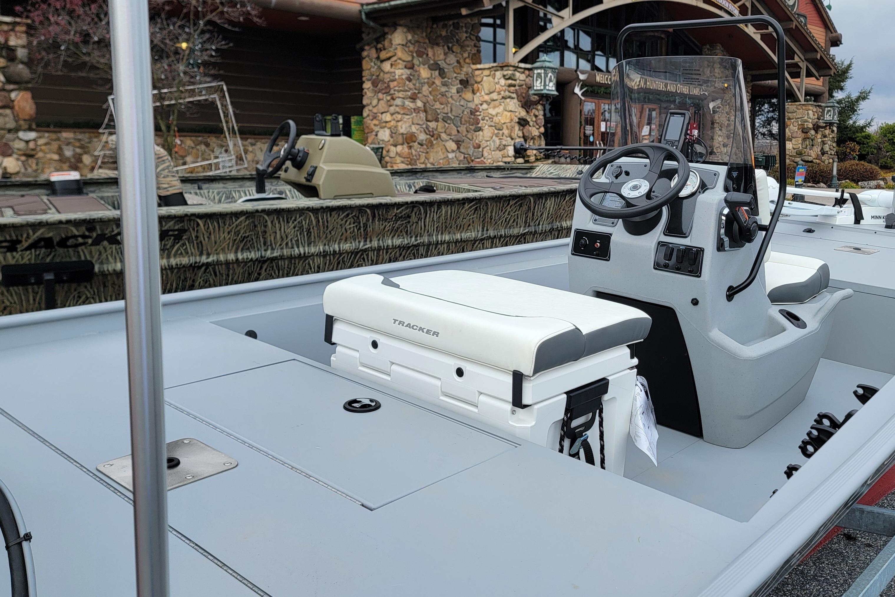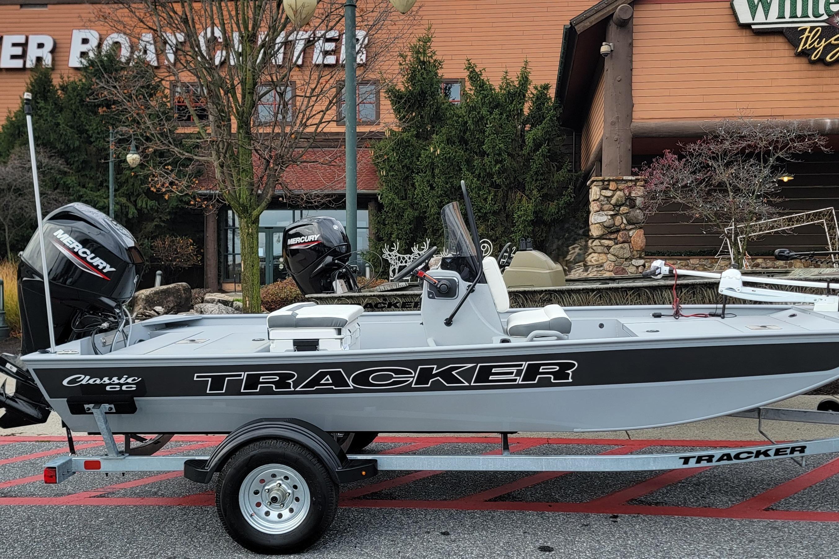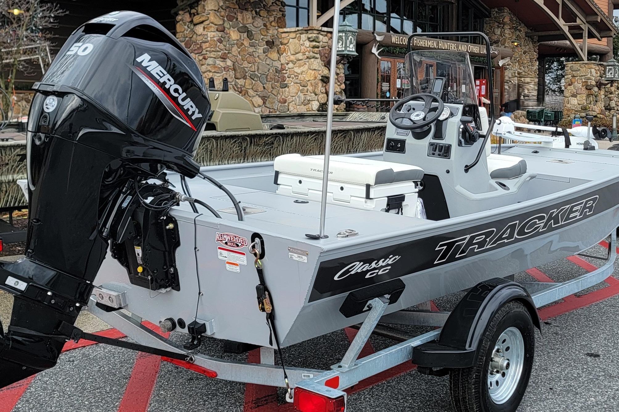 The TRACKER® Classic CC is the newest edition to the historical Classic lineup. Featuring 15-gal aerated livewell ensuring your catch stays fresh. Its molded one-piece construction with rounded corners allows for easy cleanup and added protection for your catch. The Minn Kota® Riptide® Maxxum® 12V trolling motor delivers 55 lbs. of thrust with a 52" shaft, providing reliable control on the water. The one-piece rotomolded console includes a tinted windscreen, drink holder, and 12V outlet, while the forward console seat offers padded comfort and storage. Five rod holders and a Garmin® STRIKER™ 4 fishfinder with GPS and CHIRP transducer enhance your fishing experience. Inside, there are two pedestal seat bases, elevated bow and aft casting decks with storage, a 94-qt. bow storage tub, and a padded 50-qt. cooler. Built with durable DIAMOND COAT™ powdercoat and all-welded aluminum construction, this boat offers unmatched strength and longevity. A custom-fit single-axle trailer completes this rugged, high-performance package.