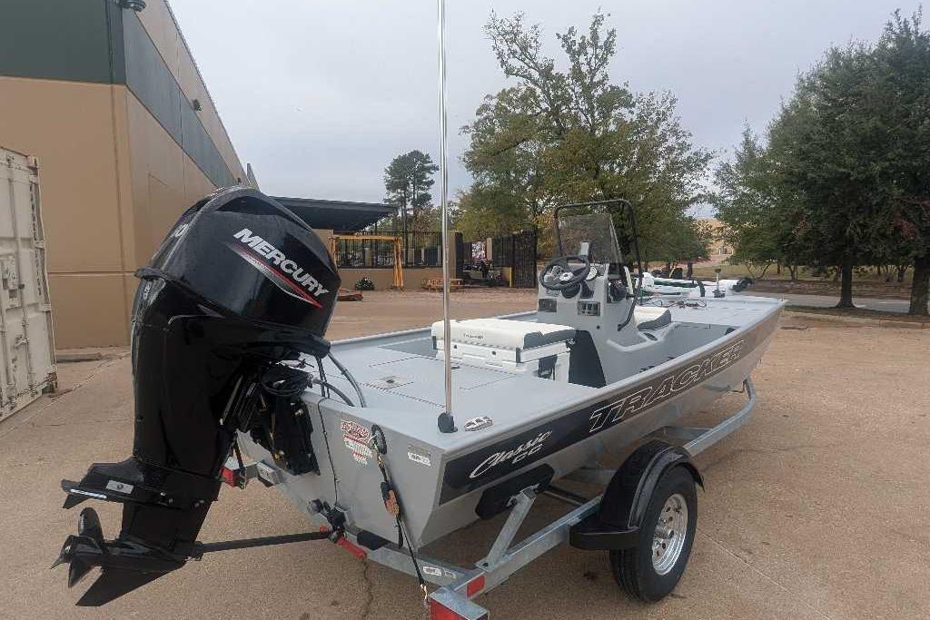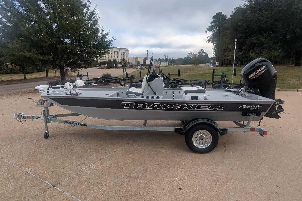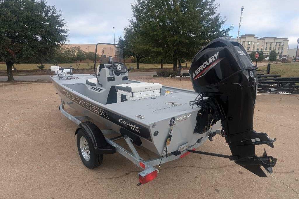 The TRACKER® Classic CC is the newest edition to the historical Classic lineup. Featuring 15-gal aerated livewell ensuring your catch stays fresh. Its molded one-piece construction with rounded corners allows for easy cleanup and added protection for your catch. The Minn Kota® Riptide® Maxxum® 12V trolling motor delivers 55 lbs. of thrust with a 52" shaft, providing reliable control on the water. The one-piece rotomolded console includes a tinted windscreen, drink holder, and 12V outlet, while the forward console seat offers padded comfort and storage. Five rod holders and a Garmin® STRIKER™ 4 fishfinder with GPS and CHIRP transducer enhance your fishing experience. Inside, there are two pedestal seat bases, elevated bow and aft casting decks with storage, a 94-qt. bow storage tub, and a padded 50-qt. cooler. Built with durable DIAMOND COAT™ powdercoat and all-welded aluminum construction, this boat offers unmatched strength and longevity. A custom-fit single-axle trailer completes this rugged, high-performance package.