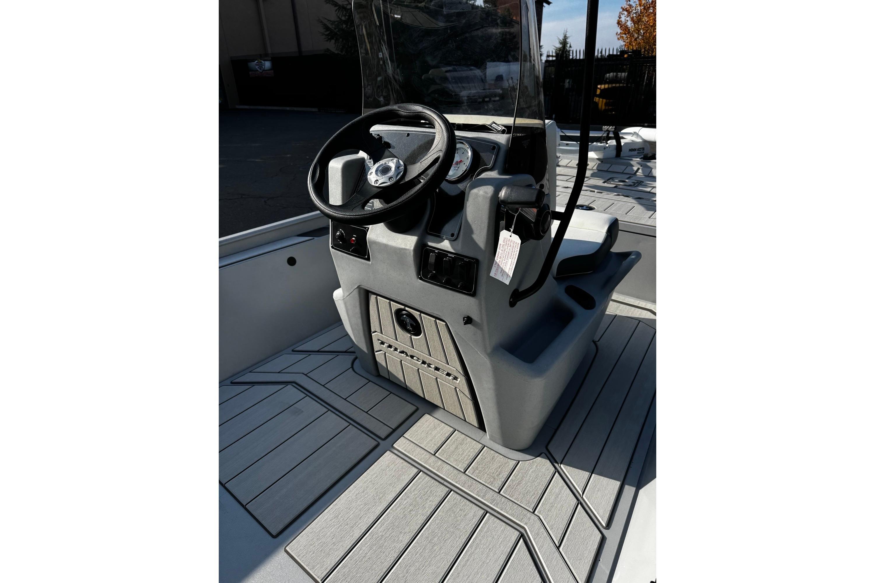The TRACKER® Classic CC is the newest edition to the historical Classic lineup. Featuring 15-gal aerated livewell ensuring your catch stays fresh. Its molded one-piece construction with rounded corners allows for easy cleanup and added protection for your catch. The Minn Kota® Riptide® Maxxum® 12V trolling motor delivers 55 lbs. of thrust with a 52" shaft, providing reliable control on the water. The one-piece rotomolded console includes a tinted windscreen, drink holder, and 12V outlet, while the forward console seat offers padded comfort and storage. Five rod holders and a Garmin® STRIKER™ 4 fishfinder with GPS and CHIRP transducer enhance your fishing experience. Inside, there are two pedestal seat bases, elevated bow and aft casting decks with storage, a 94-qt. bow storage tub, and a padded 50-qt. cooler. Built with durable DIAMOND COAT™ powdercoat and all-welded aluminum construction, this boat offers unmatched strength and longevity. A custom-fit single-axle trailer completes this rugged, high-performance package.