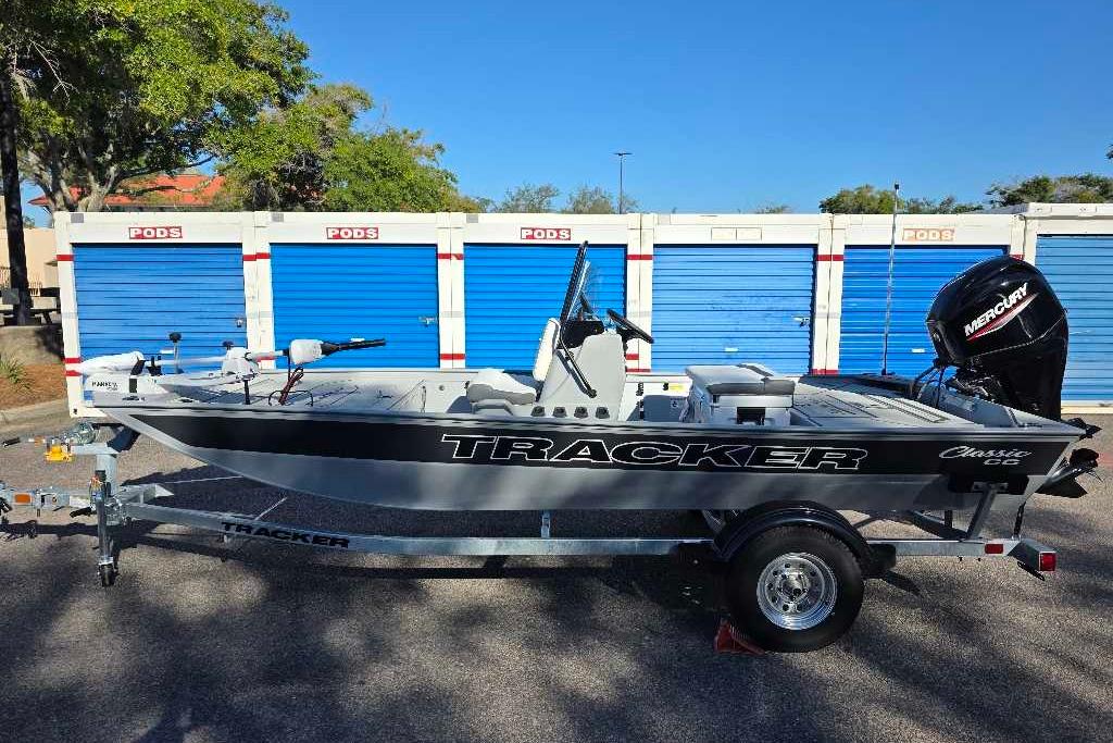 The TRACKER® Classic CC is the newest edition to the historical Classic lineup. Featuring 15-gal aerated livewell ensuring your catch stays fresh. Its molded one-piece construction with rounded corners allows for easy cleanup and added protection for your catch. The Minn Kota® Riptide® Maxxum® 12V trolling motor delivers 55 lbs. of thrust with a 52" shaft, providing reliable control on the water. The one-piece rotomolded console includes a tinted windscreen, drink holder, and 12V outlet, while the forward console seat offers padded comfort and storage. Five rod holders and a Garmin® STRIKER™ 4 fishfinder with GPS and CHIRP transducer enhance your fishing experience. Inside, there are two pedestal seat bases, elevated bow and aft casting decks with storage, a 94-qt. bow storage tub, and a padded 50-qt. cooler. Built with durable DIAMOND COAT™ powdercoat and all-welded aluminum construction, this boat offers unmatched strength and longevity. A custom-fit single-axle trailer completes this rugged, high-performance package.