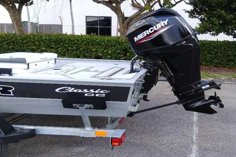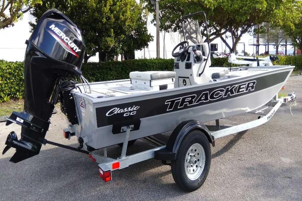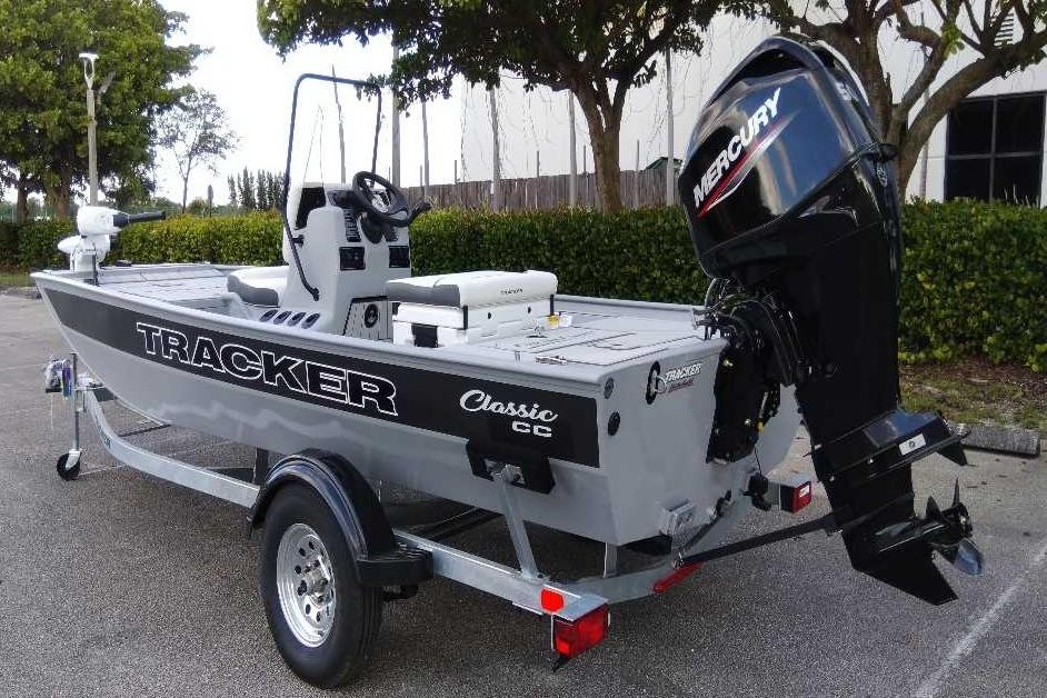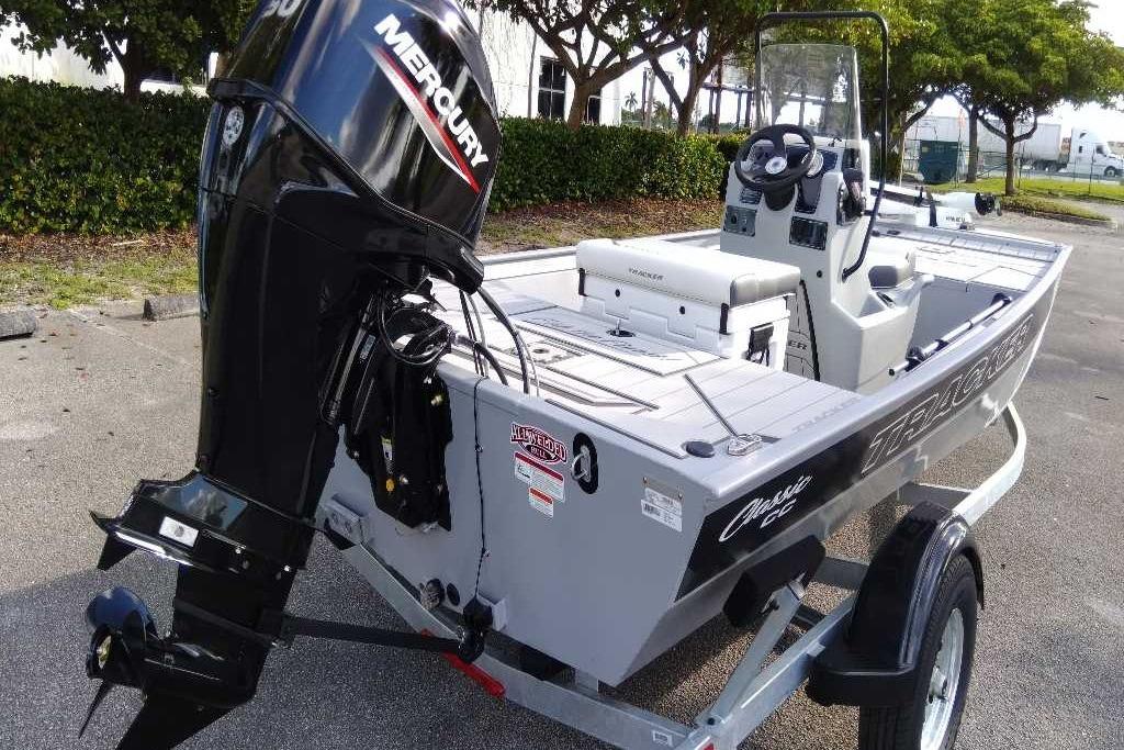 The TRACKER® Classic CC is the newest edition to the historical Classic lineup. Featuring 15-gal aerated livewell ensuring your catch stays fresh. Its molded one-piece construction with rounded corners allows for easy cleanup and added protection for your catch. The Minn Kota® Riptide® Maxxum® 12V trolling motor delivers 55 lbs. of thrust with a 52" shaft, providing reliable control on the water. The one-piece rotomolded console includes a tinted windscreen, drink holder, and 12V outlet, while the forward console seat offers padded comfort and storage. Five rod holders and a Garmin® STRIKER™ 4 fishfinder with GPS and CHIRP transducer enhance your fishing experience. Inside, there are two pedestal seat bases, elevated bow and aft casting decks with storage, a 94-qt. bow storage tub, and a padded 50-qt. cooler. Built with durable DIAMOND COAT™ powdercoat and all-welded aluminum construction, this boat offers unmatched strength and longevity. A custom-fit single-axle trailer completes this rugged, high-performance package.