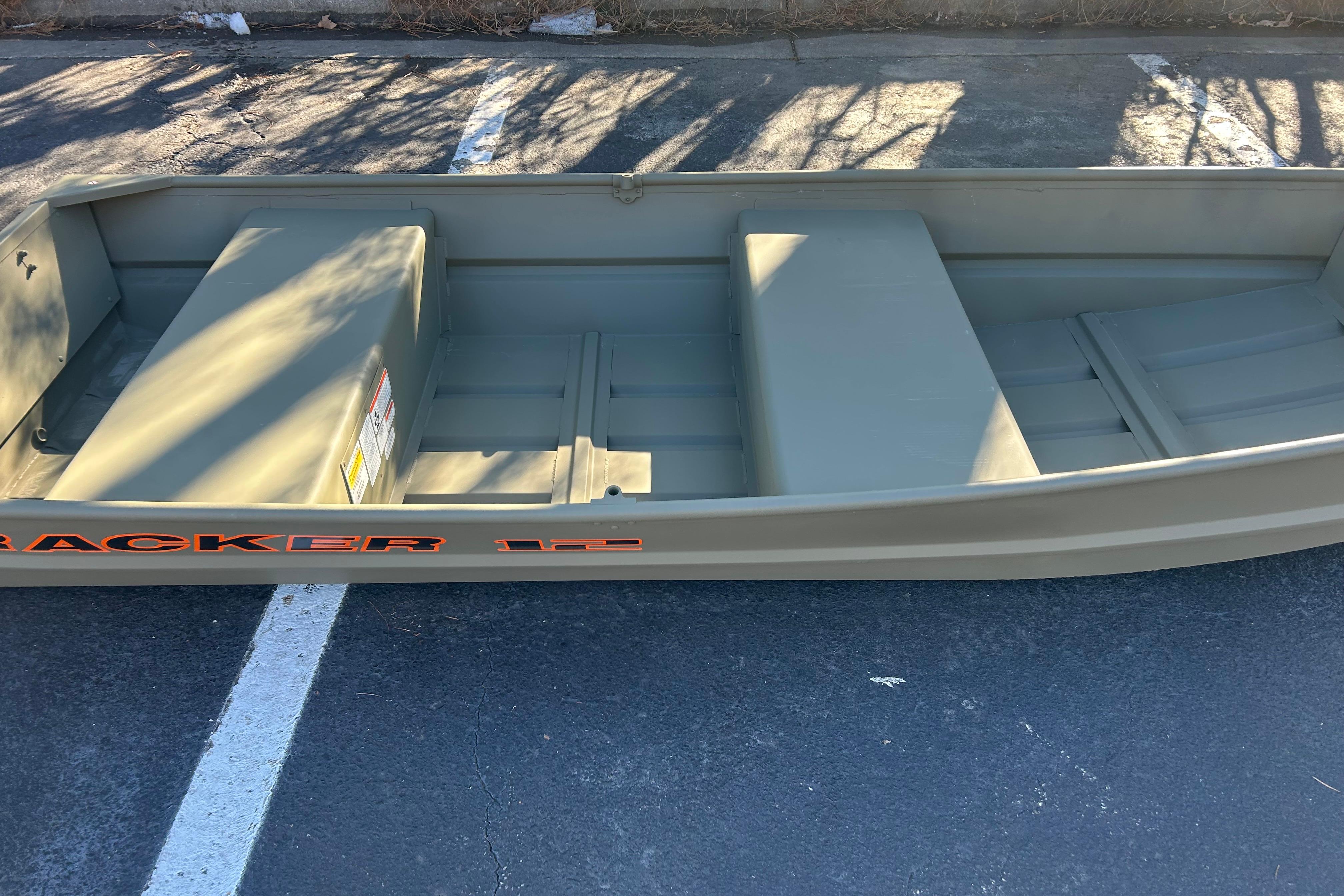 Step aboard the TRACKER GRIZZLY 12 jon boat, with the standout feature of the TRACKER GRIZZLY 12 jon boat lies in its all-welded hull design, setting it apart with unmatched durability and structural integrity. Unlike boats with riveted hulls that may develop leaks or weak points over time, the all-welded construction of the GRIZZLY 12 forms a solid and seamless foundation. This sturdy design not only prolongs the boat's lifespan but also enhances its performance on the water, ensuring a smooth and stable ride across diverse conditions.