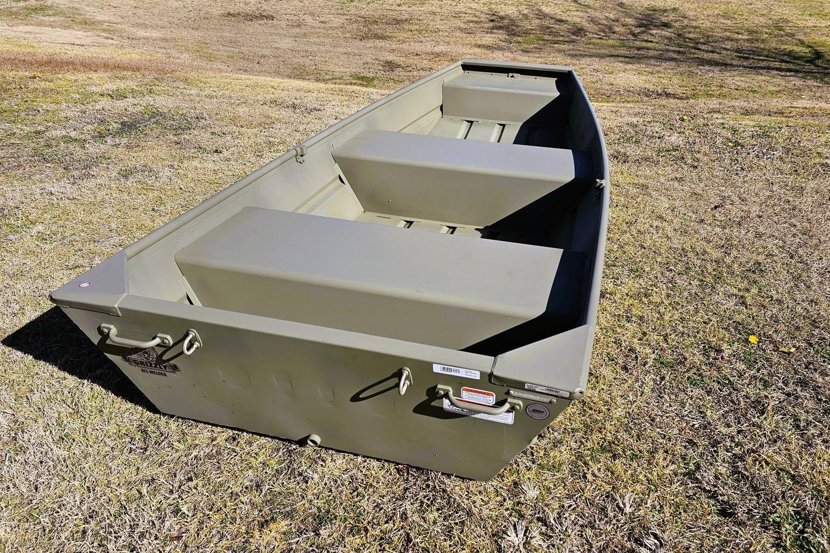 Step aboard the TRACKER GRIZZLY 12 jon boat, with the standout feature of the TRACKER GRIZZLY 12 jon boat lies in its all-welded hull design, setting it apart with unmatched durability and structural integrity. Unlike boats with riveted hulls that may develop leaks or weak points over time, the all-welded construction of the GRIZZLY 12 forms a solid and seamless foundation. This sturdy design not only prolongs the boat's lifespan but also enhances its performance on the water, ensuring a smooth and stable ride across diverse conditions.