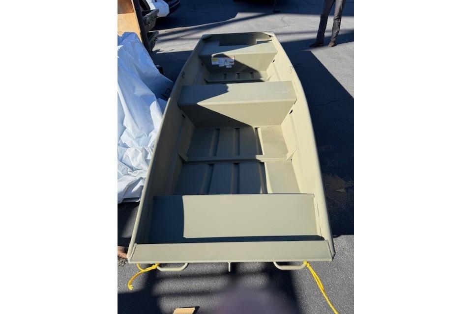 Introducing the TRACKER GRIZZLY 14 jon boat, an agile aluminum vessel crafted to comfortably host three anglers. Emphasizing the all-welded hull design, the TRACKER GRIZZLY 14 sets a new standard in durability and performance. Unlike riveted hulls that may develop vulnerabilities over time, the all-welded construction of the GRIZZLY 14 ensures a solid and seamless framework, enhancing longevity and reliability. Whether tackling challenging waters or cruising leisurely, the all-welded hull design guarantees a secure and enjoyable boating experience, making the GRIZZLY 14 a top choice for adventurous anglers. Reinforced with aft foam boxes and corner braces at the transom, this boat is engineered to thrive in rugged terrains, whether embarking on a dusty trail to your secluded fishing haven or enjoying a serene day on the water. The GRIZZLY 14 features center and aft bench seats, complemented by a spacious bow platform, offering ample space for gear storage and ensuring a cozy fishing experience for all occupants.