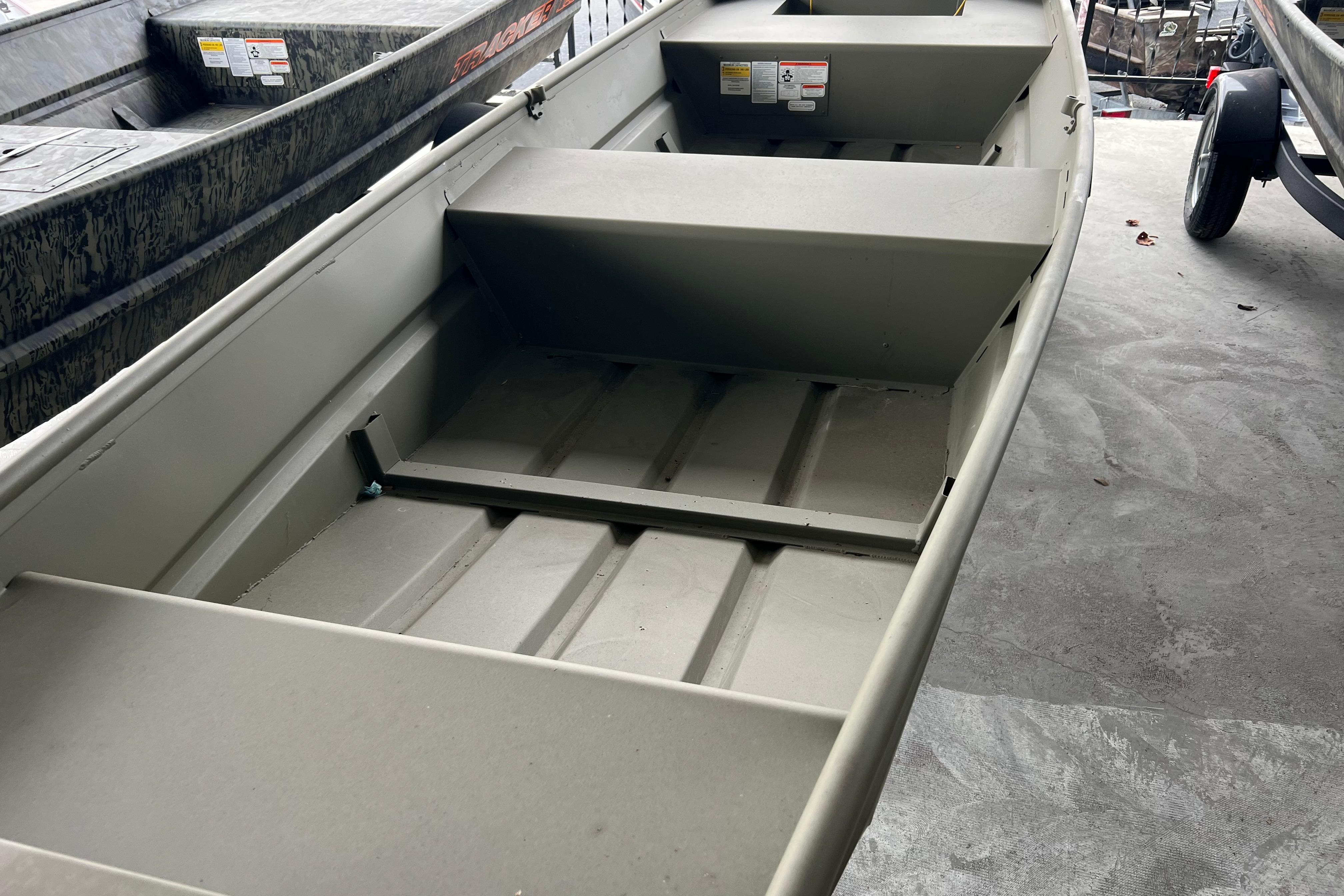 Introducing the TRACKER GRIZZLY 14 jon boat, an agile aluminum vessel crafted to comfortably host three anglers. Emphasizing the all-welded hull design, the TRACKER GRIZZLY 14 sets a new standard in durability and performance. Unlike riveted hulls that may develop vulnerabilities over time, the all-welded construction of the GRIZZLY 14 ensures a solid and seamless framework, enhancing longevity and reliability. Whether tackling challenging waters or cruising leisurely, the all-welded hull design guarantees a secure and enjoyable boating experience, making the GRIZZLY 14 a top choice for adventurous anglers. Reinforced with aft foam boxes and corner braces at the transom, this boat is engineered to thrive in rugged terrains, whether embarking on a dusty trail to your secluded fishing haven or enjoying a serene day on the water. The GRIZZLY 14 features center and aft bench seats, complemented by a spacious bow platform, offering ample space for gear storage and ensuring a cozy fishing experience for all occupants.