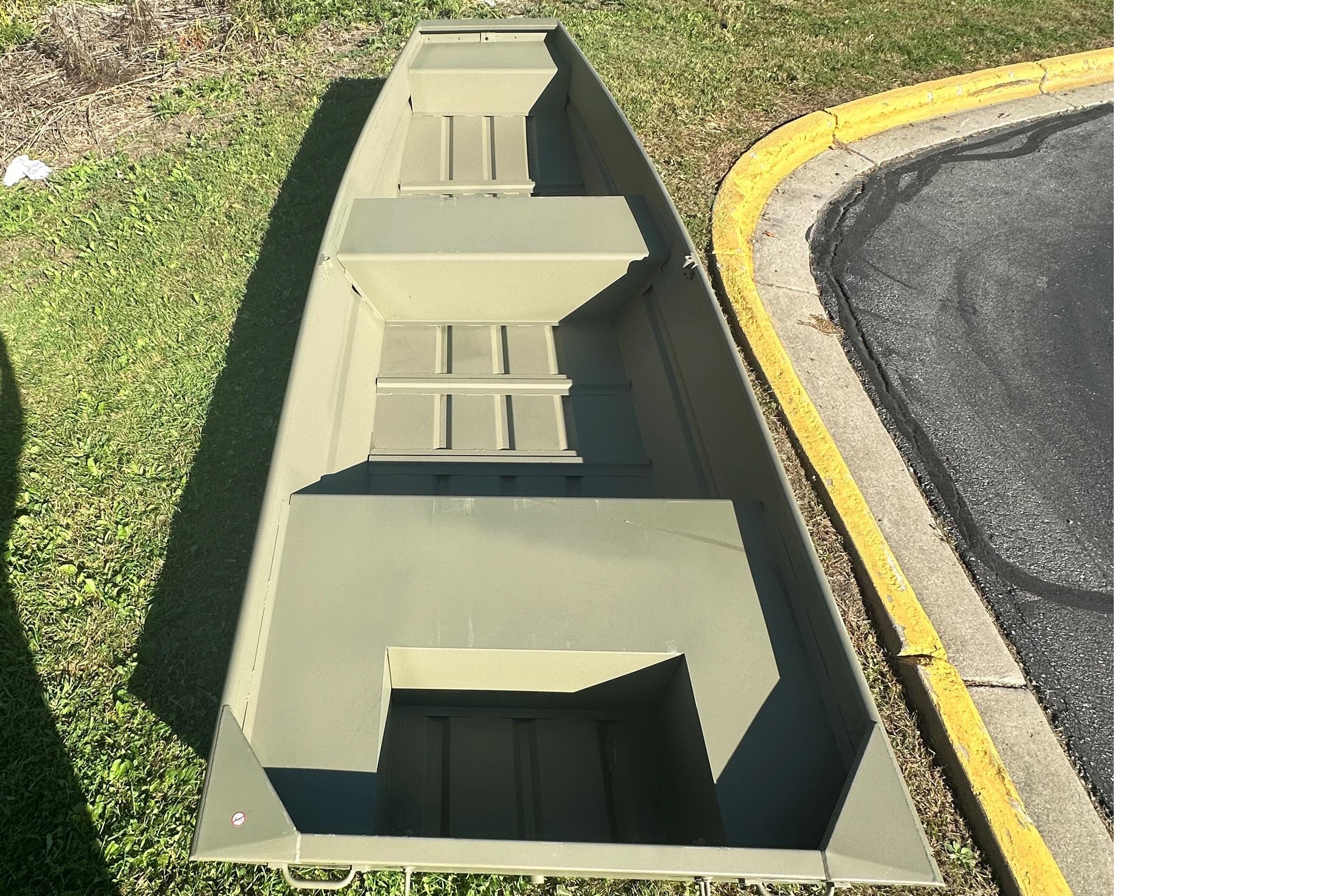 Introducing the TRACKER GRIZZLY 14 jon boat, an agile aluminum vessel crafted to comfortably host three anglers. Emphasizing the all-welded hull design, the TRACKER GRIZZLY 14 sets a new standard in durability and performance. Unlike riveted hulls that may develop vulnerabilities over time, the all-welded construction of the GRIZZLY 14 ensures a solid and seamless framework, enhancing longevity and reliability. Whether tackling challenging waters or cruising leisurely, the all-welded hull design guarantees a secure and enjoyable boating experience, making the GRIZZLY 14 a top choice for adventurous anglers. Reinforced with aft foam boxes and corner braces at the transom, this boat is engineered to thrive in rugged terrains, whether embarking on a dusty trail to your secluded fishing haven or enjoying a serene day on the water. The GRIZZLY 14 features center and aft bench seats, complemented by a spacious bow platform, offering ample space for gear storage and ensuring a cozy fishing experience for all occupants.